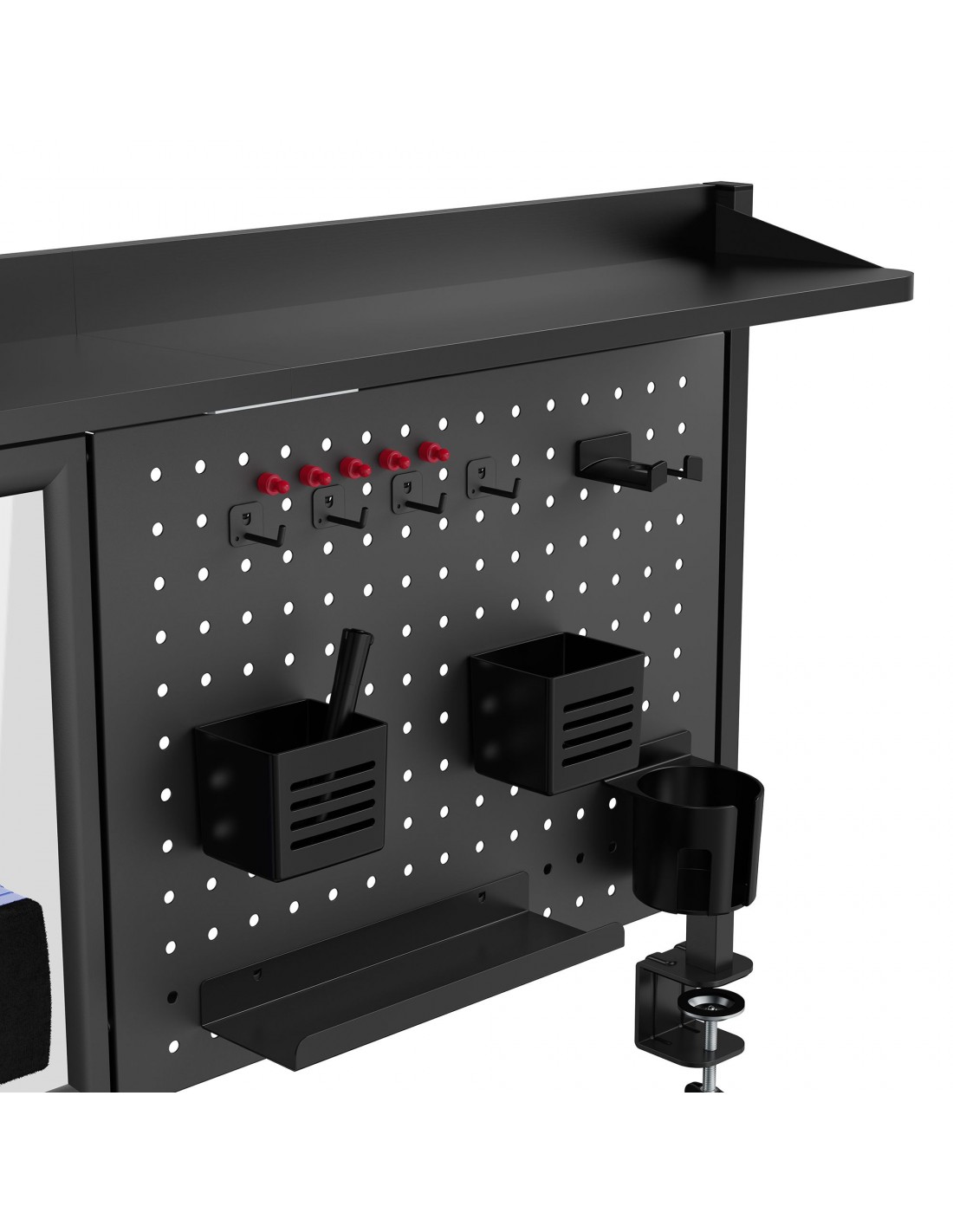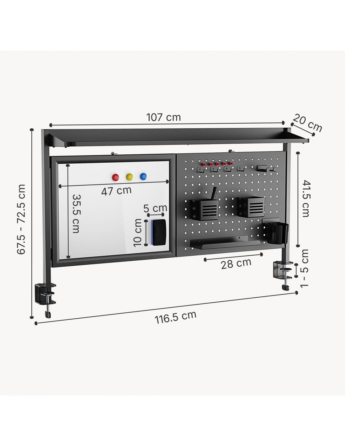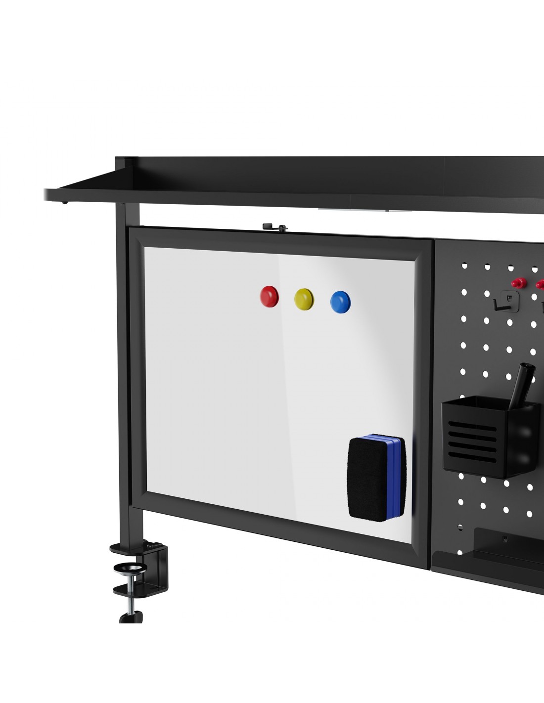 Organiser til skrivebord, udført i et design af sortlakeret stål. Organiseren måler 67,5 - 72,5 cm i højden og 116,5 x 20 cm i bredde og dybde. Til organiseren medfølger tilbehør som vist på produktbillederne.