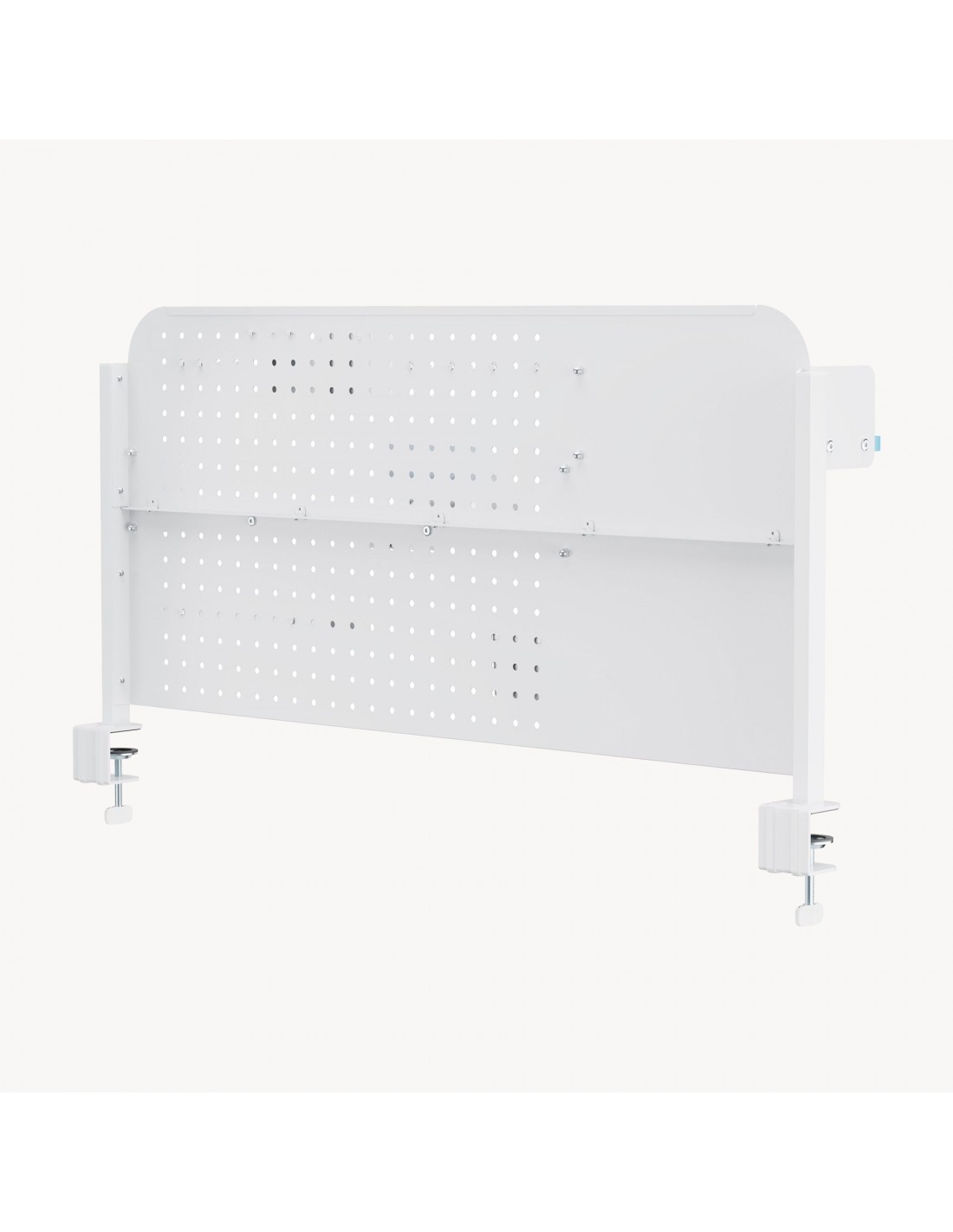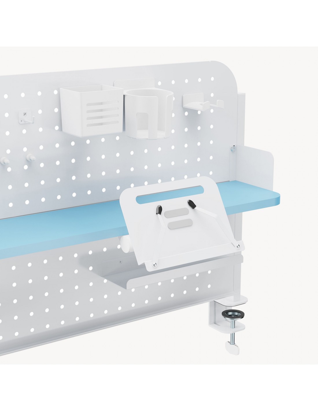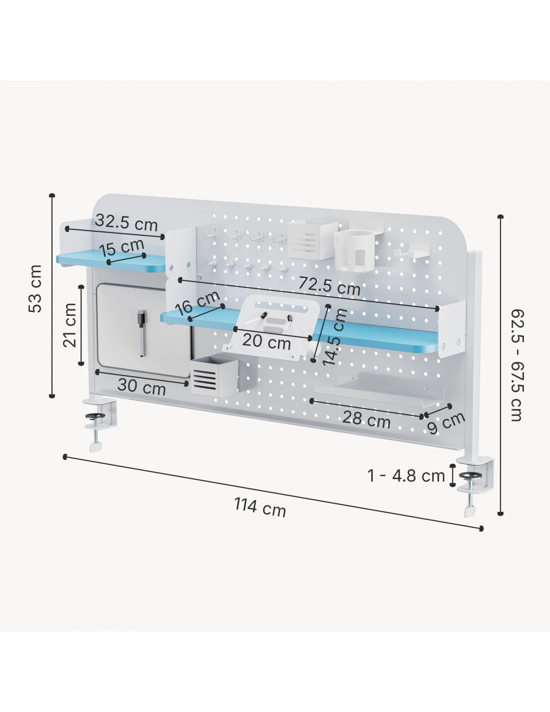 Organiser til skrivebord, udført i et design af hvidlakeret stål og blå møbelplade. Organiseren måler 62,5 - 67,5 cm i højden og 114 x 16 cm i bredde og dybde. Til organiseren medfølger tilbehør som vist på produktbillederne.