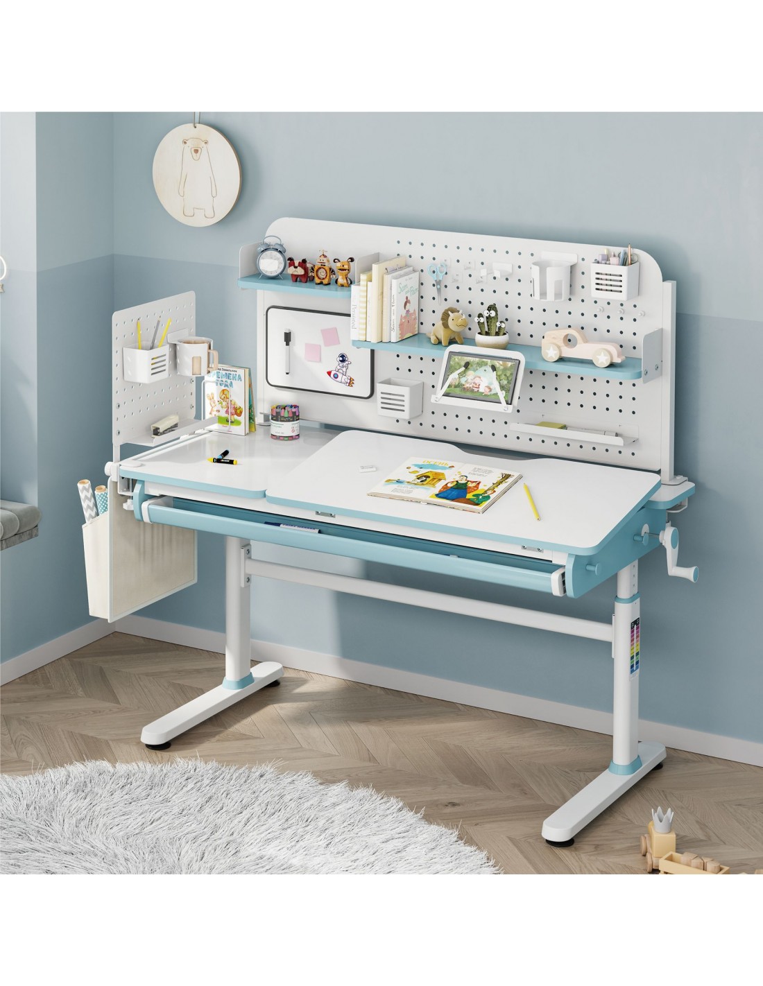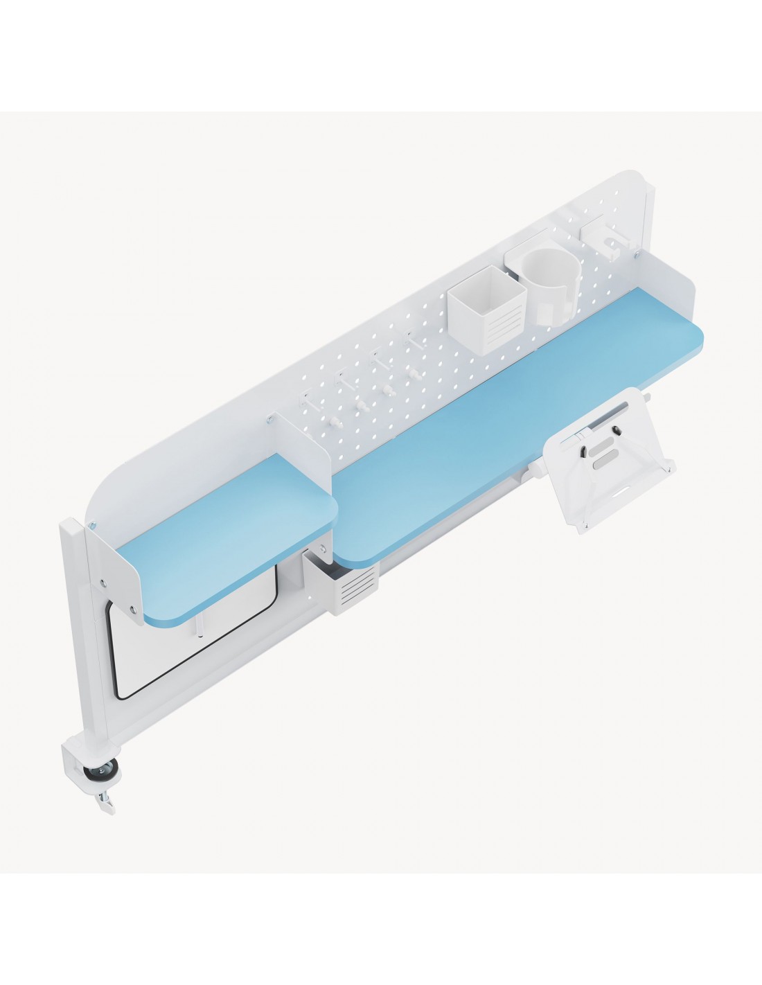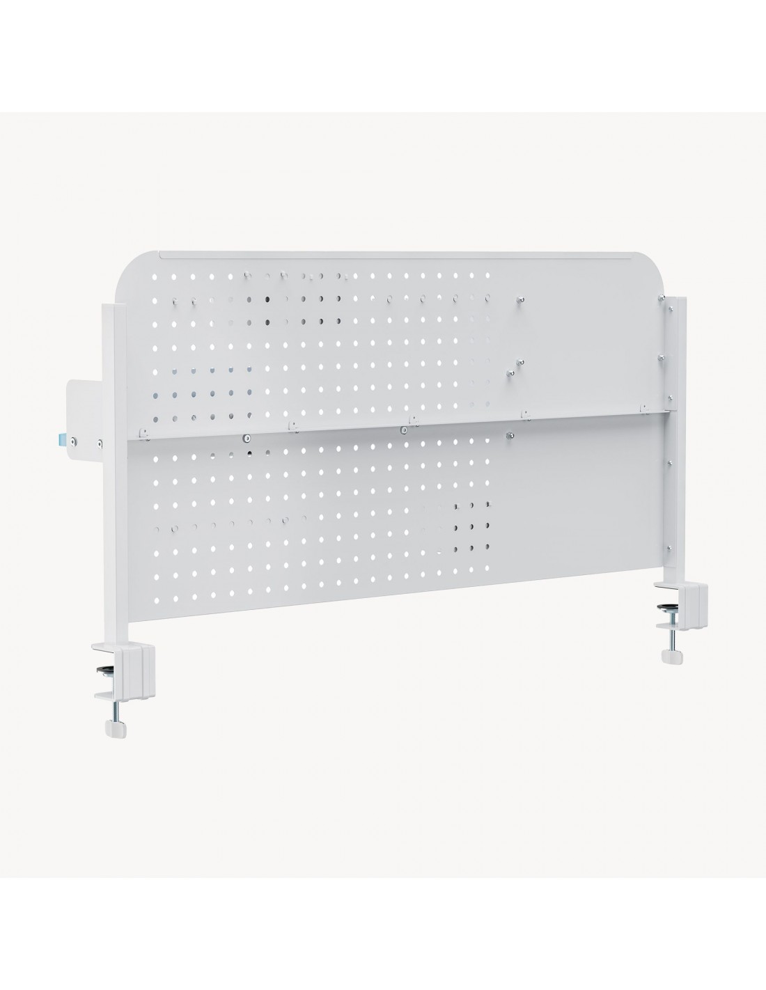 Organiser til skrivebord, udført i et design af hvidlakeret stål og blå møbelplade. Organiseren måler 62,5 - 67,5 cm i højden og 114 x 16 cm i bredde og dybde. Til organiseren medfølger tilbehør som vist på produktbillederne.