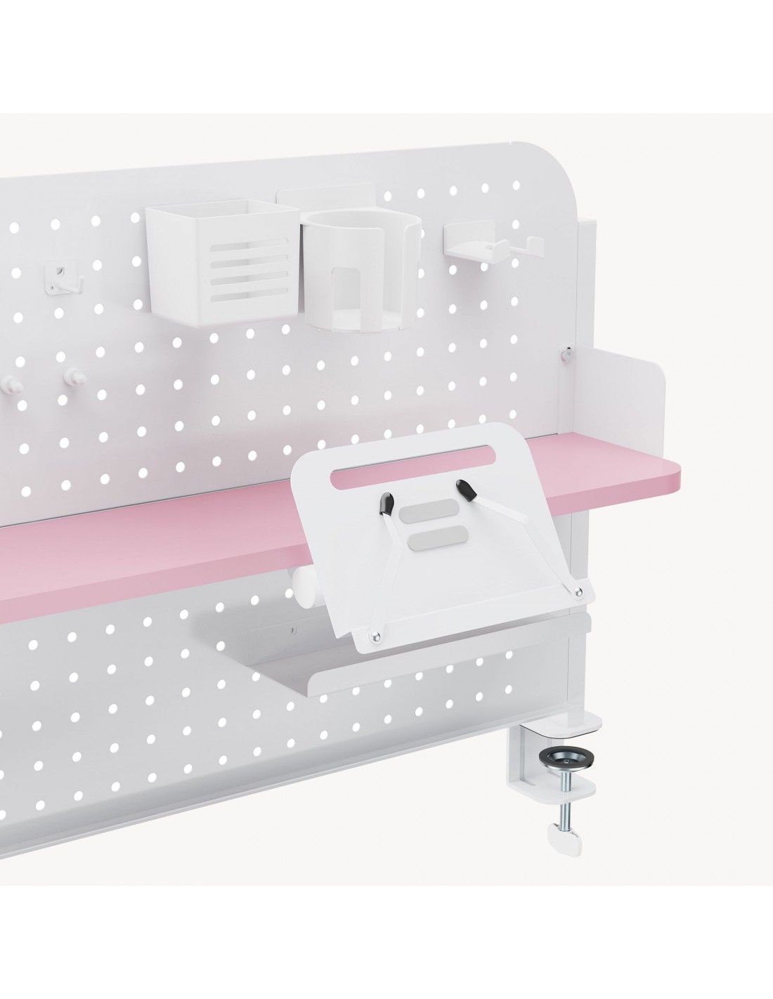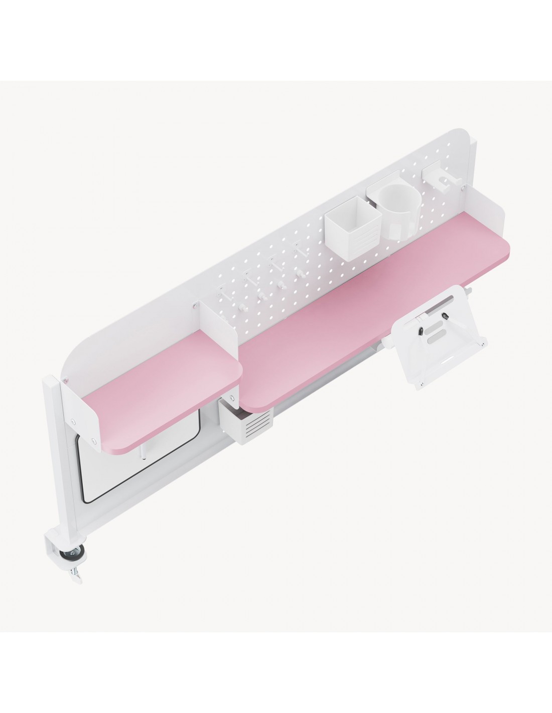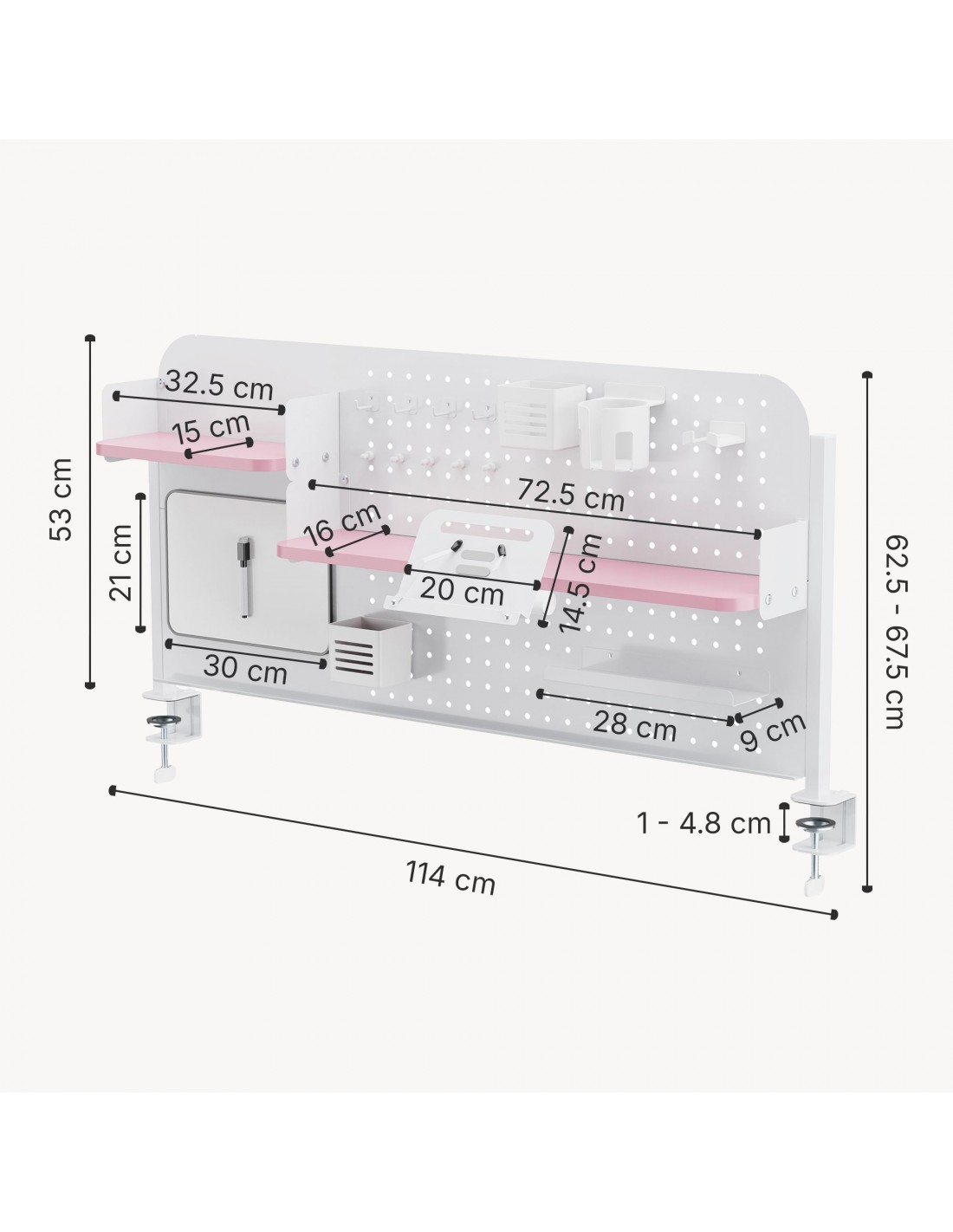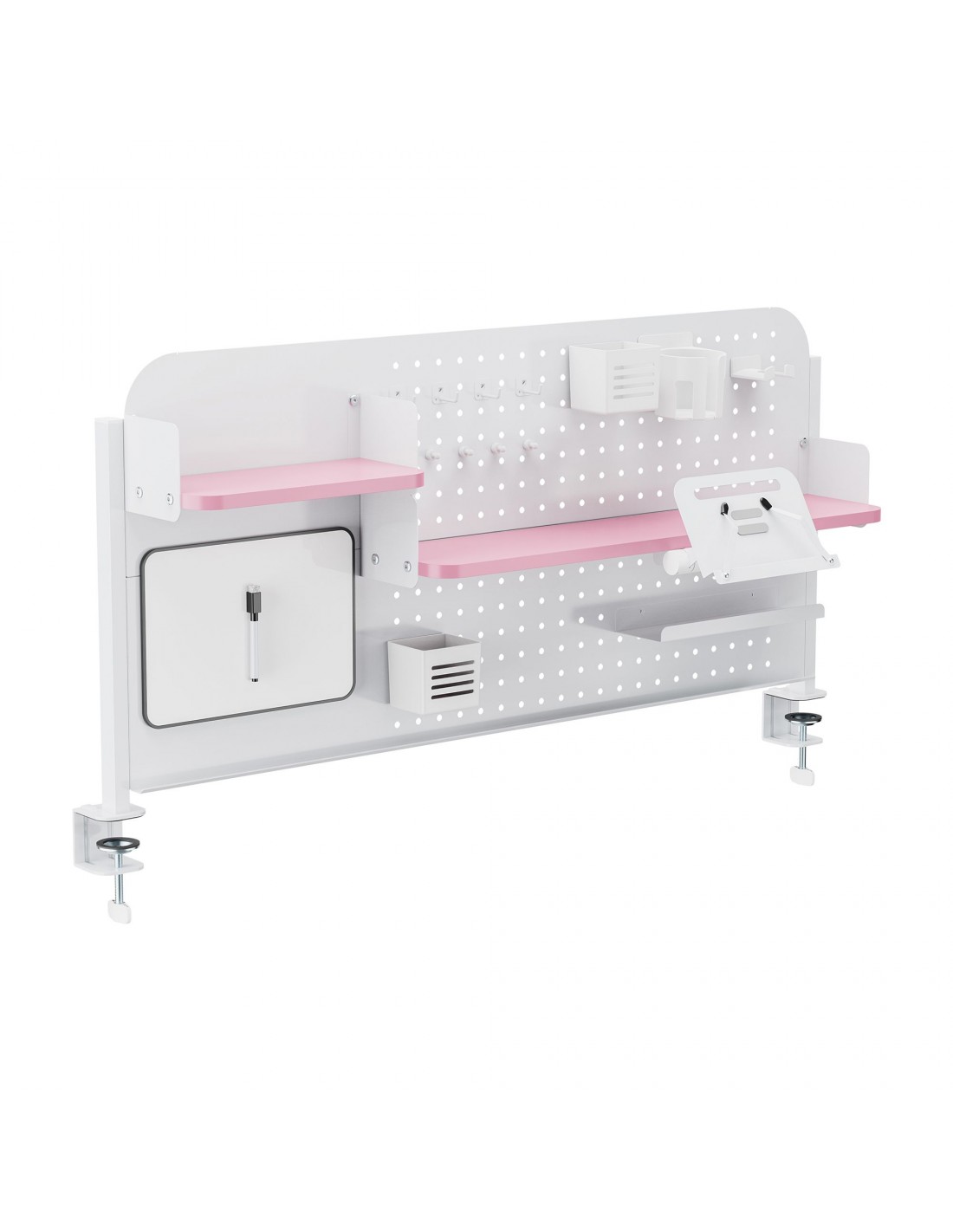 Organiser til skrivebord, udført i et design af hvidlakeret stål og rosa møbelplade. Organiseren måler 62,5 - 67,5 cm i højden og 114 x 16 cm i bredde og dybde. Til organiseren medfølger tilbehør som vist på produktbillederne.