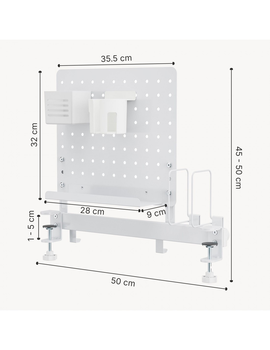 Side organiser til skrivebord, udført i et design af hvidlakeret stål og møbelplade. Organiseren måler 45 - 50 cm i højden og 50 x 9 cm i bredde og dybde. Til organiseren medfølger beholdere som vist på produktbillederne.