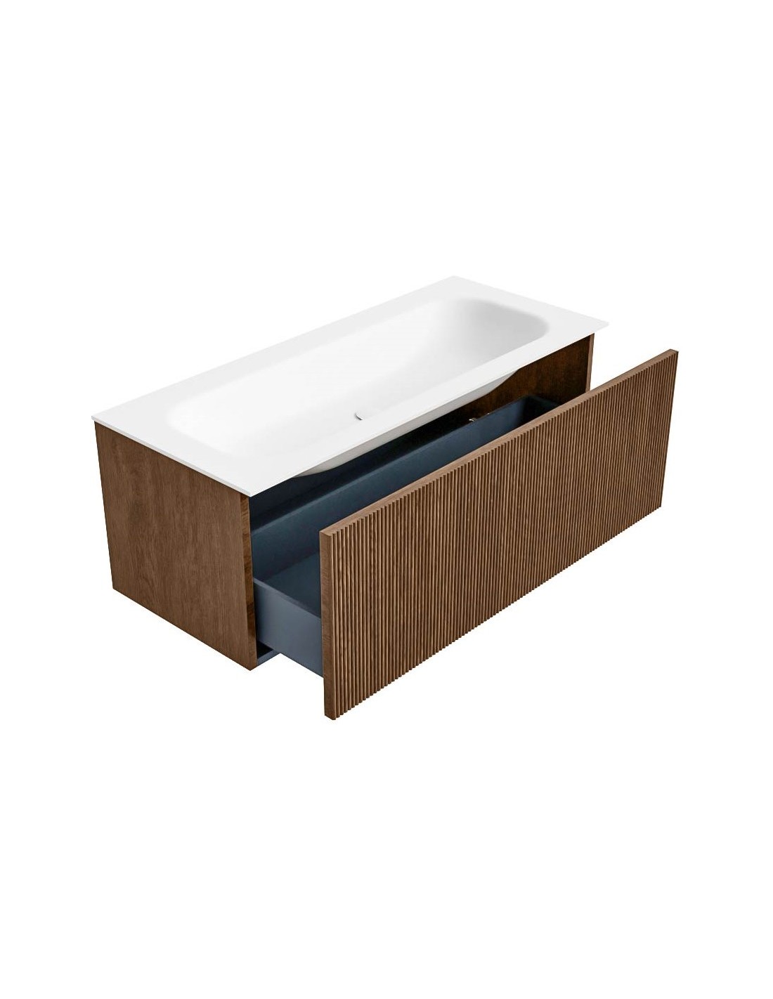 KURVE Komplet badmiljø udført i et design af valnøddefarvet egetræ og finér med håndvask i solid surface til vægmonteret armatur. Badmiljøet kommer med 1 skuffe med push-to-open funktion. Håndvasken er fremstillet i talkum farvet (mat hvid). Badmiljøet måler 110 (111 cm håndvask) cm i bredden. Det viste armatur medfølger ikke i sættet.