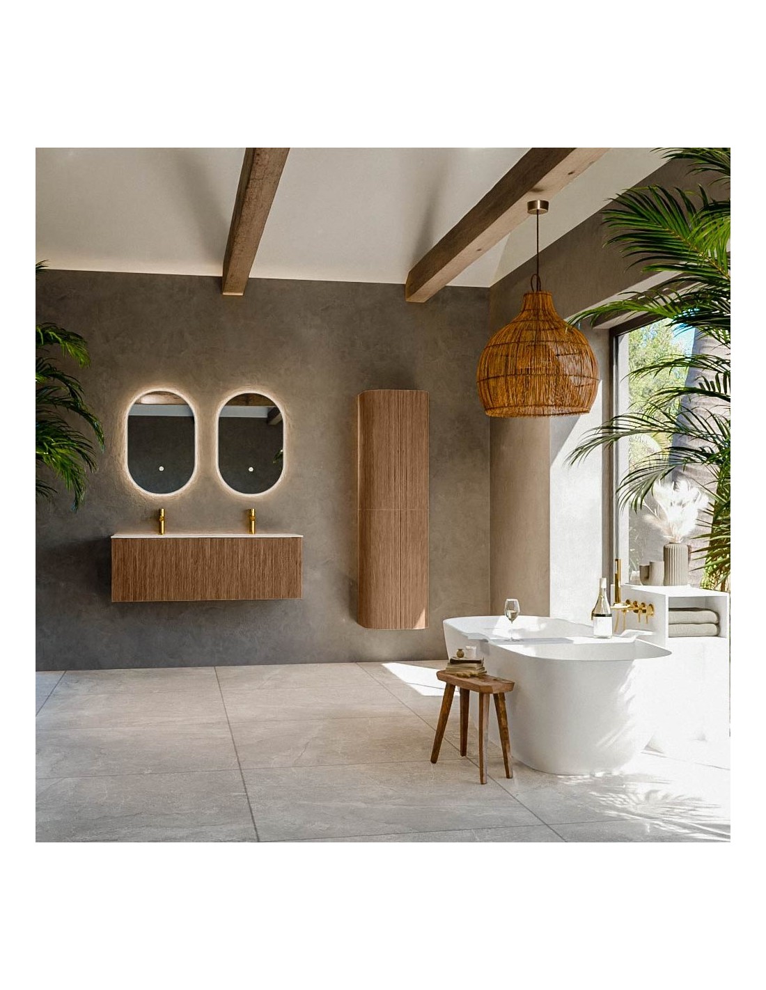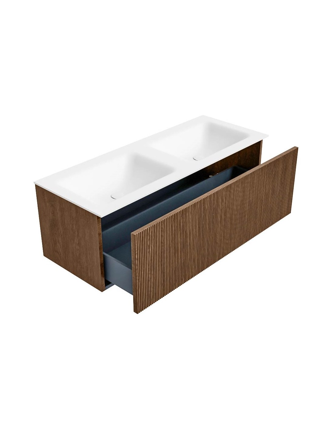 KURVE Komplet badmiljø i egetræ og solid surface med hanehuller B121 cm - Valnød/Talkum
