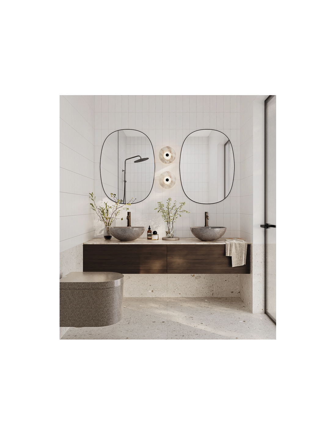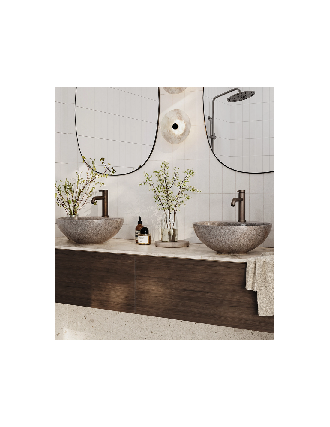 Woodio kombinerer moderne skandinavisk design med naturlige materialer, hvilket skaber minimalistiske, men varme og indbydende badeværelsesmiljøer. Hvert produkt har en unik tekstur og overflade, som gør det til en æstetisk tilføjelse til ethvert rum.