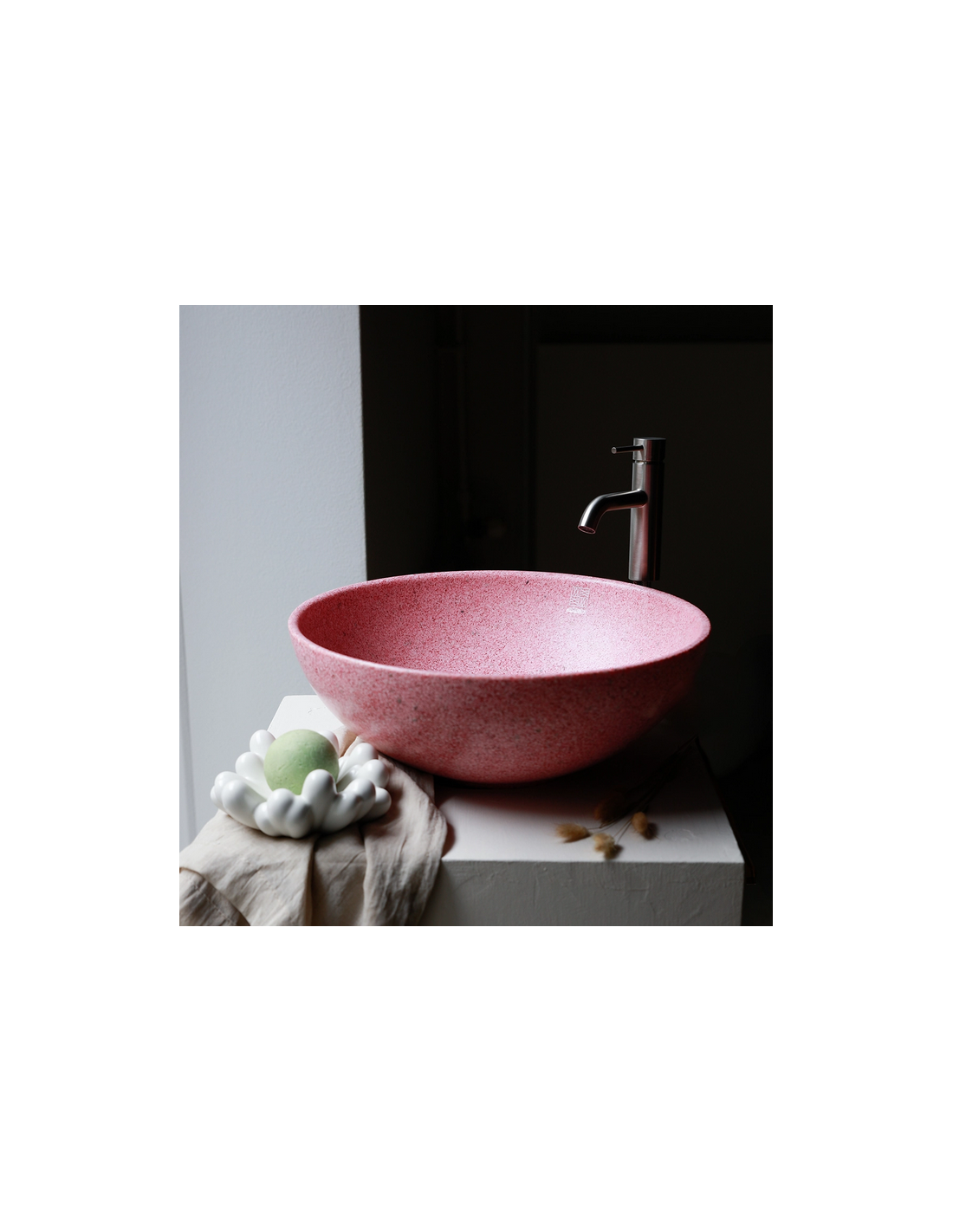 Woodio Soft40 bordmonteret håndvask fremstillet i bæredygtige materialer fra de Finske skove (80% ren træ/20% resin) og udført i en blød form, der gør håndvasken meget behageligt at røre ved. Håndvasken måler 40 cm i diameter.