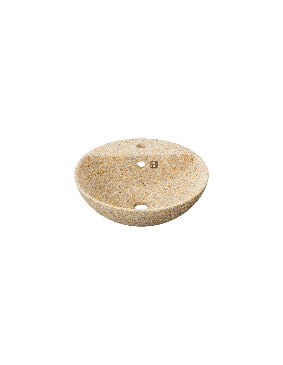Woodio Soft40 bordmonteret håndvask med hanehul, fremstillet i bæredygtige materialer fra de Finske skove (80% ren træ/20% resin) og udført i en blød form, der gør håndvasken meget behageligt at røre ved. Håndvasken måler 40 cm i diameter.