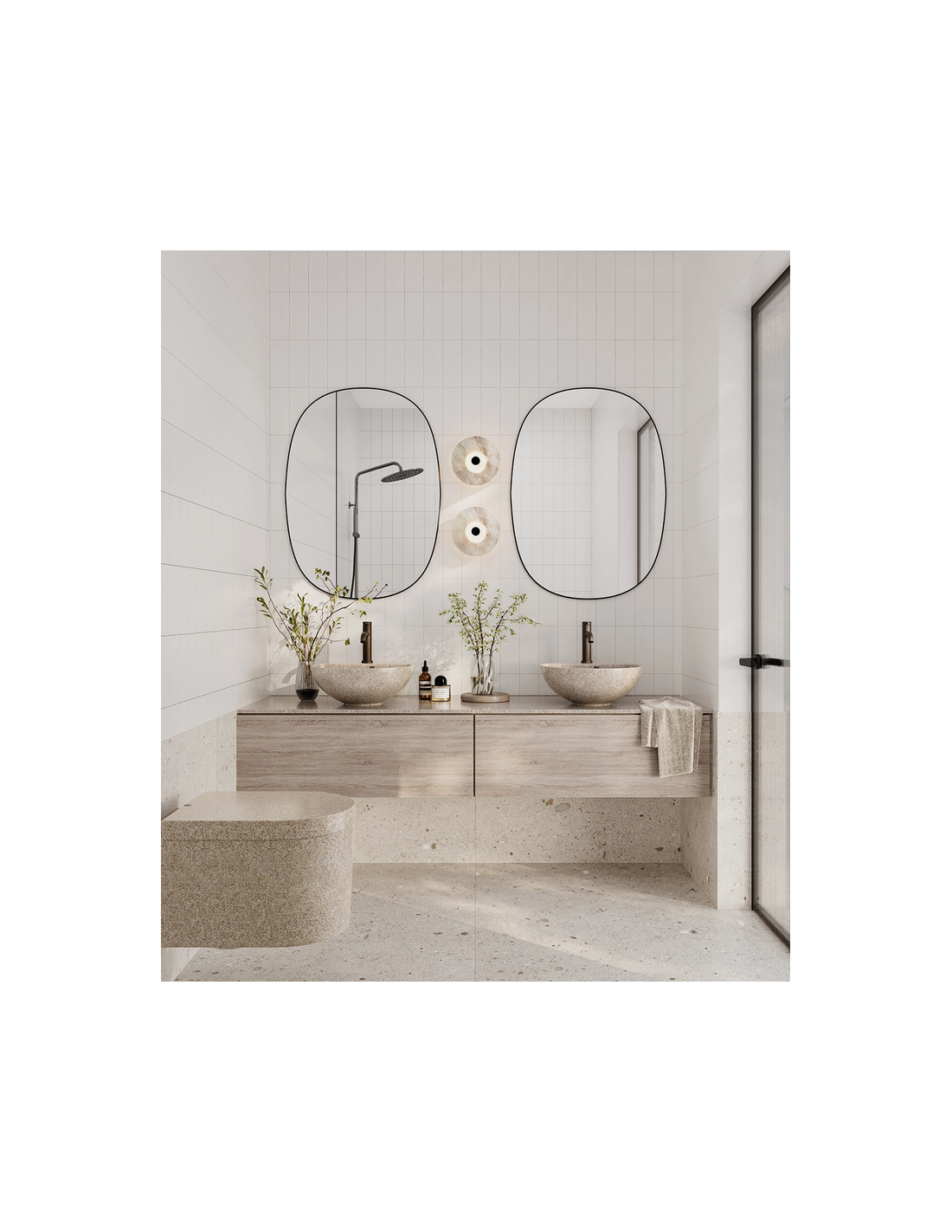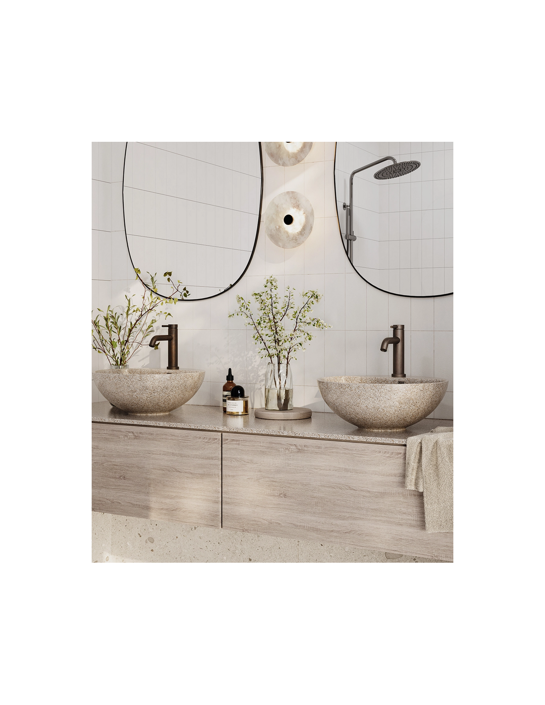 Woodio kombinerer moderne skandinavisk design med naturlige materialer, hvilket skaber minimalistiske, men varme og indbydende badeværelsesmiljøer. Hvert produkt har en unik tekstur og overflade, som gør det til en æstetisk tilføjelse til ethvert rum.