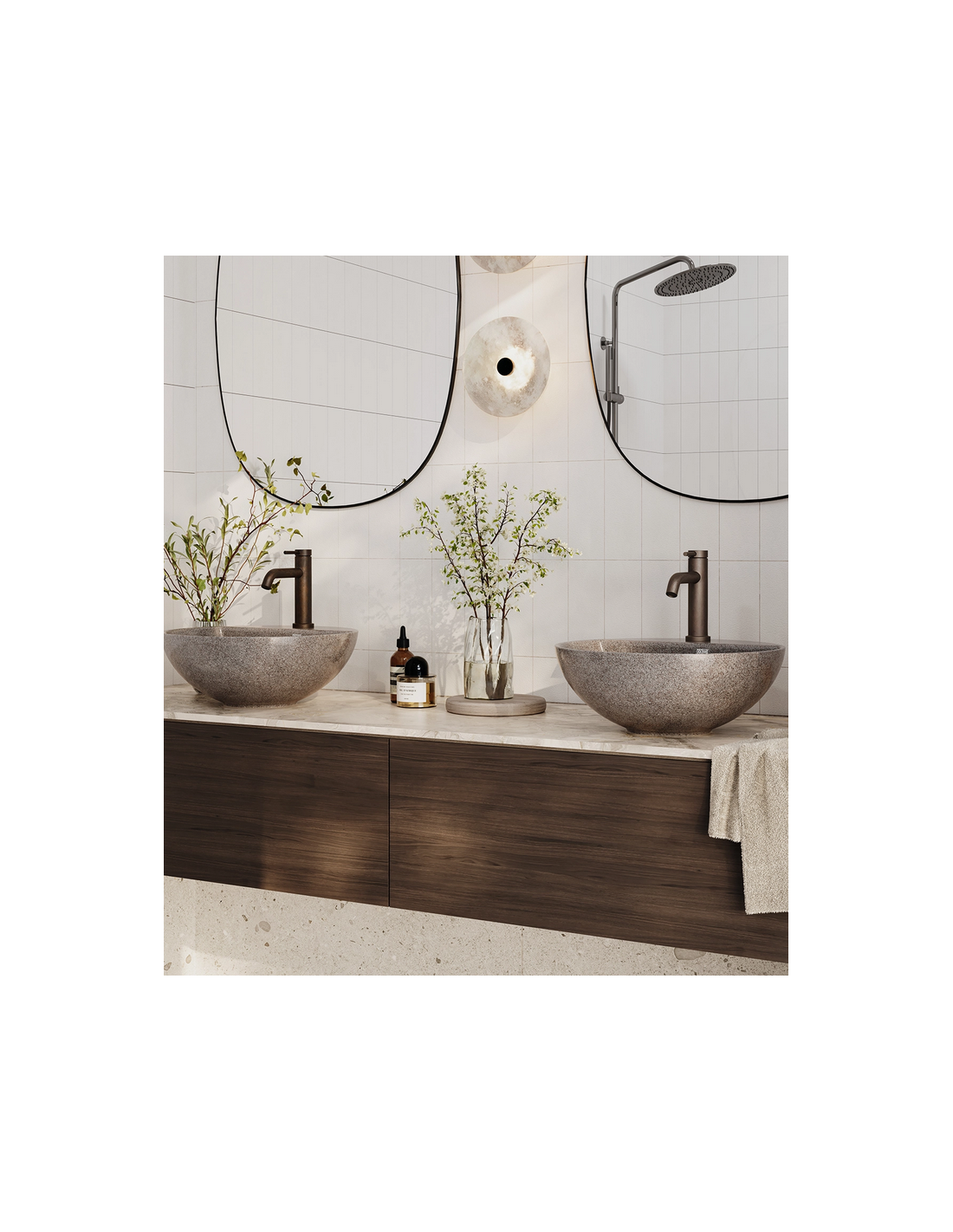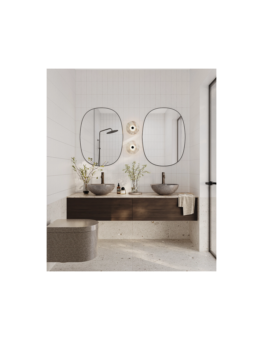 Woodio kombinerer moderne skandinavisk design med naturlige materialer, hvilket skaber minimalistiske, men varme og indbydende badeværelsesmiljøer. Hvert produkt har en unik tekstur og overflade, som gør det til en æstetisk tilføjelse til ethvert rum.