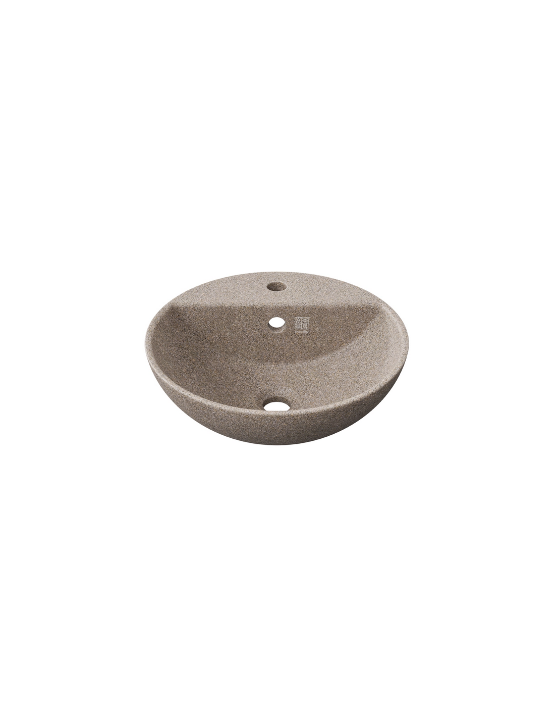Woodio Soft40 bordmonteret håndvask med hanehul, fremstillet i bæredygtige materialer fra de Finske skove (80% ren træ/20% resin) og udført i en blød form, der gør håndvasken meget behageligt at røre ved. Håndvasken måler 40 cm i diameter.
