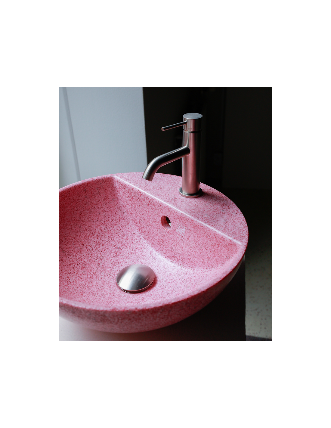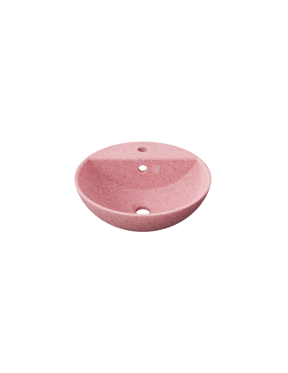 Woodio Soft40 bordmonteret håndvask med hanehul, fremstillet i bæredygtige materialer fra de Finske skove (80% ren træ/20% resin) og udført i en blød form, der gør håndvasken meget behageligt at røre ved. Håndvasken måler 40 cm i diameter.