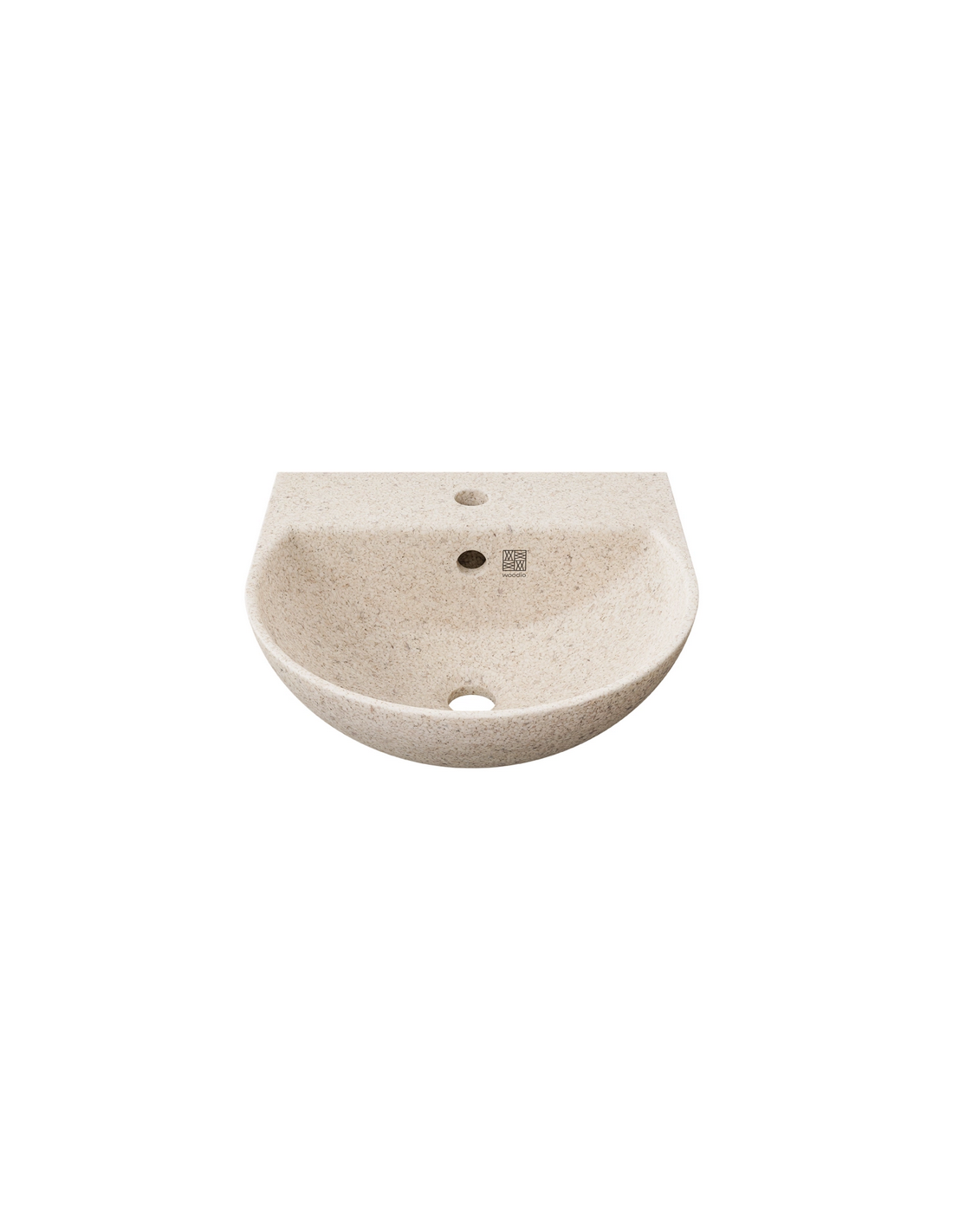 Woodio Soft40 væghængt håndvask med hanehul, fremstillet i bæredygtige materialer fra de Finske skove (80% ren træ/20% resin) og udført i en blød form, der gør håndvasken meget behageligt at røre ved. Håndvasken måler 40 cm i bredden.