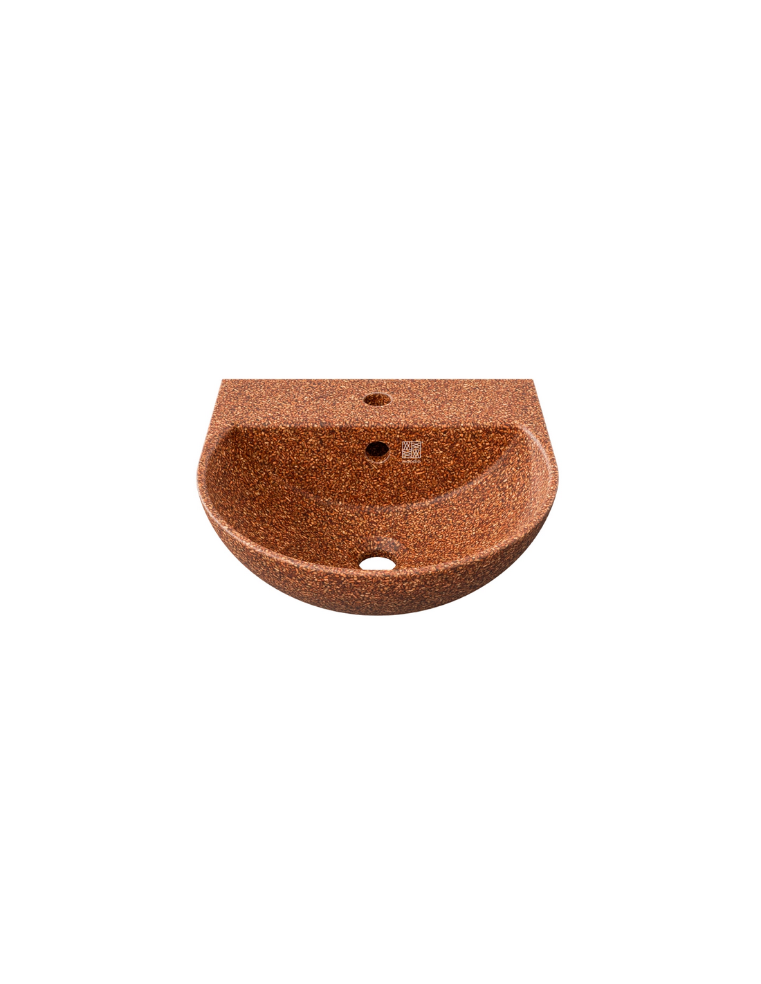 Woodio Soft40 væghængt håndvask med hanehul, fremstillet i bæredygtige materialer fra de Finske skove (80% ren træ/20% resin) og udført i en blød form, der gør håndvasken meget behageligt at røre ved. Håndvasken måler 40 cm i bredden.