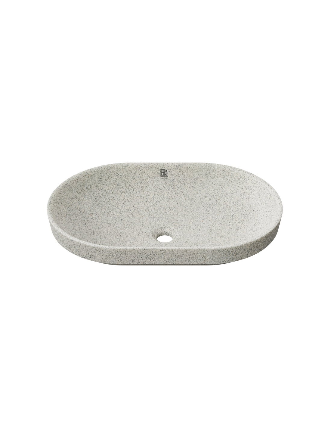 Woodio Soft40 oval nedfældet håndvask fremstillet i bæredygtige materialer fra de Finske skove (80% ren træ/20% resin) og udført i en blød form, der gør håndvasken meget behageligt at røre ved. Håndvasken måler 60 x 40 cm i bredde og dybde.