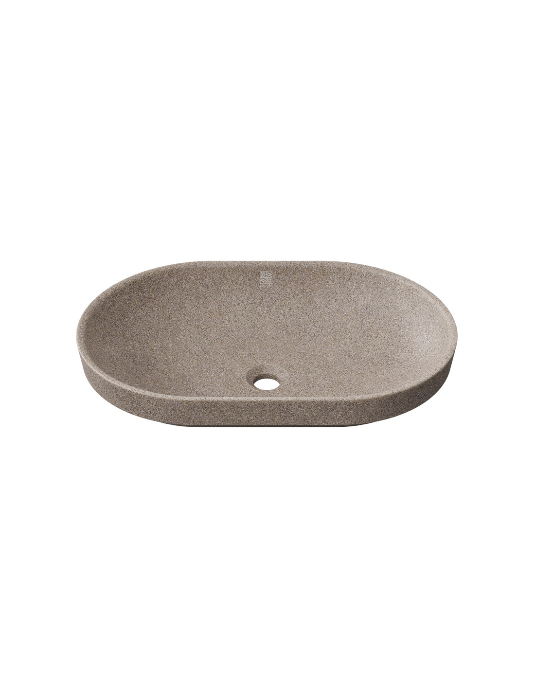 Woodio Soft40 oval nedfældet håndvask fremstillet i bæredygtige materialer fra de Finske skove (80% ren træ/20% resin) og udført i en blød form, der gør håndvasken meget behageligt at røre ved. Håndvasken måler 60 x 40 cm i bredde og dybde.