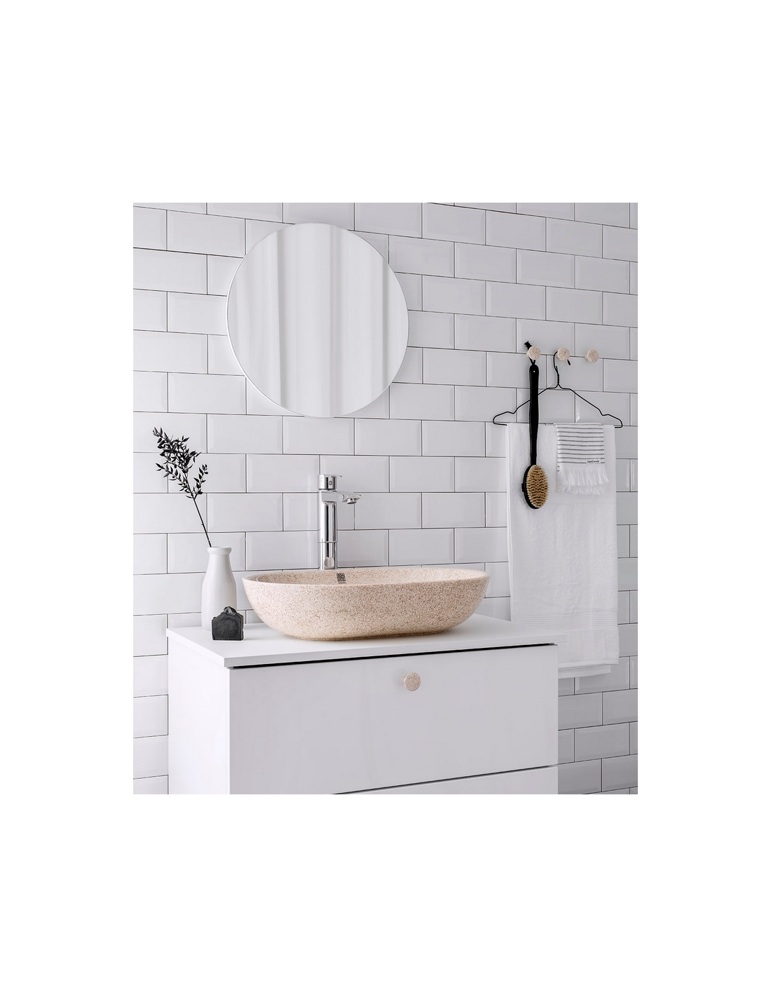 Woodio Soft40 oval bordmonteret håndvask fremstillet i bæredygtige materialer fra de Finske skove (80% ren træ/20% resin) og udført i en blød form, der gør håndvasken meget behageligt at røre ved. Håndvasken måler 60 x 40 cm i bredde og dybde.
