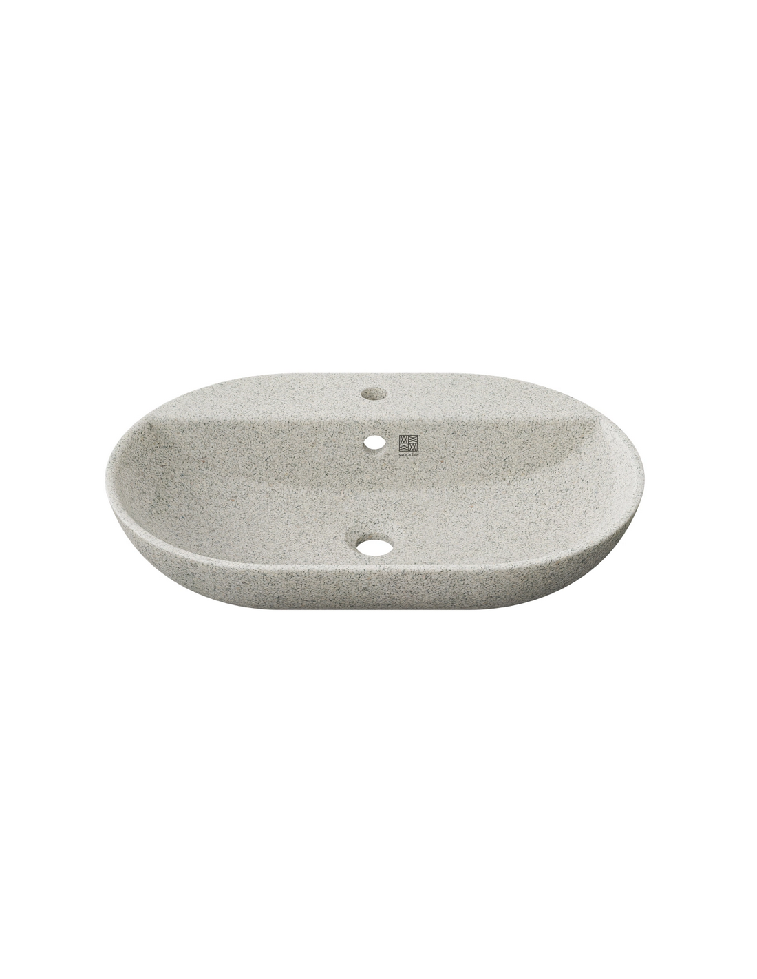 Woodio Soft40 oval bordmonteret håndvask med hanehul, fremstillet i bæredygtige materialer fra de Finske skove (80% ren træ/20% resin) og udført i en blød form, der gør håndvasken meget behageligt at røre ved. Håndvasken måler 60 x 40 cm i bredde og dybde.