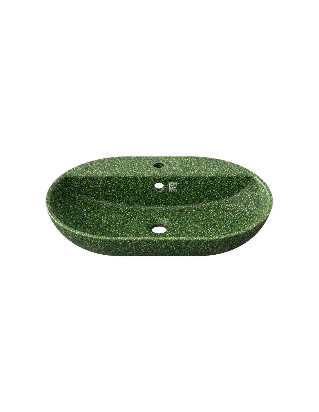 Woodio Soft40 oval bordmonteret håndvask med hanehul, fremstillet i bæredygtige materialer fra de Finske skove (80% ren træ/20% resin) og udført i en blød form, der gør håndvasken meget behageligt at røre ved. Håndvasken måler 60 x 40 cm i bredde og dybde.