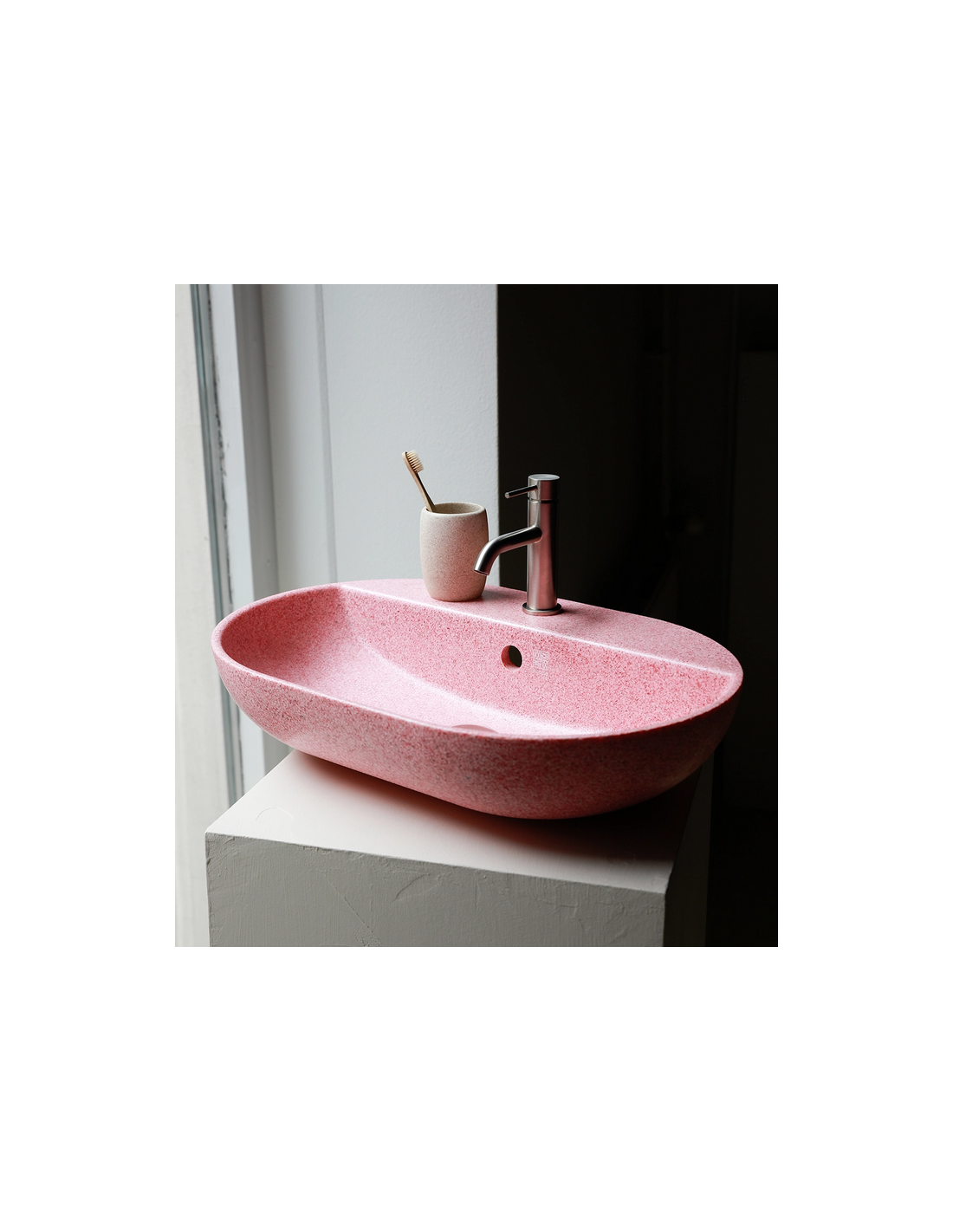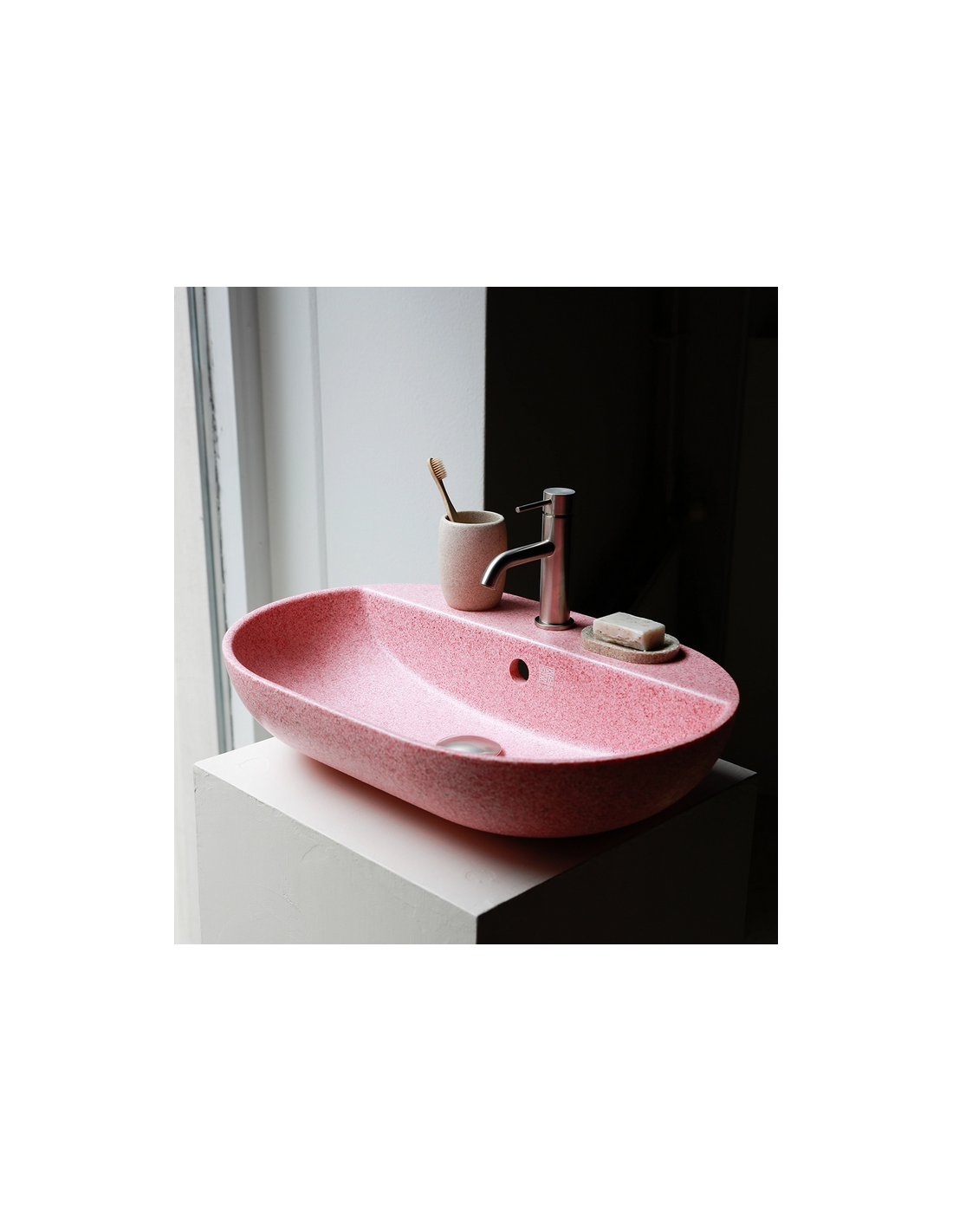 Woodio Soft40 oval bordmonteret håndvask med hanehul, fremstillet i bæredygtige materialer fra de Finske skove (80% ren træ/20% resin) og udført i en blød form, der gør håndvasken meget behageligt at røre ved. Håndvasken måler 60 x 40 cm i bredde og dybde.