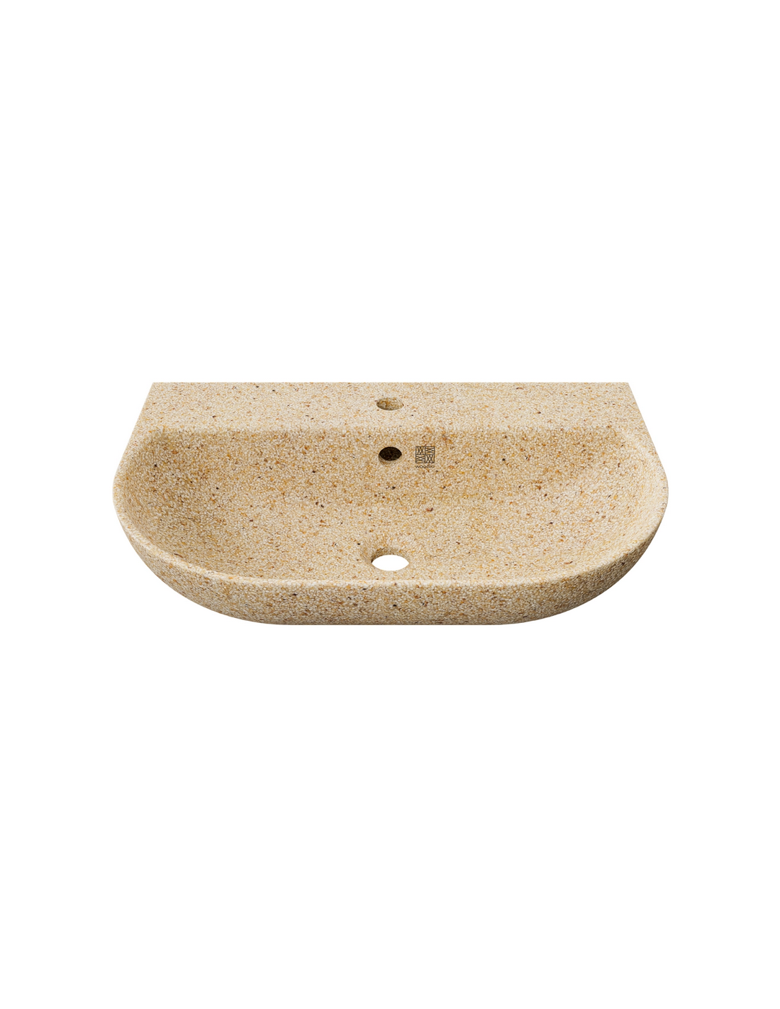 Woodio Soft40 væghængt håndvask med hanehul, fremstillet i bæredygtige materialer fra de Finske skove (80% ren træ/20% resin) og udført i en blød form, der gør håndvasken meget behageligt at røre ved. Håndvasken måler 60 cm i bredden.