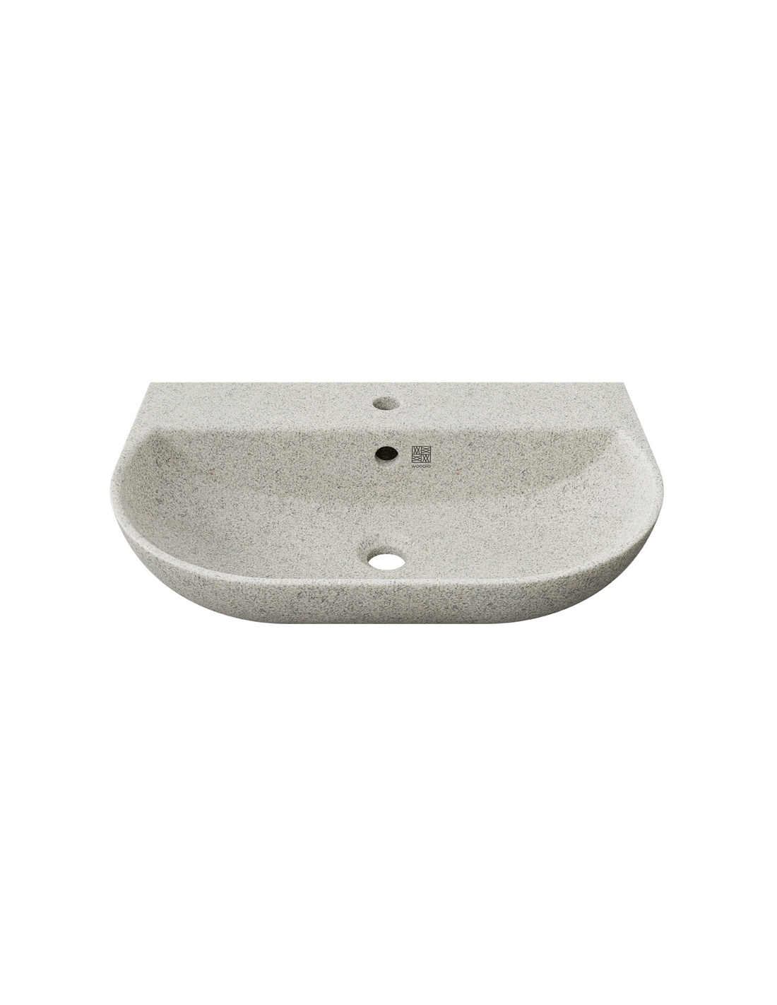 Woodio Soft40 væghængt håndvask med hanehul, fremstillet i bæredygtige materialer fra de Finske skove (80% ren træ/20% resin) og udført i en blød form, der gør håndvasken meget behageligt at røre ved. Håndvasken måler 60 cm i bredden.