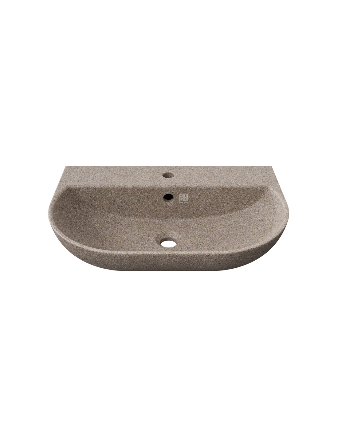 Woodio Soft40 væghængt håndvask med hanehul, fremstillet i bæredygtige materialer fra de Finske skove (80% ren træ/20% resin) og udført i en blød form, der gør håndvasken meget behageligt at røre ved. Håndvasken måler 60 cm i bredden.