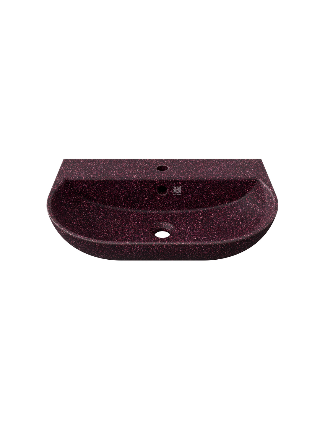 Woodio Soft40 væghængt håndvask med hanehul, fremstillet i bæredygtige materialer fra de Finske skove (80% ren træ/20% resin) og udført i en blød form, der gør håndvasken meget behageligt at røre ved. Håndvasken måler 60 cm i bredden.