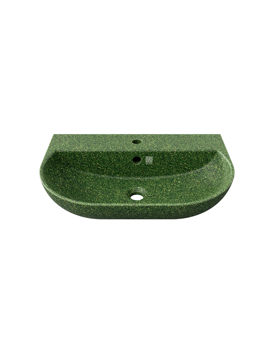Woodio Soft40 væghængt håndvask med hanehul, fremstillet i bæredygtige materialer fra de Finske skove (80% ren træ/20% resin) og udført i en blød form, der gør håndvasken meget behageligt at røre ved. Håndvasken måler 60 cm i bredden.