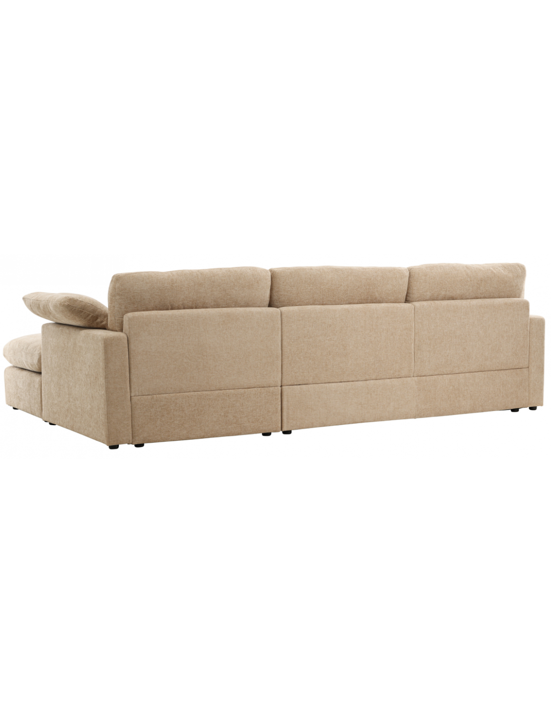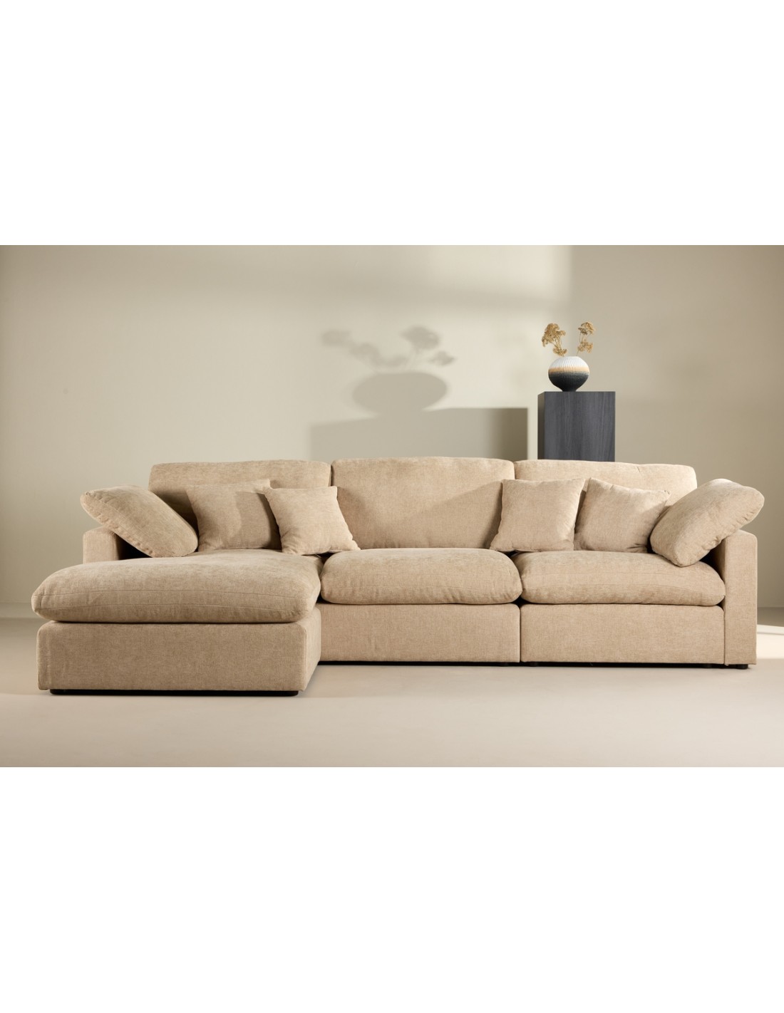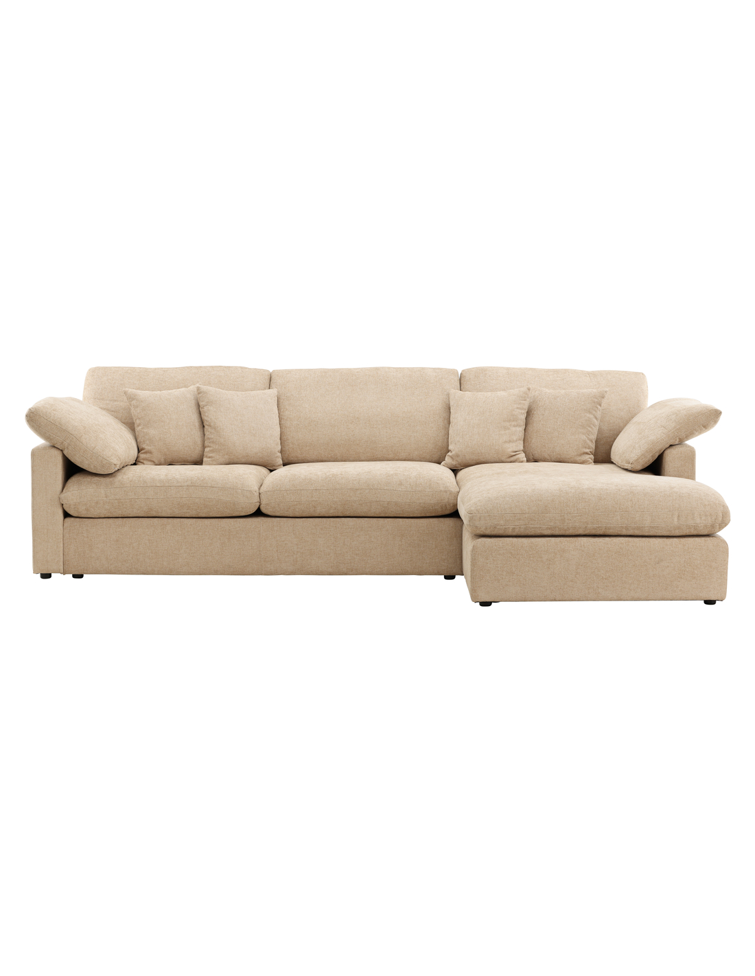 AMALFI Chaiselongsofa udført i et moderne design fremstillet i sandfarvet polyester og med ben i sort kunststof. Chaiselongdelen kan sættes efter ønske, højre eller venstre. Sofaen måler 85 cm i højden over ryggen og med siddehøjde på 46 cm. Sofaens bredde og dybde er 297 x 107 - 182 cm. En sand flyder sofa perfekt til ren afslapning eller samvær med familien.
