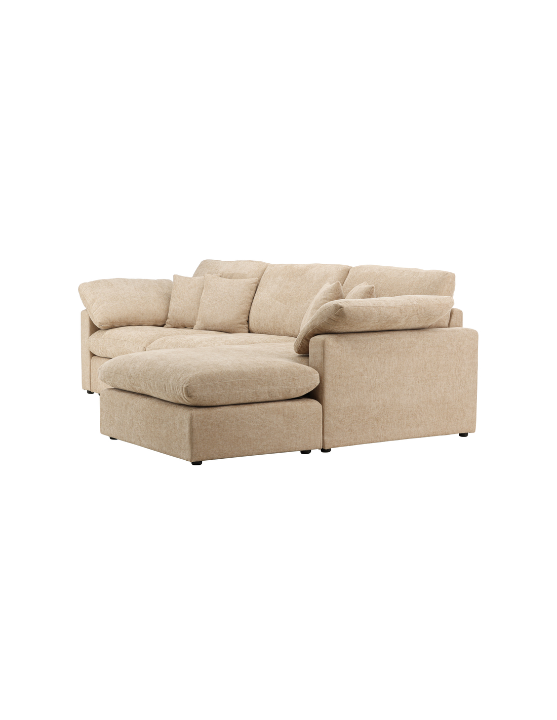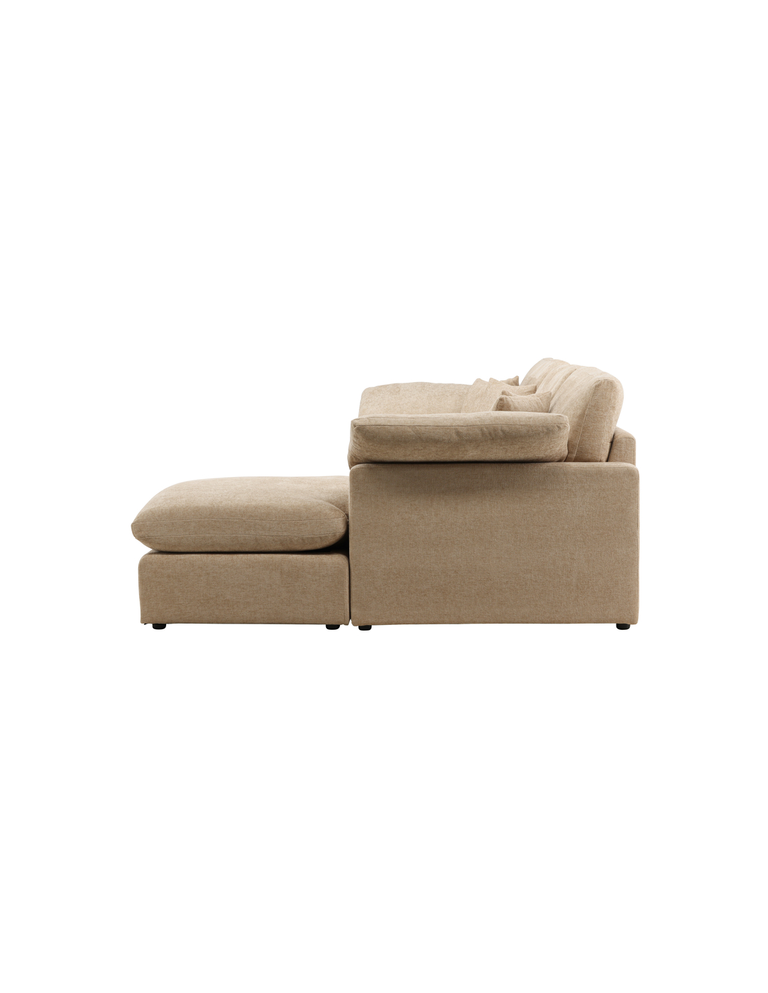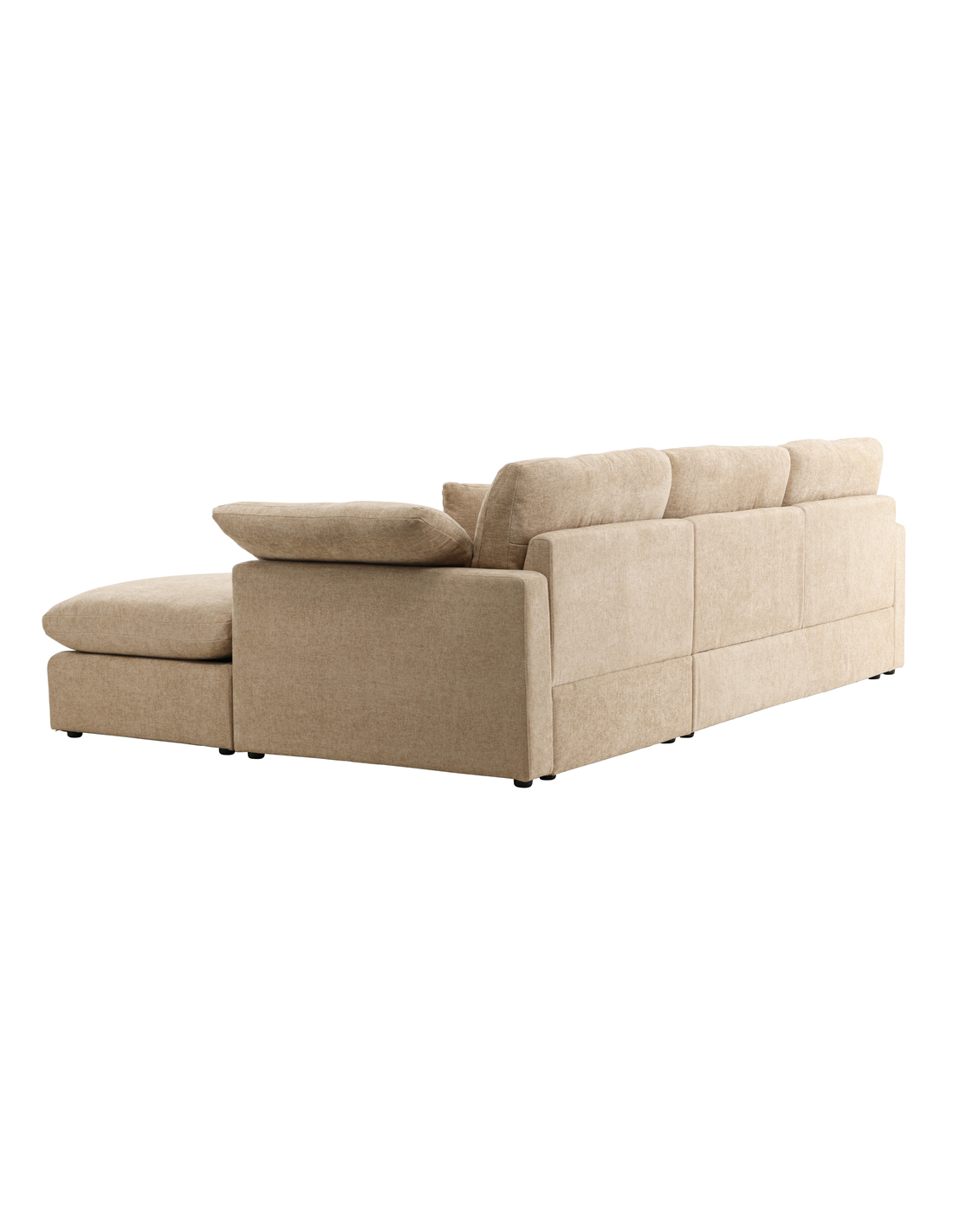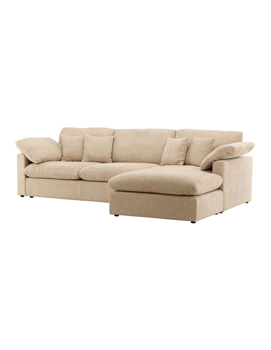 AMALFI Chaiselongsofa udført i et moderne design fremstillet i sandfarvet polyester og med ben i sort kunststof. Chaiselongdelen kan sættes efter ønske, højre eller venstre. Sofaen måler 85 cm i højden over ryggen og med siddehøjde på 46 cm. Sofaens bredde og dybde er 297 x 107 - 182 cm. En sand flyder sofa perfekt til ren afslapning eller samvær med familien.