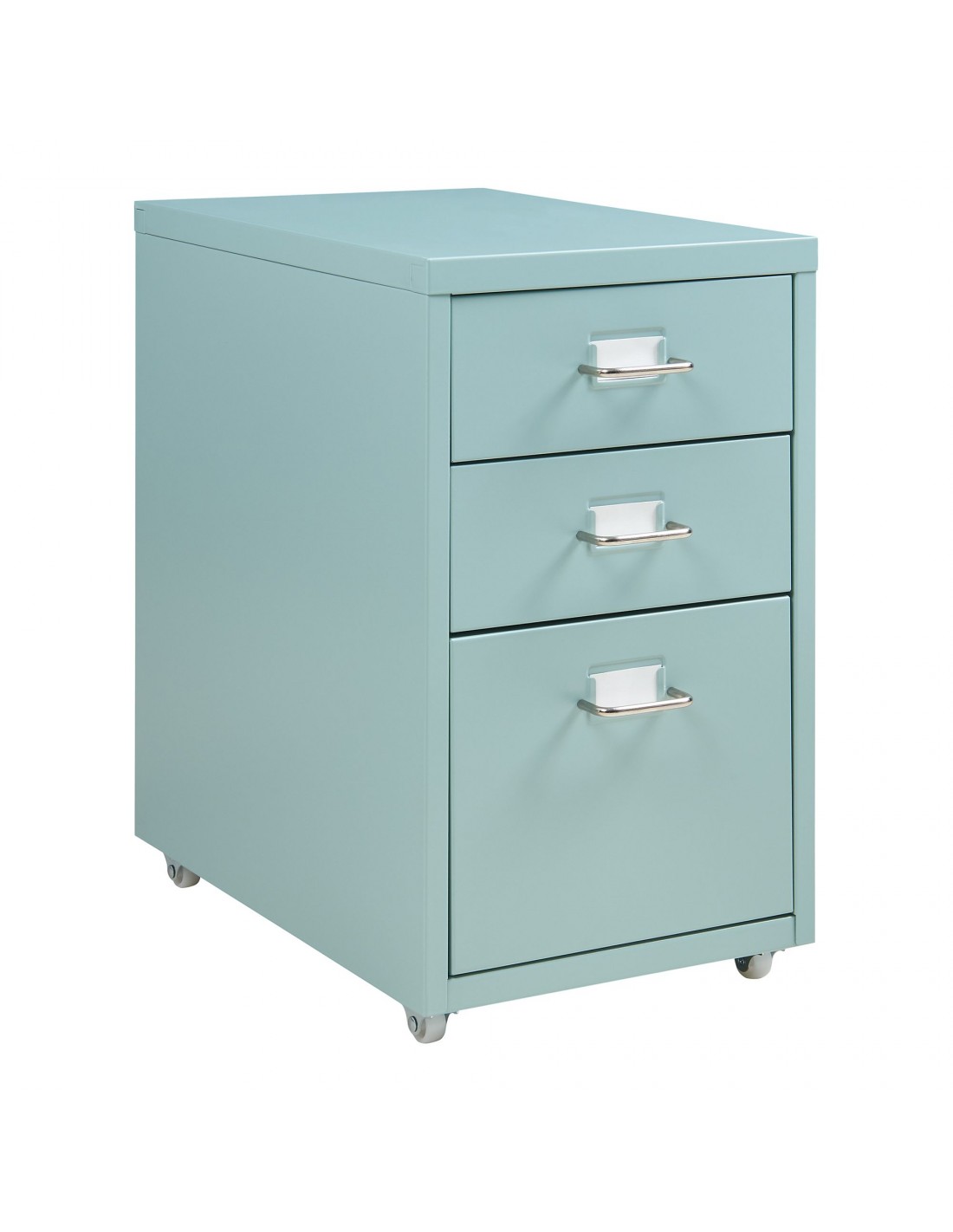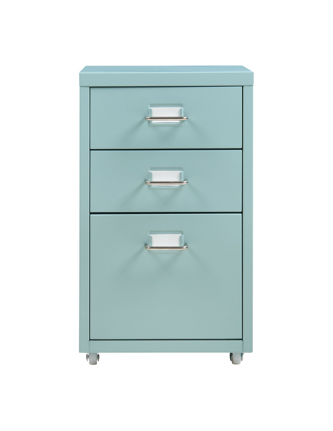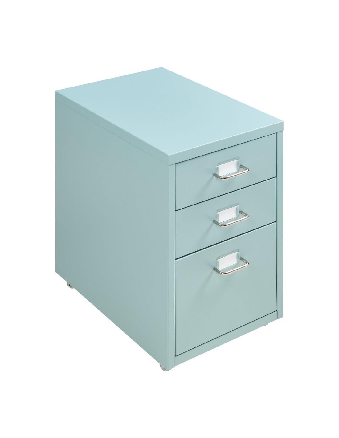 Koka skuffesektion med 3 skuffer, udført i et design af mintgrøn lakeret metal. Skuffesektionen måler 48 cm i højden og 28 x 41 cm i bredde og dybde.