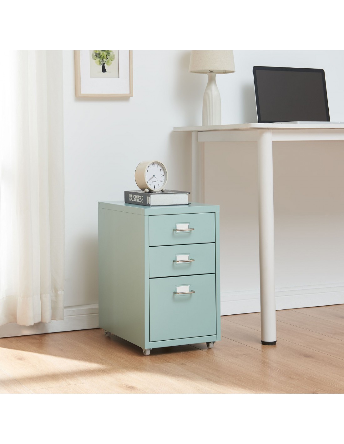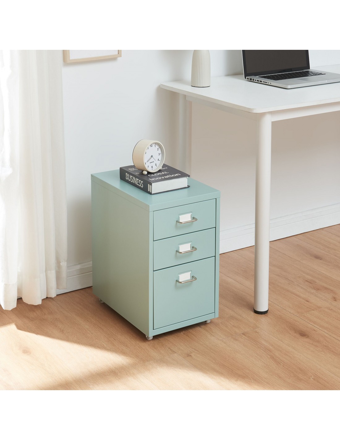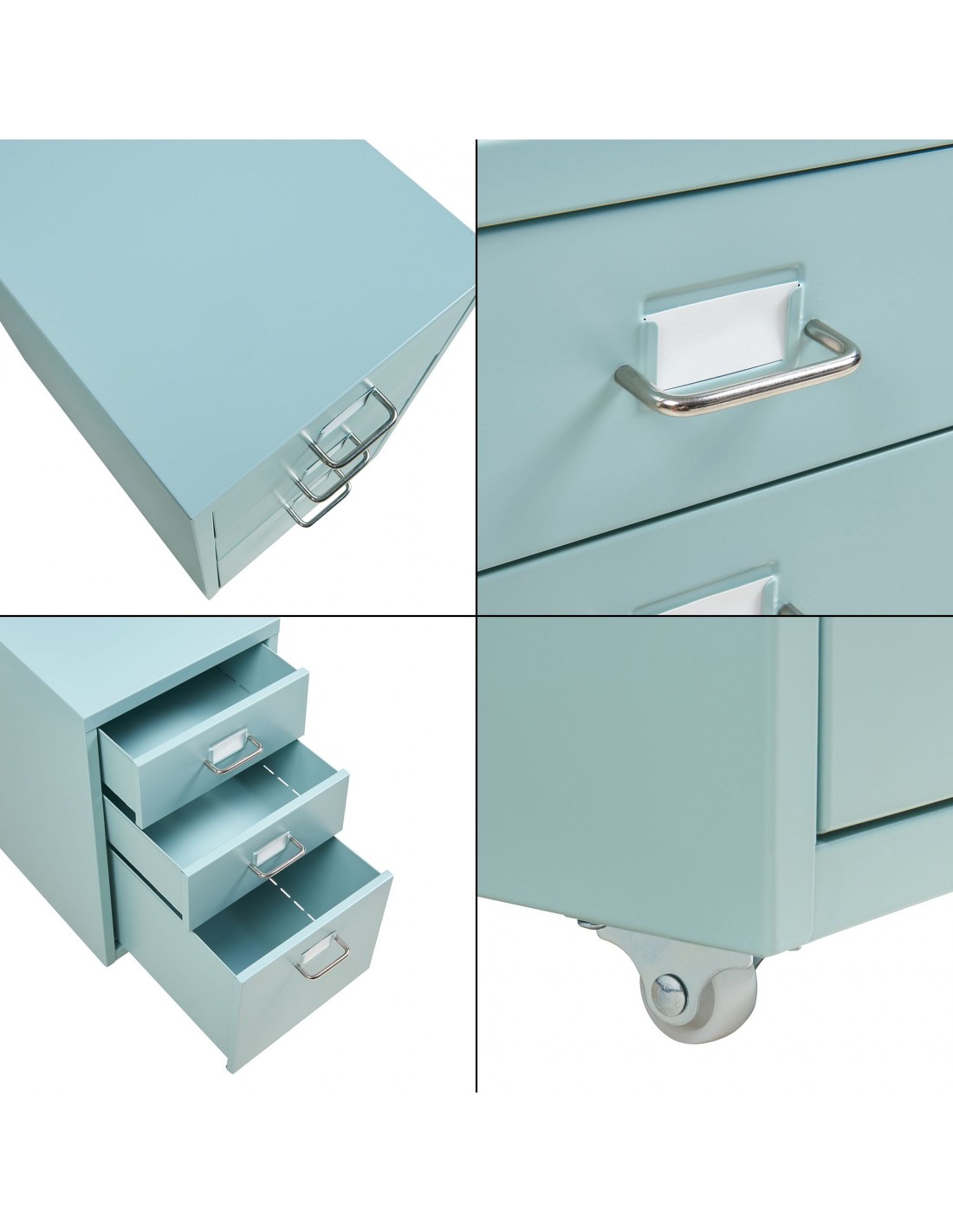 Koka skuffesektion med 3 skuffer, udført i et design af mintgrøn lakeret metal. Skuffesektionen måler 48 cm i højden og 28 x 41 cm i bredde og dybde.