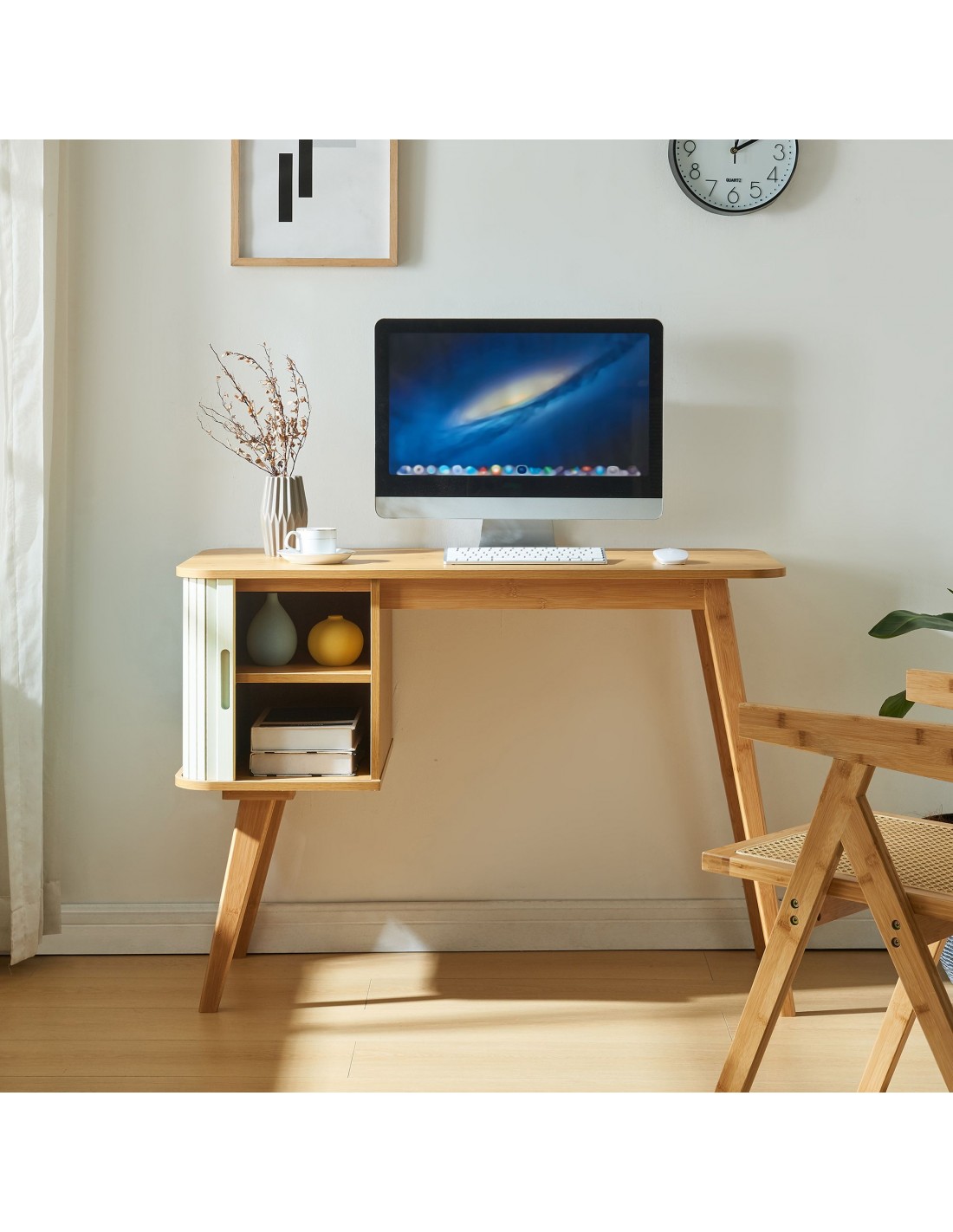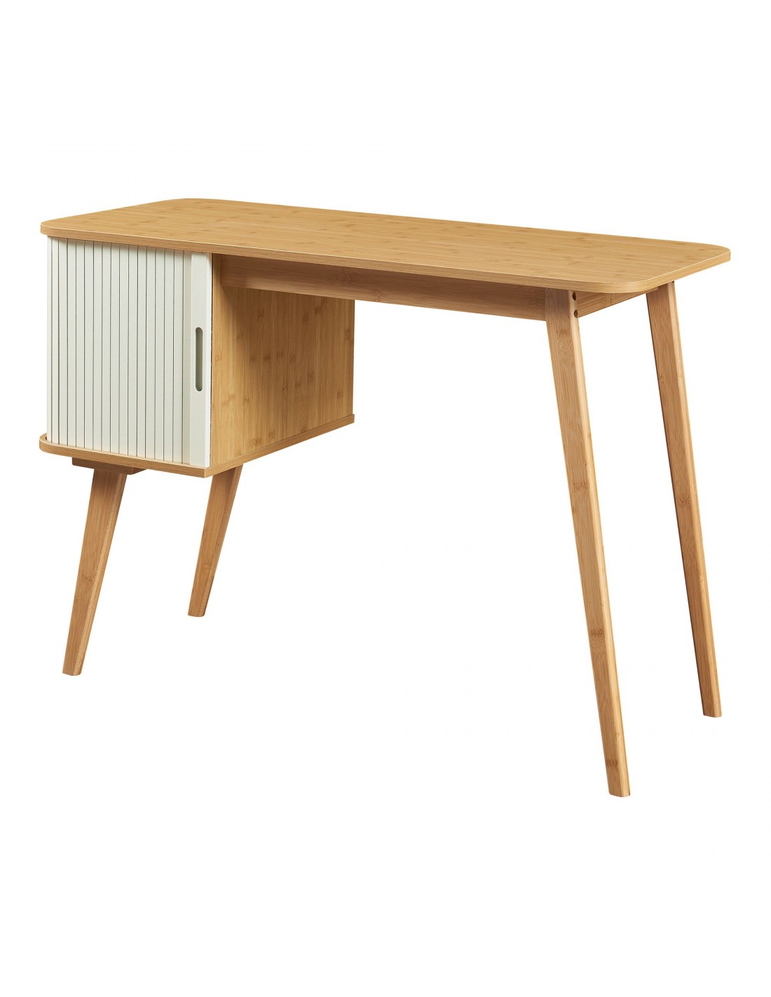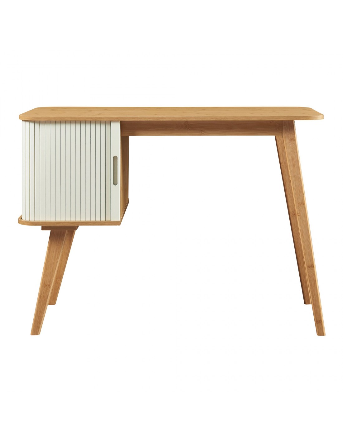 TYSVA Skrivebord udført i et moderne og Skandinavisk design af naturfarvet og cremefarvet bambus og MDF. Skrivebordet har 1 skab med skydelåge og måler 75 cm i højden og 105 x 48 cm i bredde og dybde.