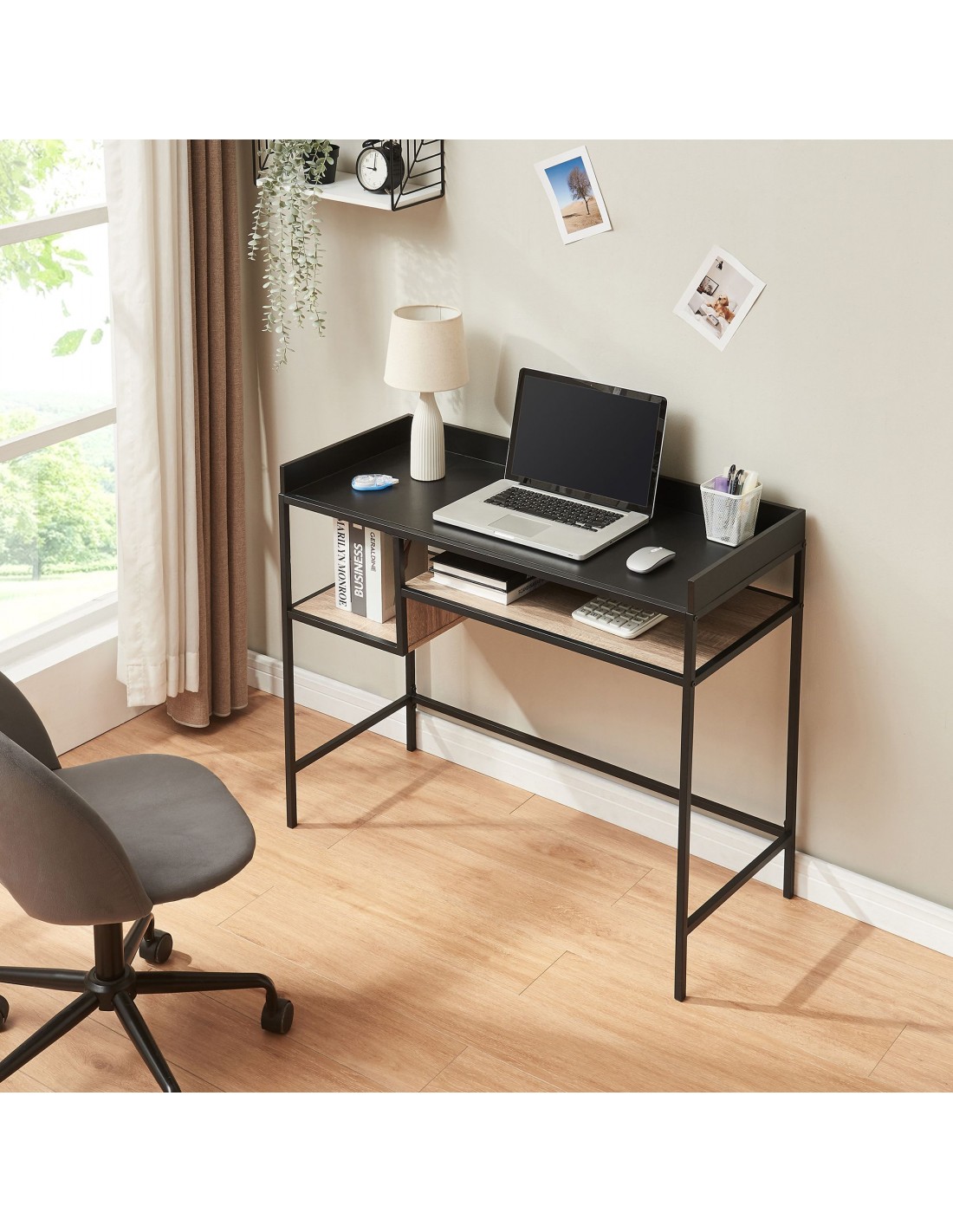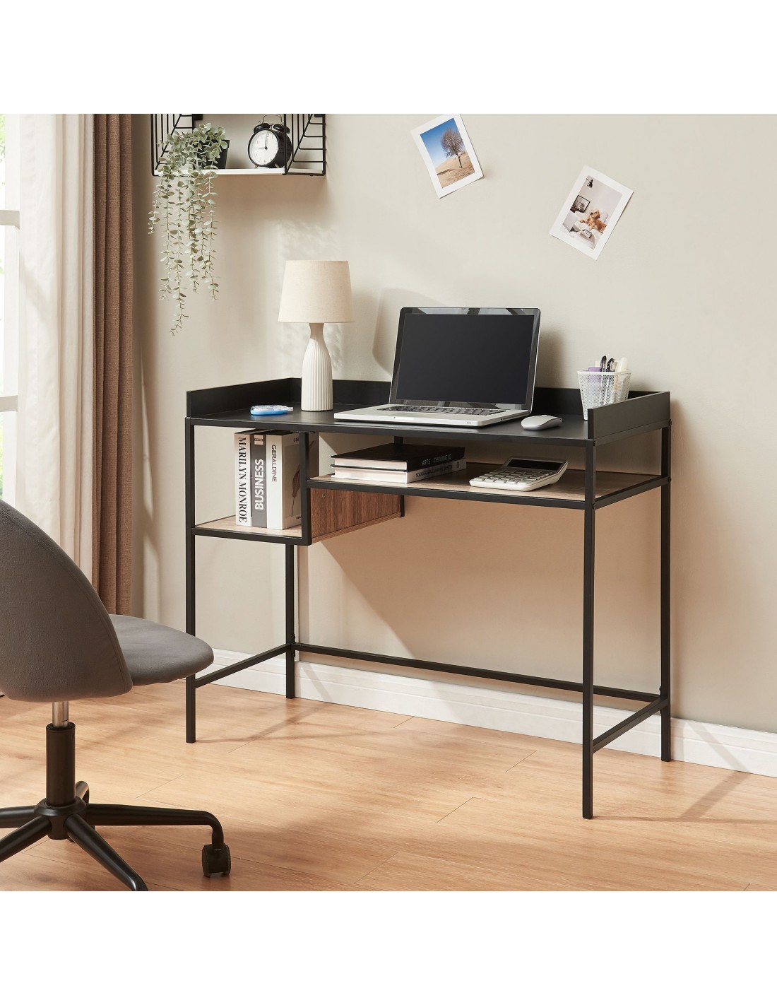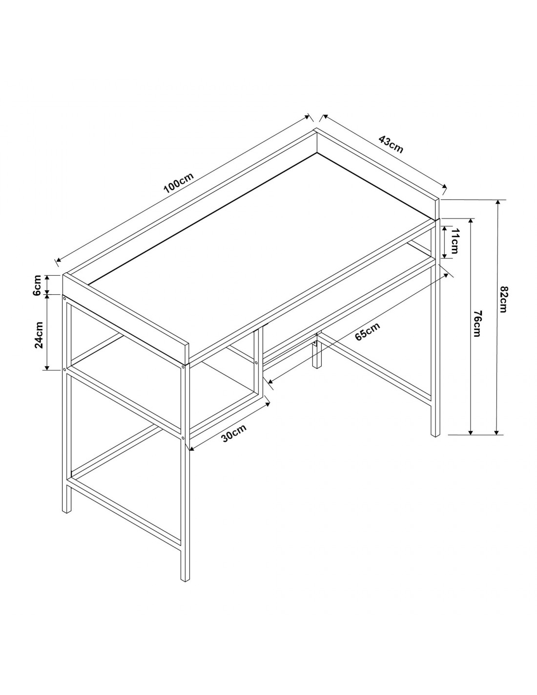 BELA Skrivebord udført i et moderne og Skandinavisk design af sortlakeret metal og egetræsfarvet møbelplade. Skrivebordet har 2 åbne hylderum og måler 76 - 82 cm i højden og 100 x 43 cm i bredde og dybde.