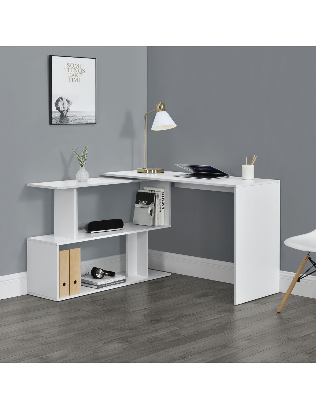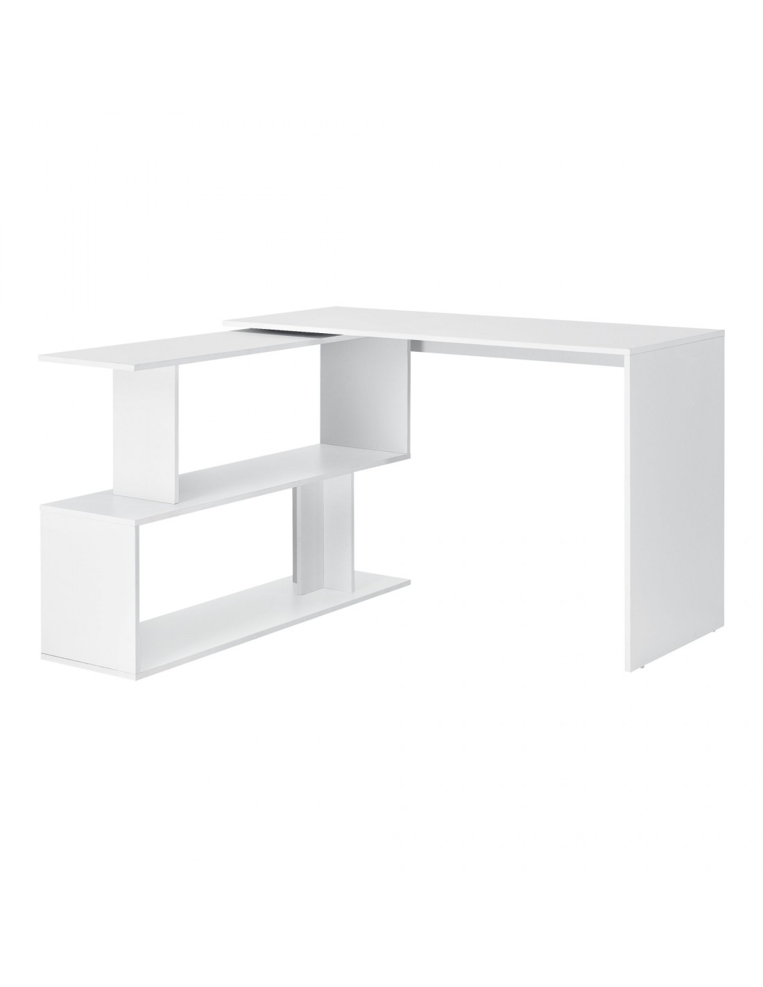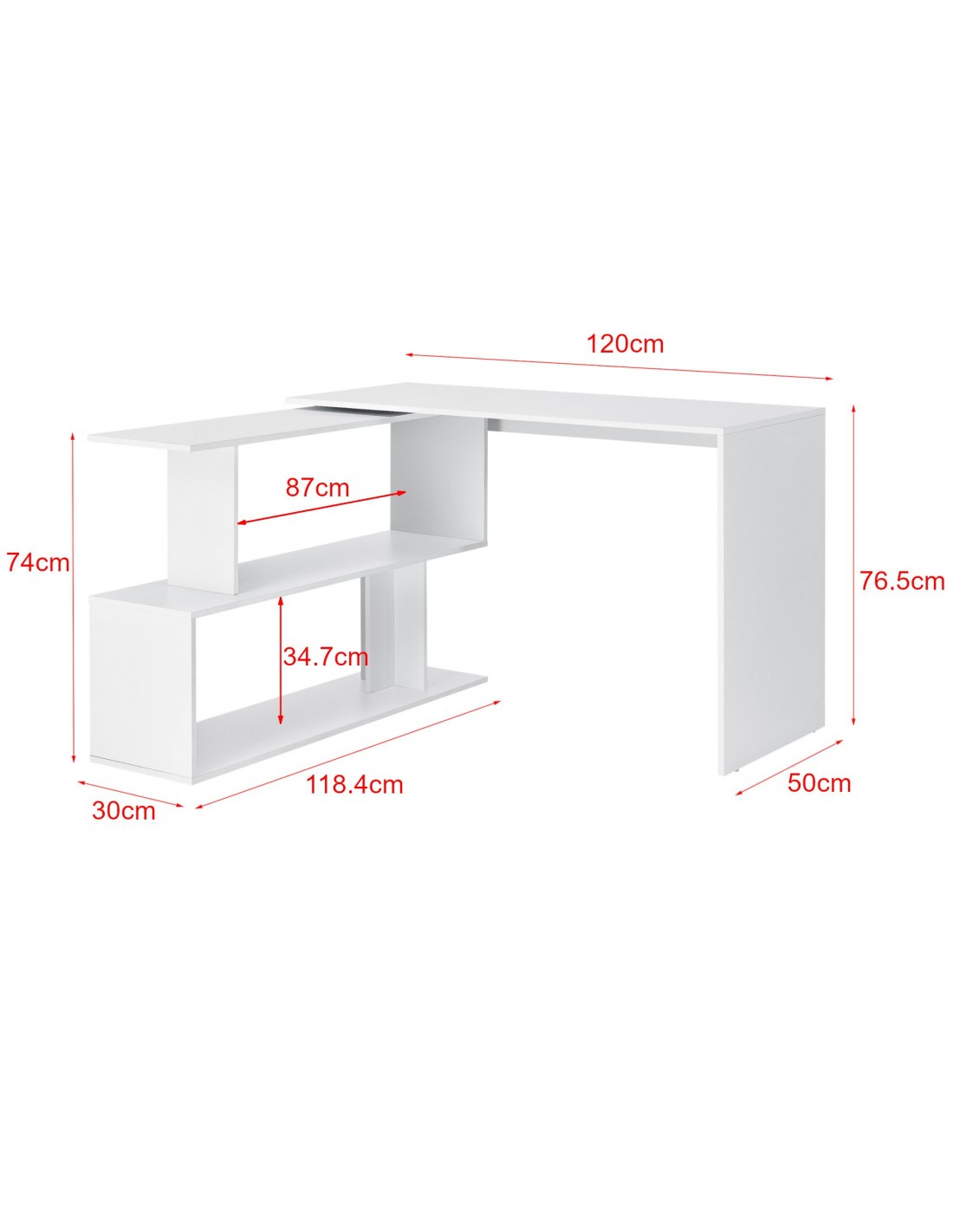 Hjørneskrivebord udført i et design af hvid møbelplade. Skrivebordet måler 76,5 cm i højden og 120 x 118,4 cm i bredde og dybde. Bordplade dybden er 50 cm og 30 cm på reoldelen.