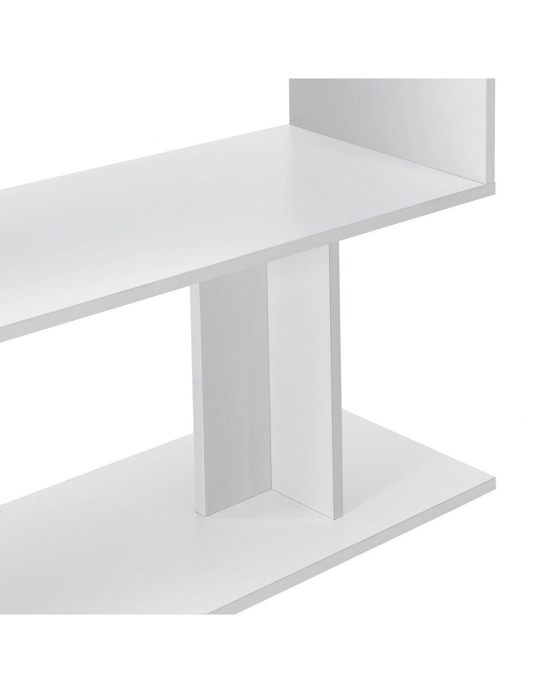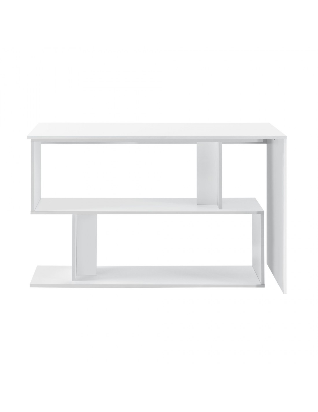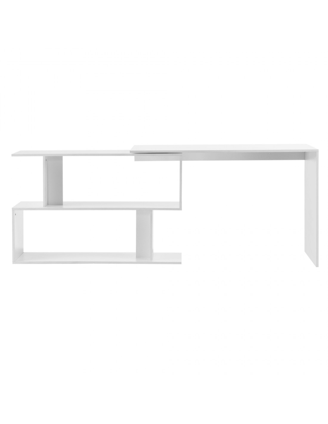 Hjørneskrivebord udført i et design af hvid møbelplade. Skrivebordet måler 76,5 cm i højden og 120 x 118,4 cm i bredde og dybde. Bordplade dybden er 50 cm og 30 cm på reoldelen.