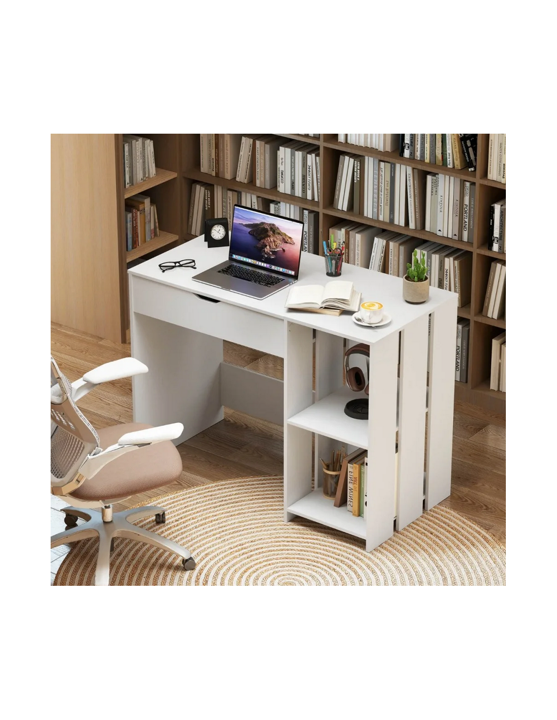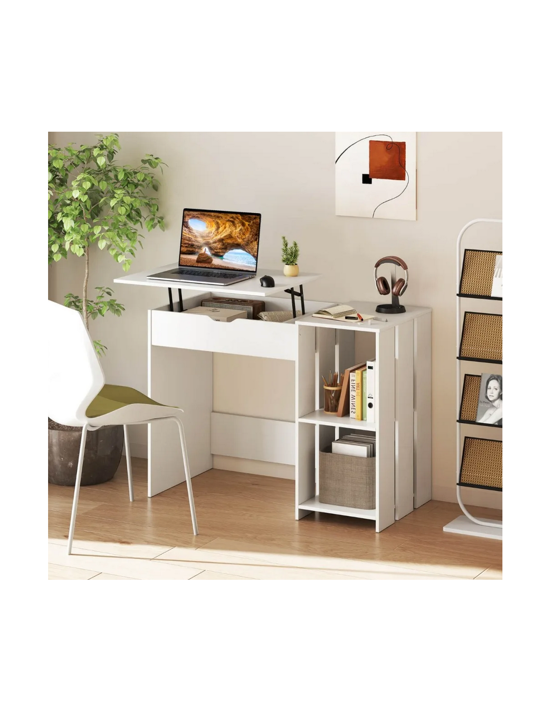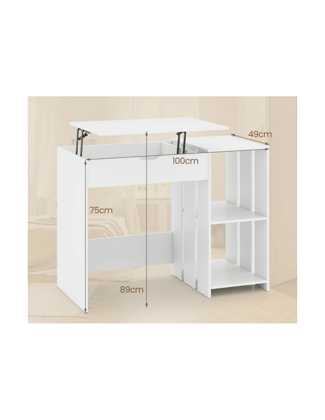 Hæve-/Sænke skrivebord udført i et design af hvid møbelplade. Skrivebordet måler 75 - 89 cm i højden og 100 x 49 cm i bredde og dybde.