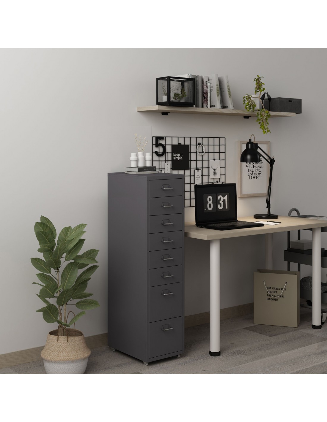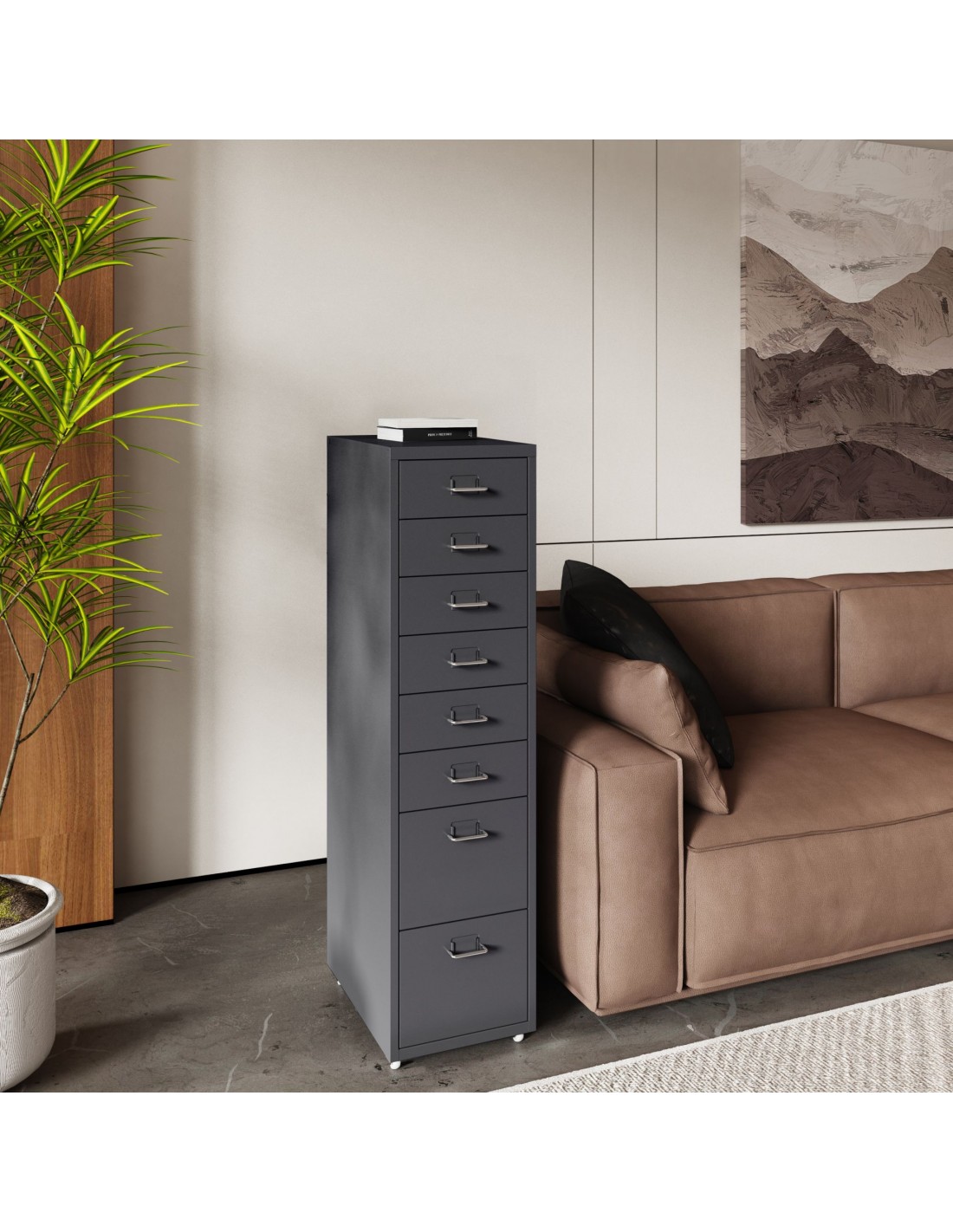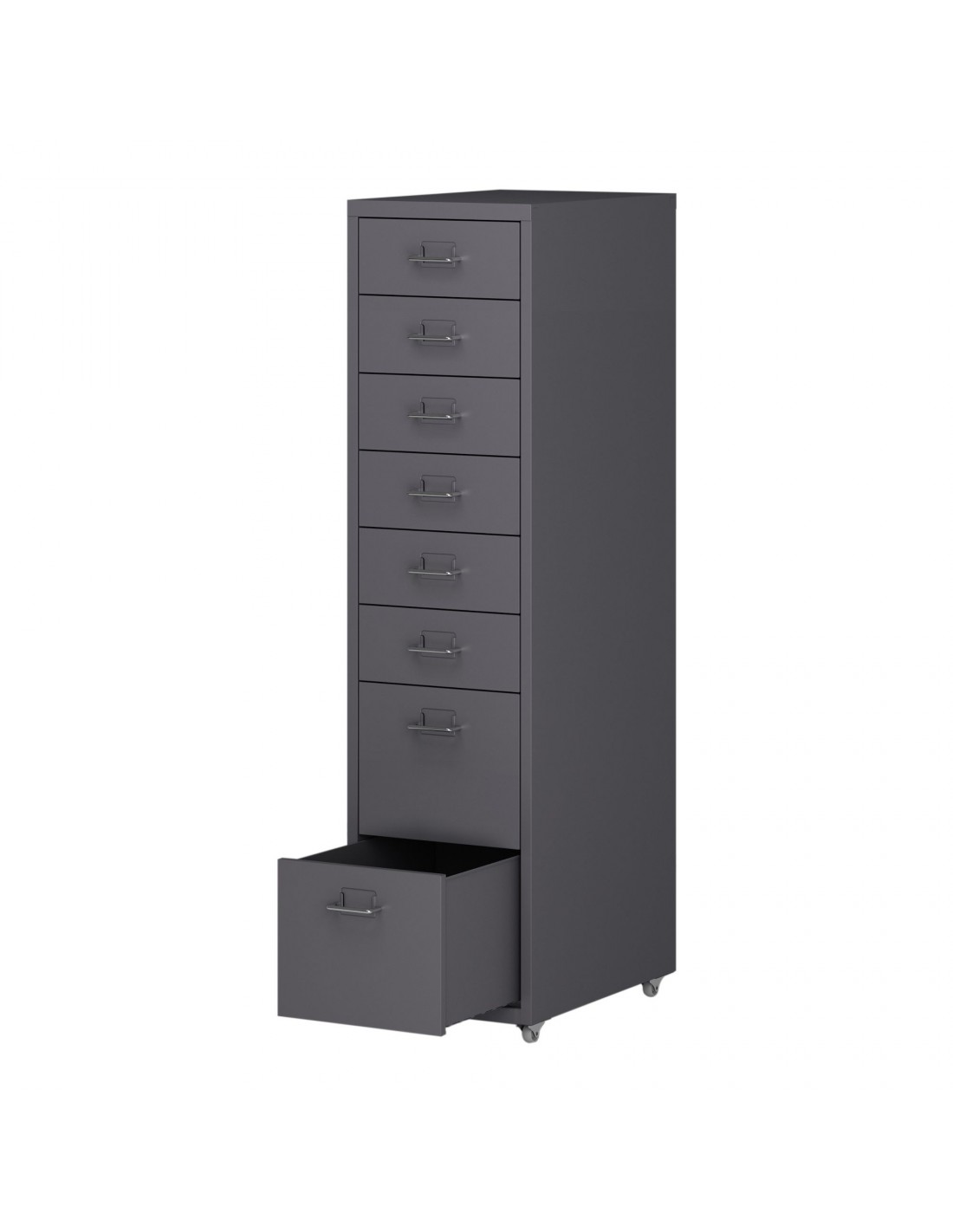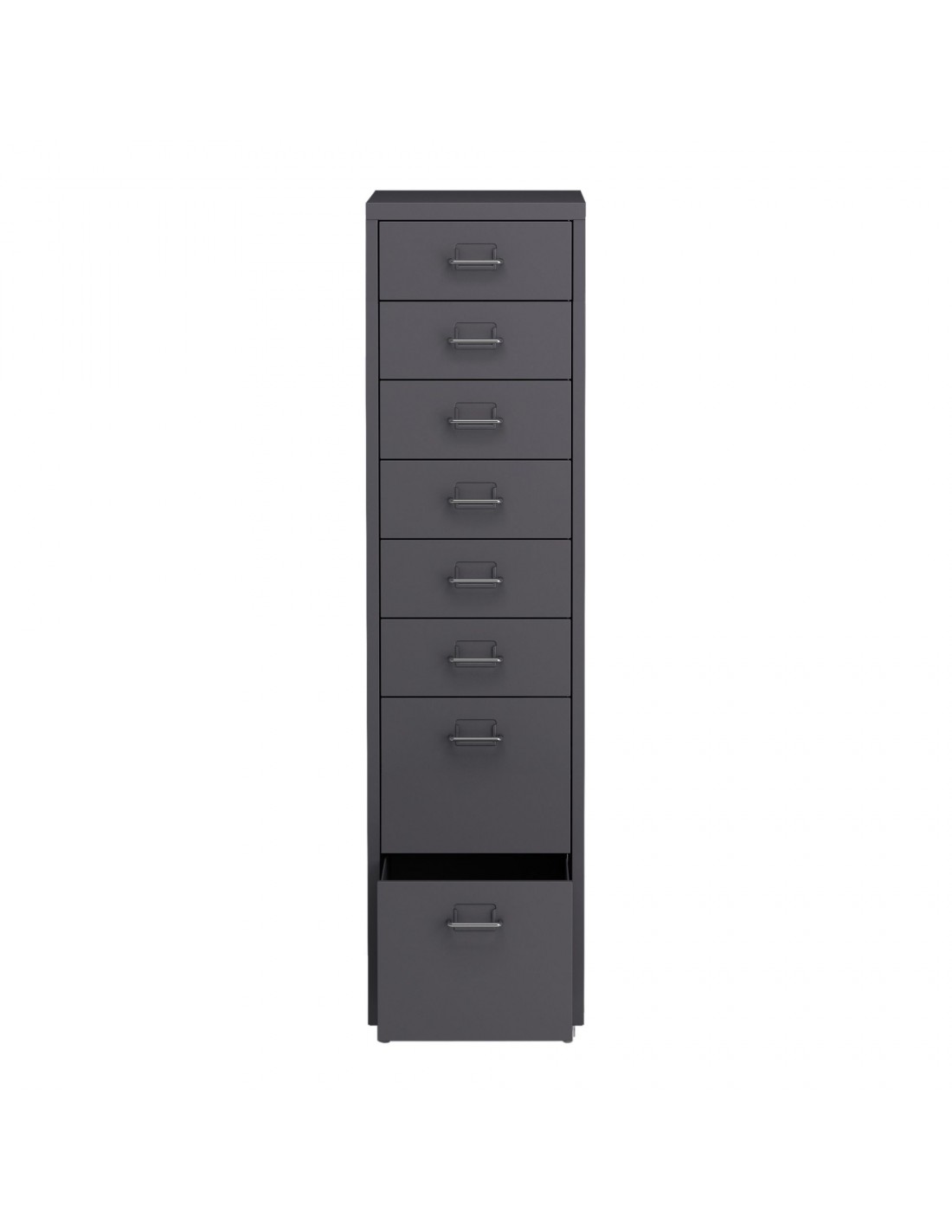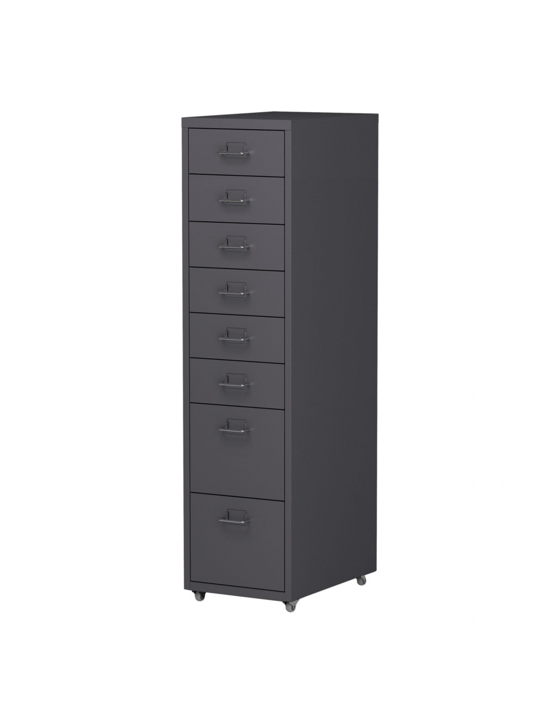 Koka skuffesektion med 8 skuffer, udført i et design af mørkegrå lakeret metal. Skuffesektionen måler 109 cm i højden og 28 x 41 cm i bredde og dybde.