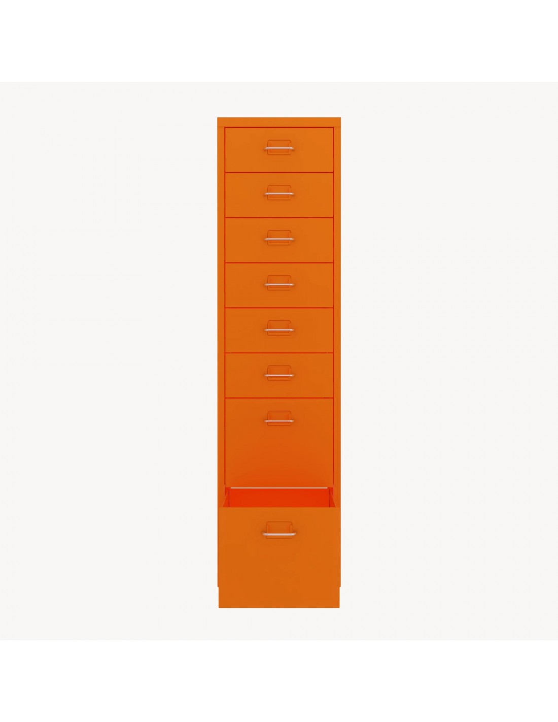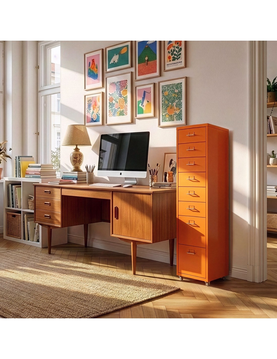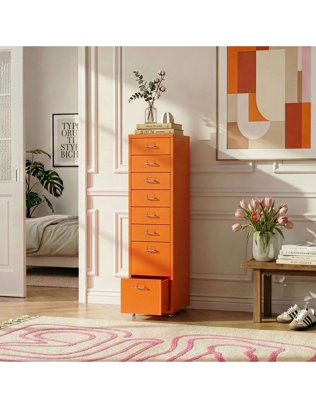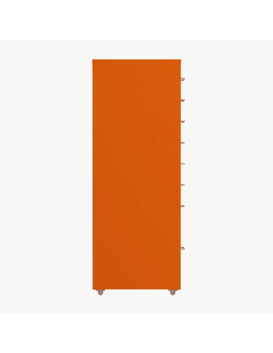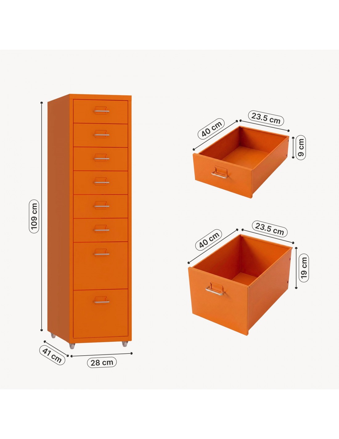 Koka skuffesektion med 8 skuffer, udført i et design af orange lakeret metal. Skuffesektionen måler 109 cm i højden og 28 x 41 cm i bredde og dybde.