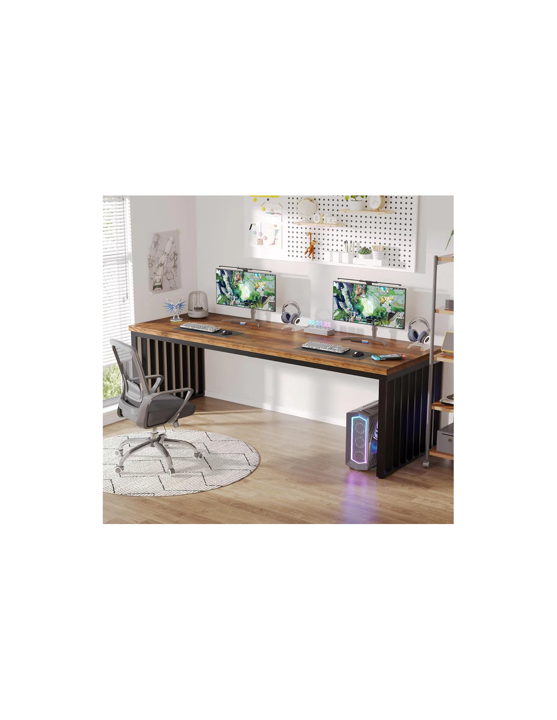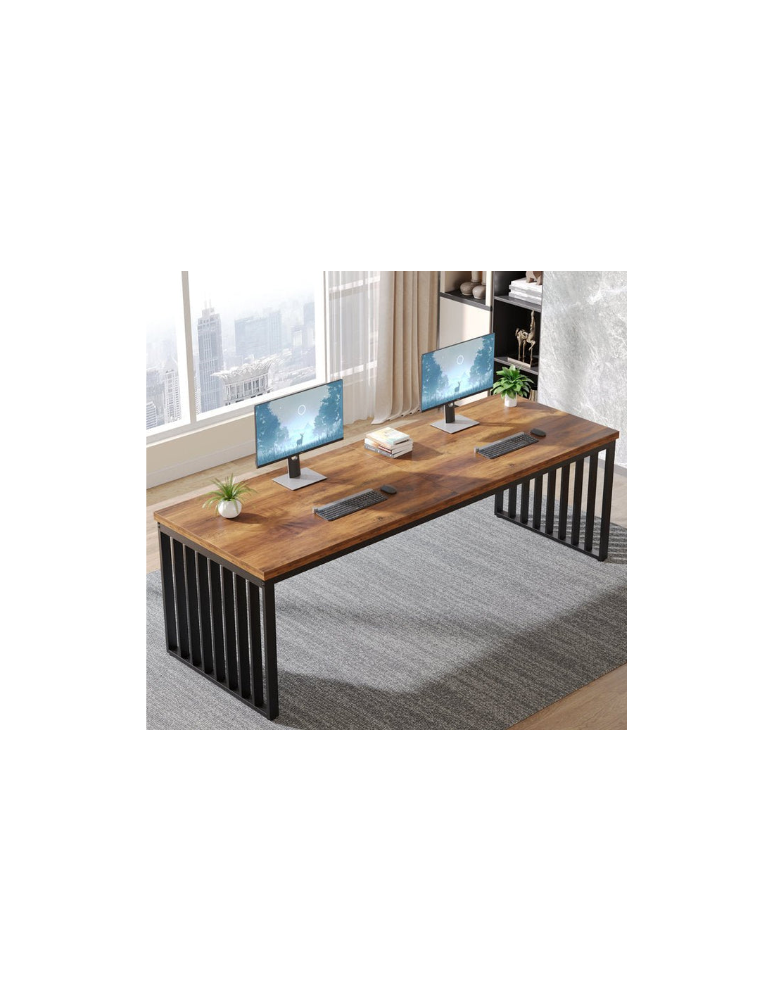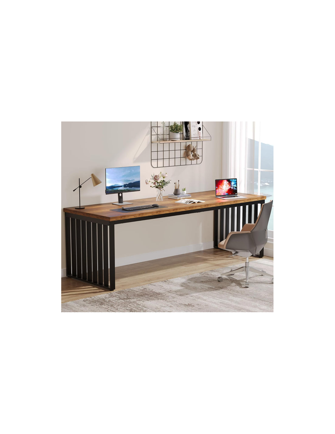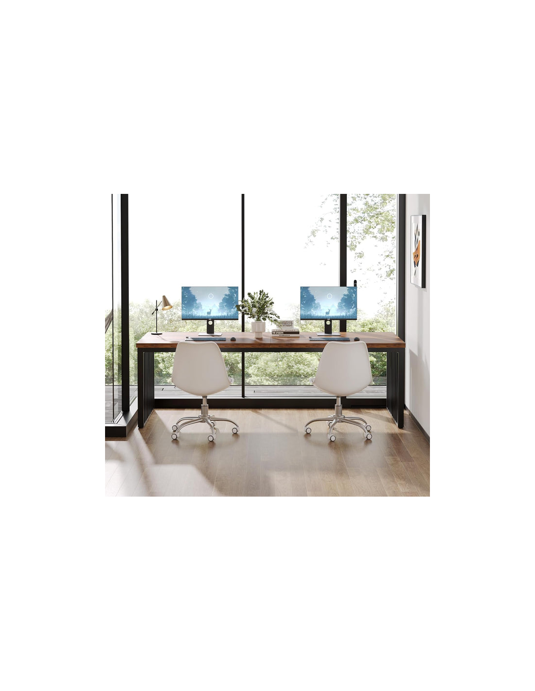 Skrivebord udført i et design af sortlakeret metal og naturbrun møbelplade. Skrivebordet måler 75 cm i højden og 180 x 60 cm i bredde og dybde.