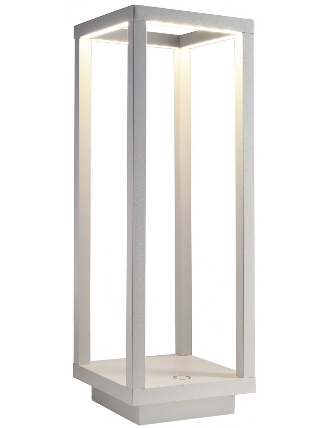 Udendørs trådløs opladelig bordlampe udført i et moderne design af hvidlakeret aluminium. Lampen måler 29,2 cm i højden og oplades via usb stik/ladestation (inkl.). Lampen anvender 1 x 2,2W lyskilde, der giver et hyggeligt lys når mørket falder på. Lampen er dæmpbar og justeres via touchknap. Lampen holder strøm i op til 10 timer, afhængig af opladning og temperatur.