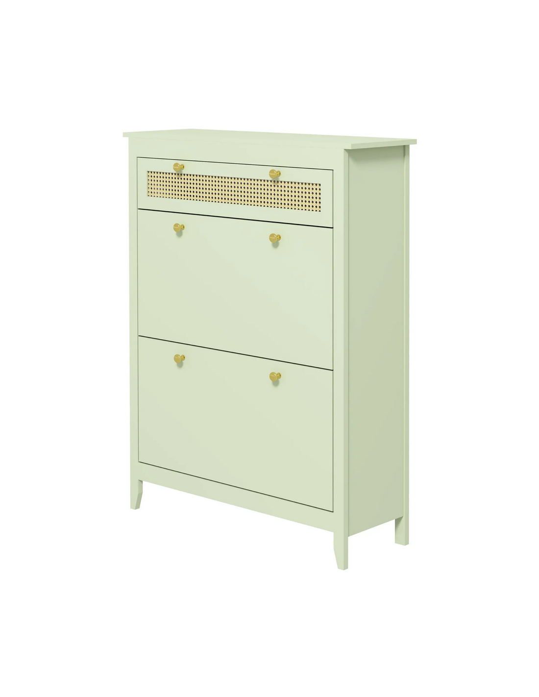 Skoskab udført i et design af grønmalet MDF og naturfarvet polyrattan med håndtag i messingfarvet metal. Skoskabet indeholder 3 skabslåger og måler 120 cm i højden og 88 x 30 cm i bredde og dybde.