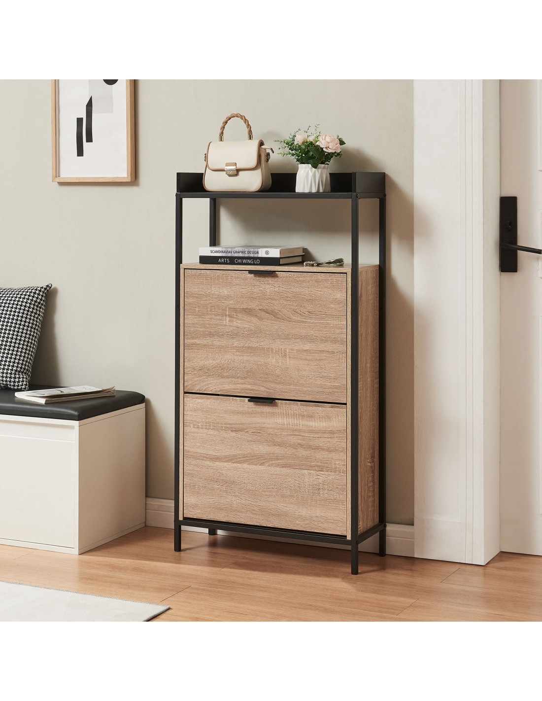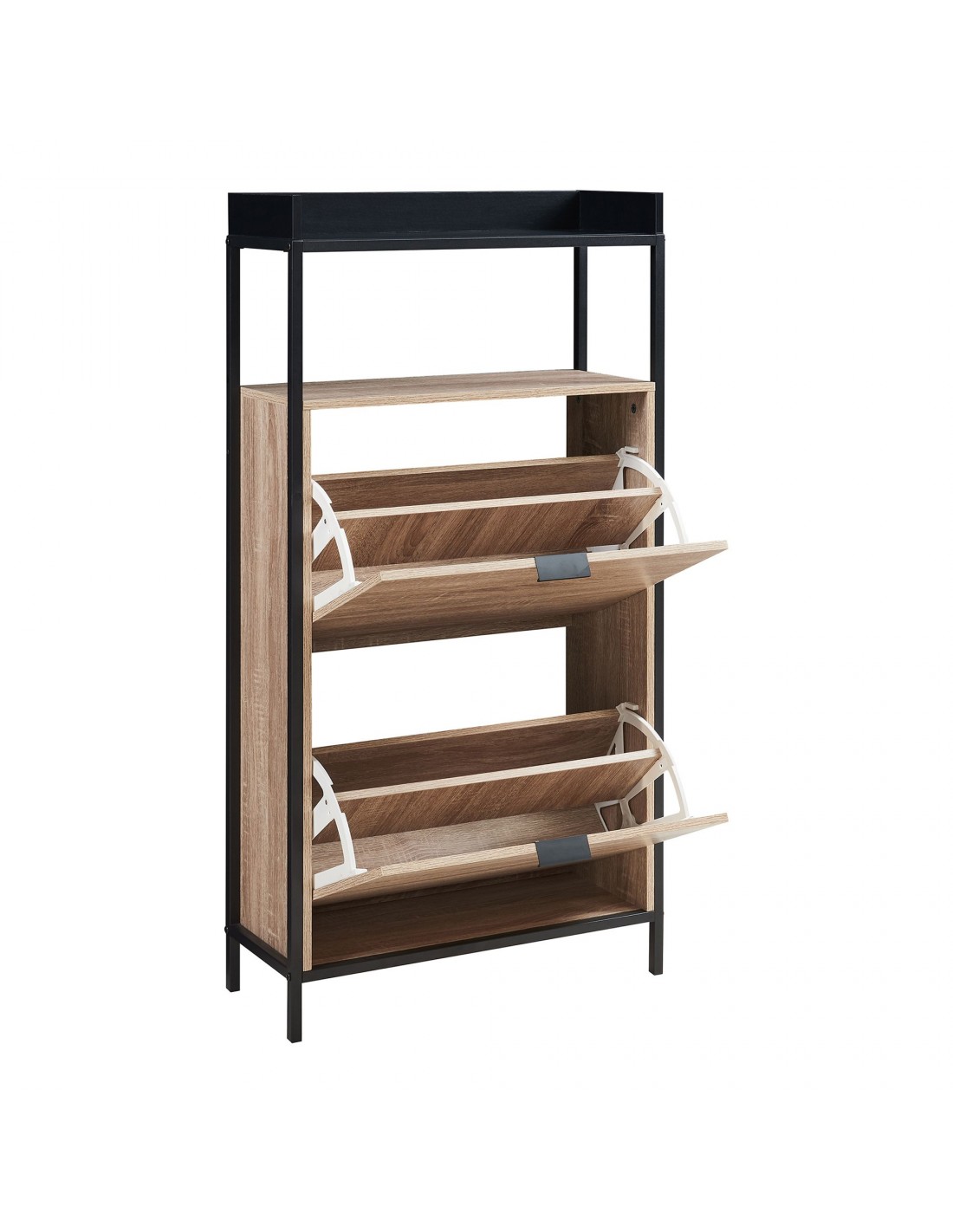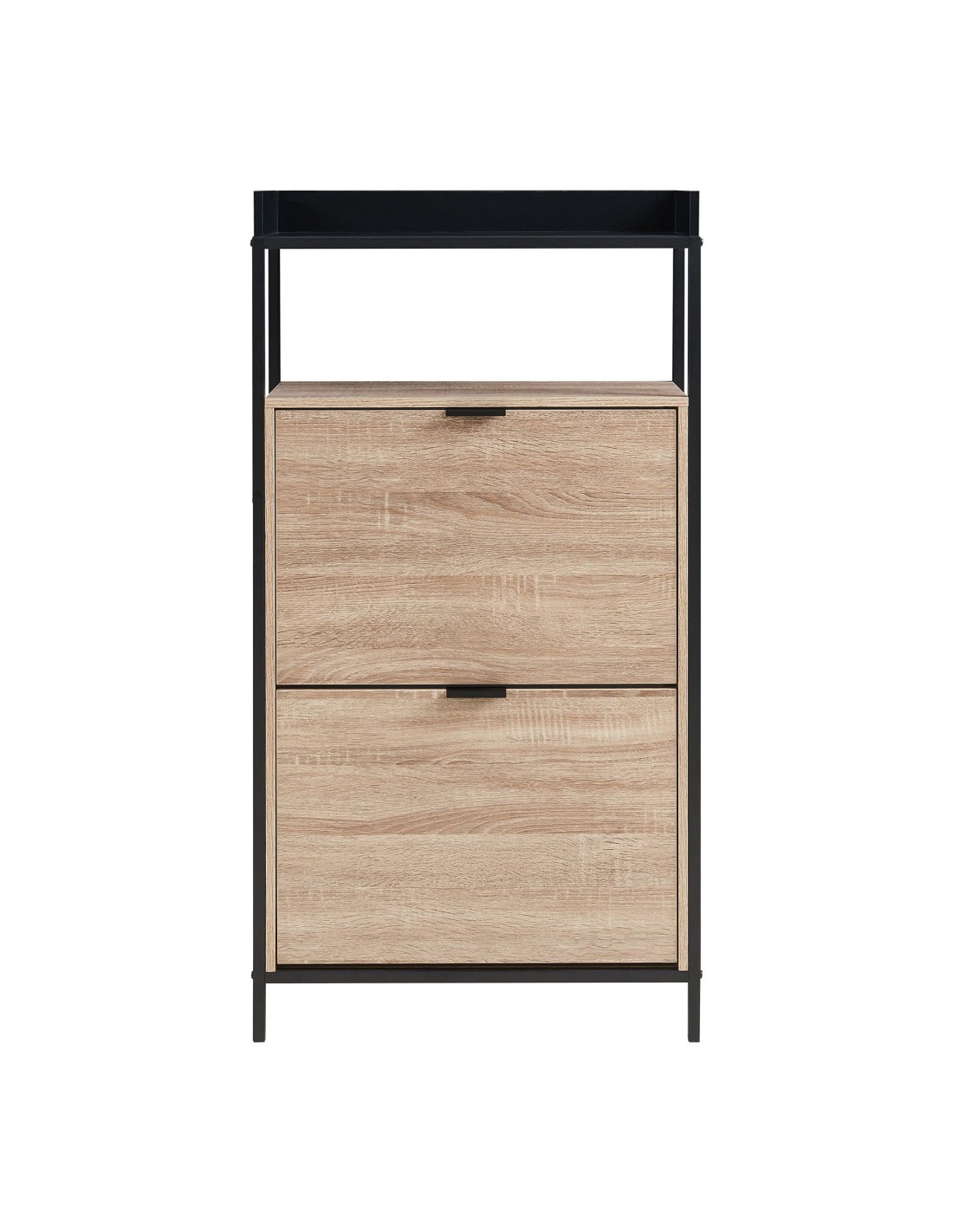 Skoskab udført i et design af sortlakeret metal og egetræsfarvet møbelplade. Skoskabet har 1 åbent hylderum og 2 skorum og måler 115,5 cm i højden og 60 x 23,5 cm i bredde og dybde.