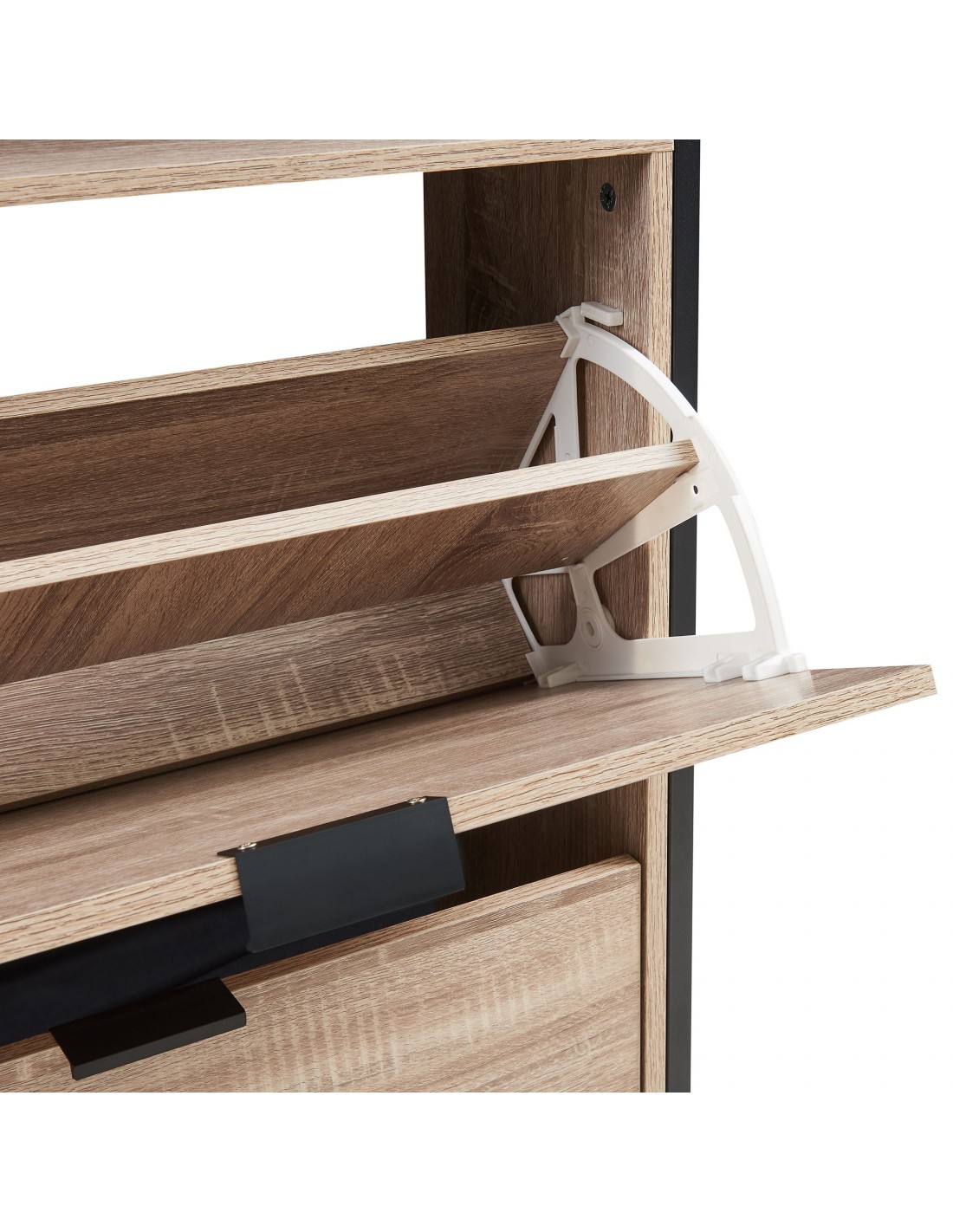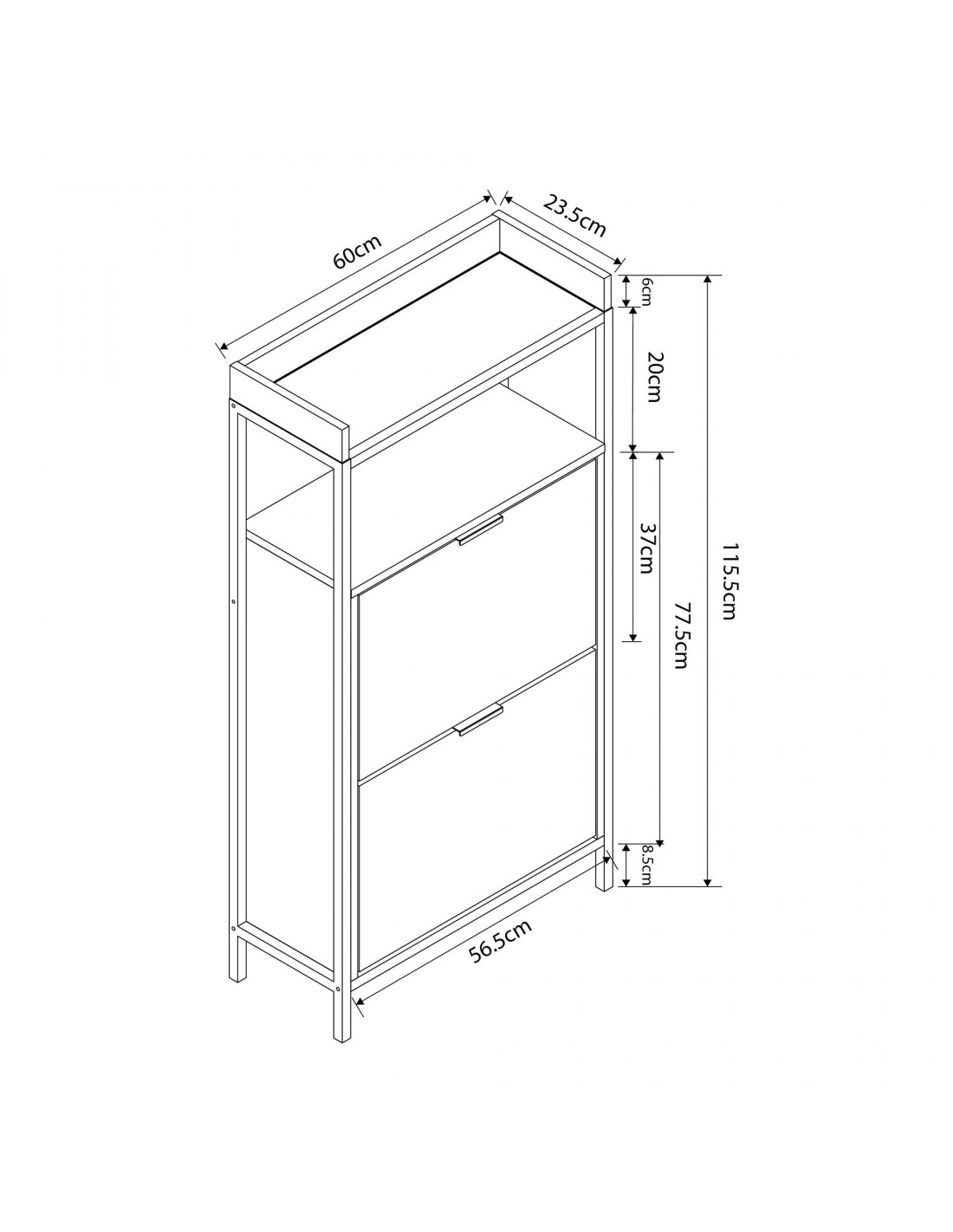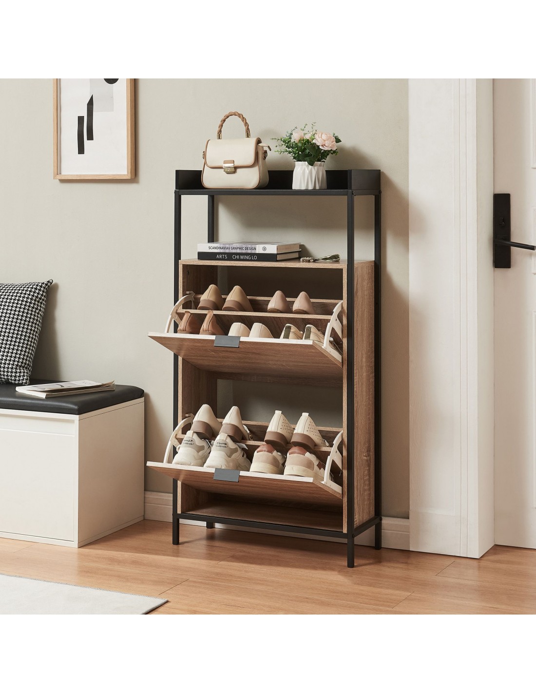 Skoskab udført i et design af sortlakeret metal og egetræsfarvet møbelplade. Skoskabet har 1 åbent hylderum og 2 skorum og måler 115,5 cm i højden og 60 x 23,5 cm i bredde og dybde.
