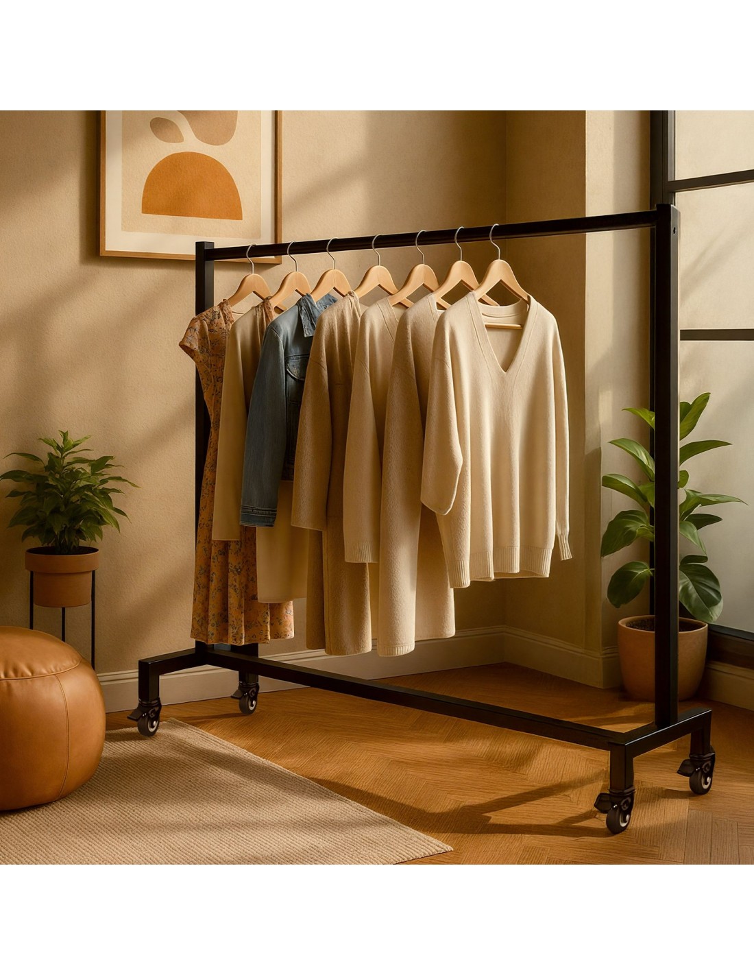 Garderobe stativ på hjul udført i et design af sortlakeret metal. Stativet måler 120 cm i højden og 150 x 38 cm i bredde og dybde.