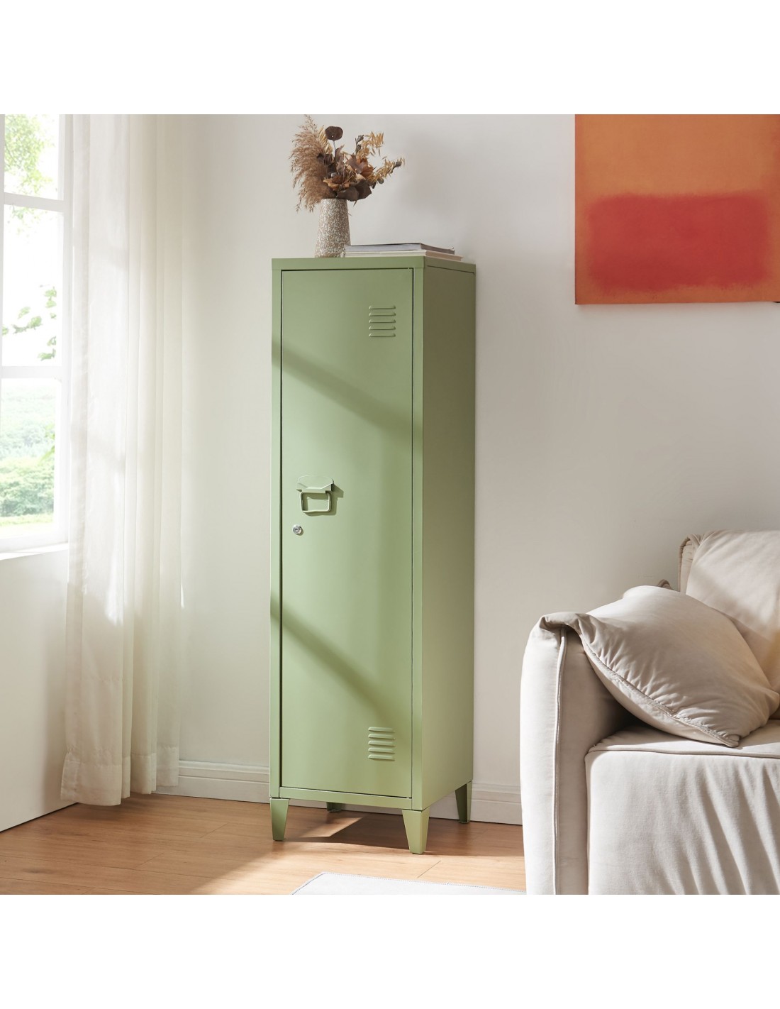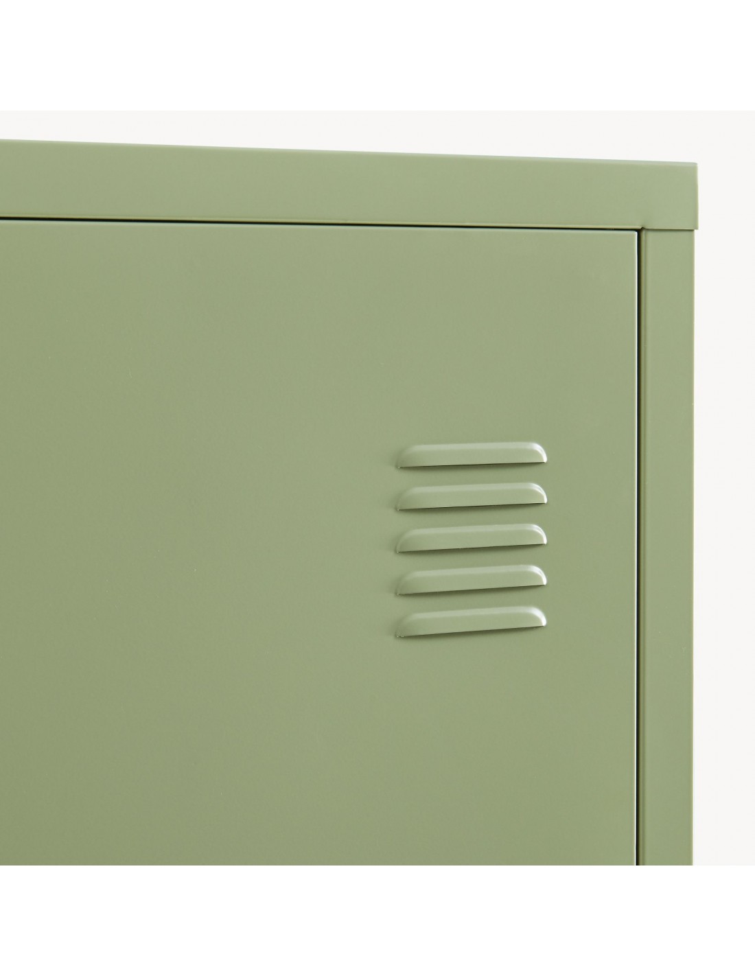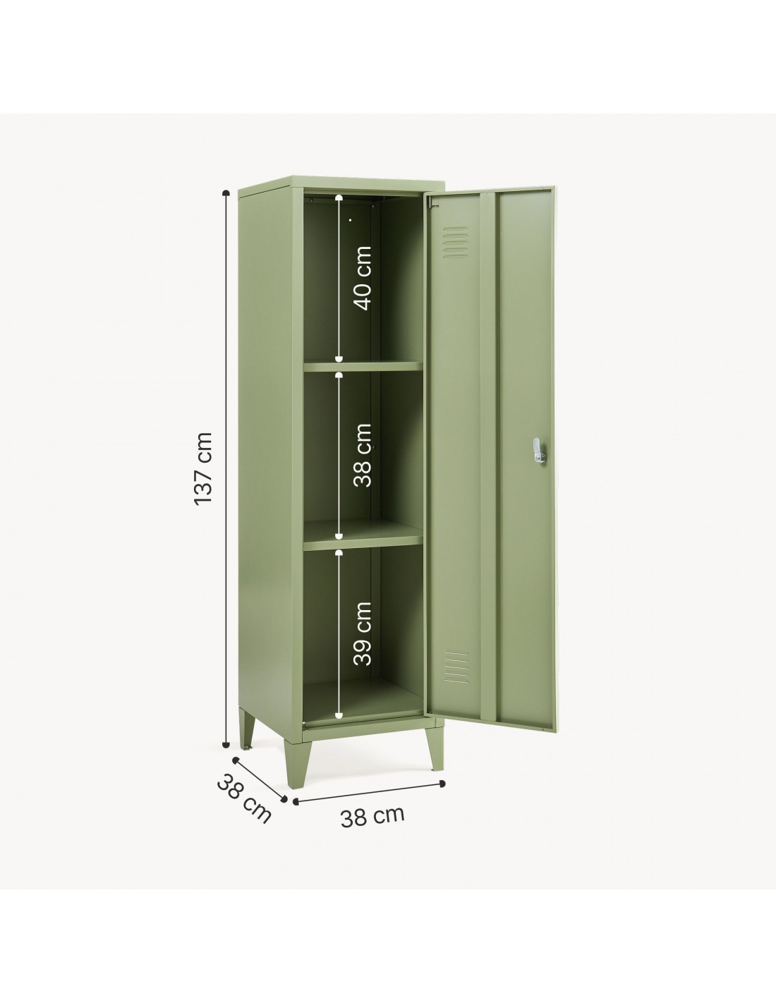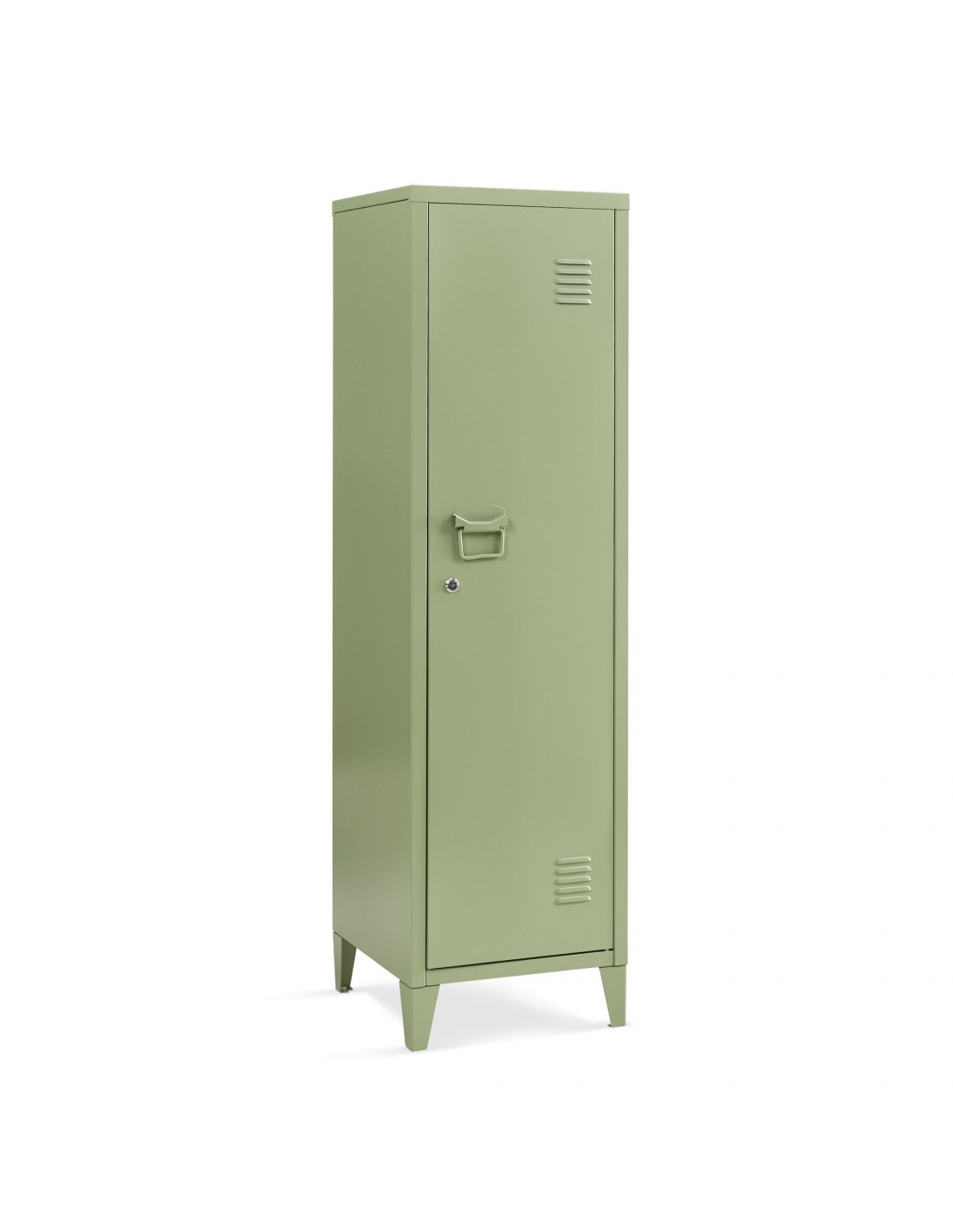 Kurik garderobeskab udført i et design af olivengrøn lakeret metal. Garderobeskabet måler 137 cm i højden og 38 x 38 cm i bredde og dybde og indeholder 3 hylderum.