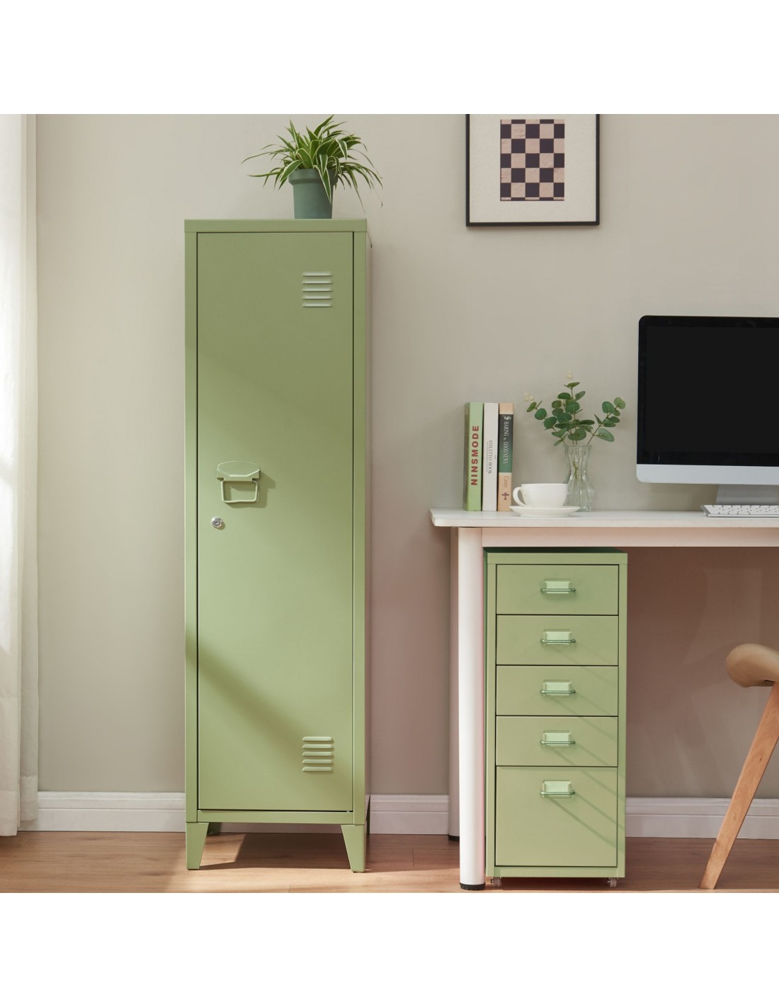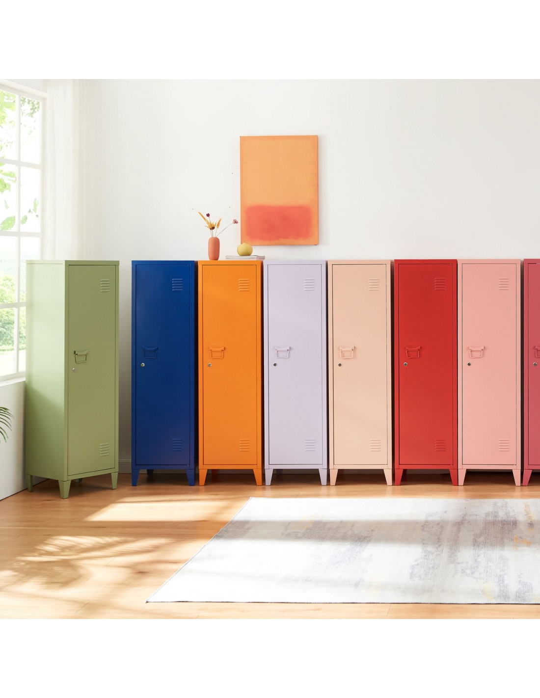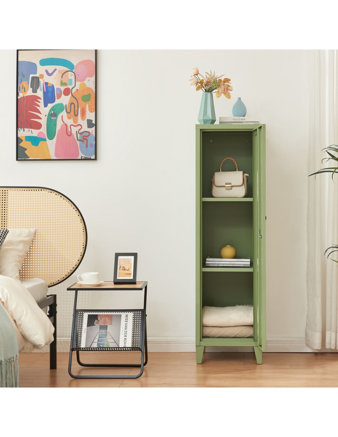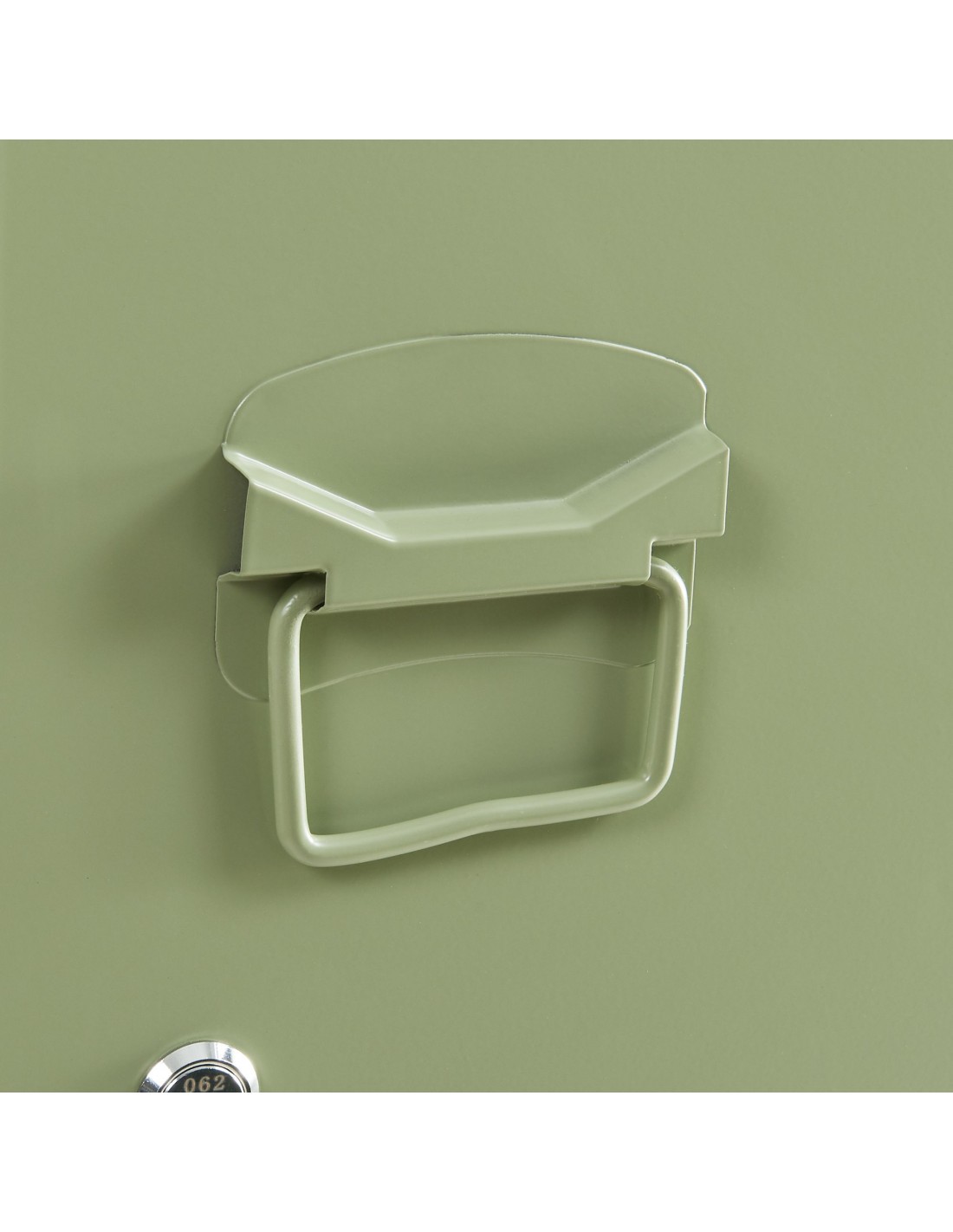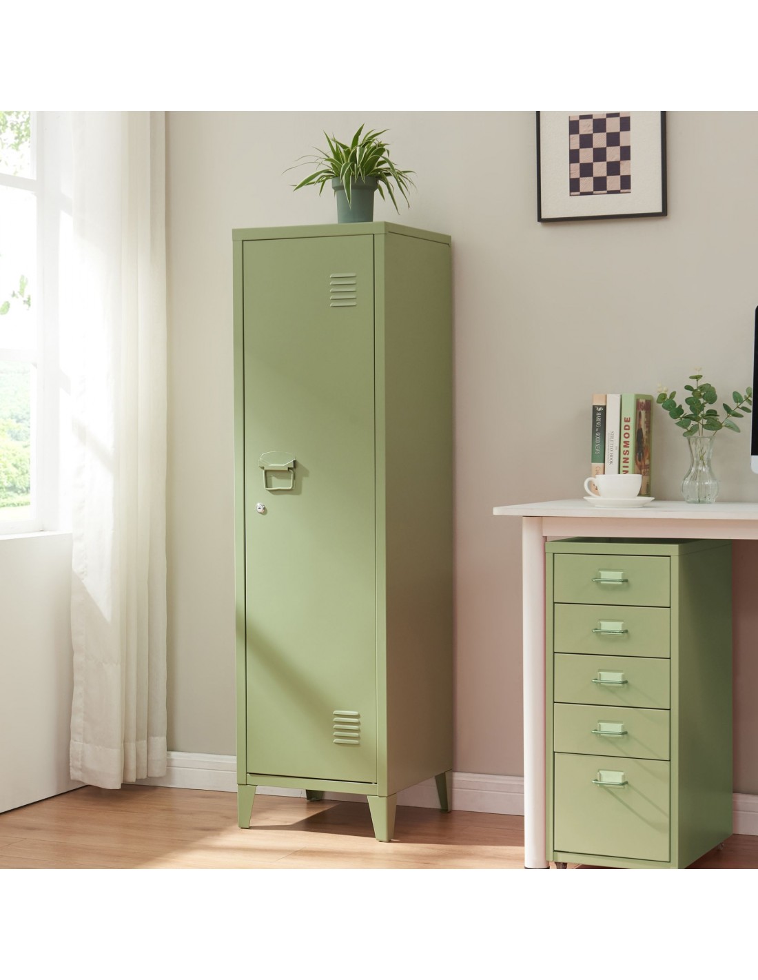 Kurik garderobeskab udført i et design af olivengrøn lakeret metal. Garderobeskabet måler 137 cm i højden og 38 x 38 cm i bredde og dybde og indeholder 3 hylderum.