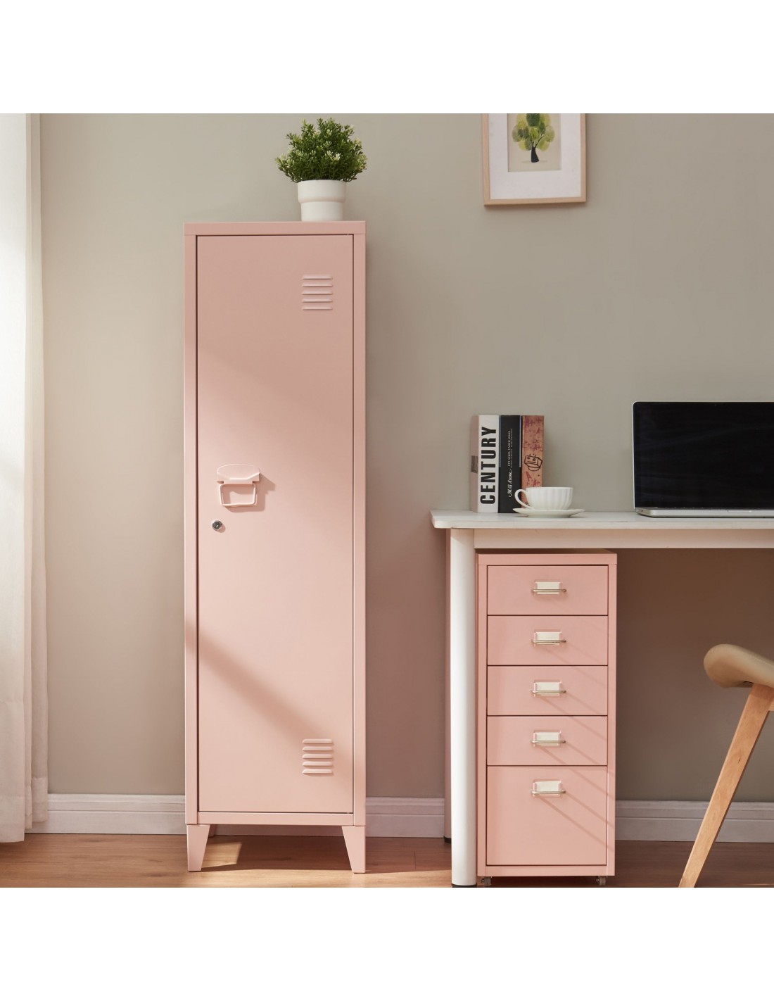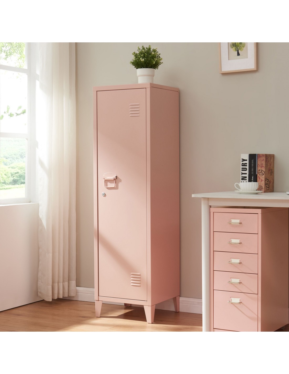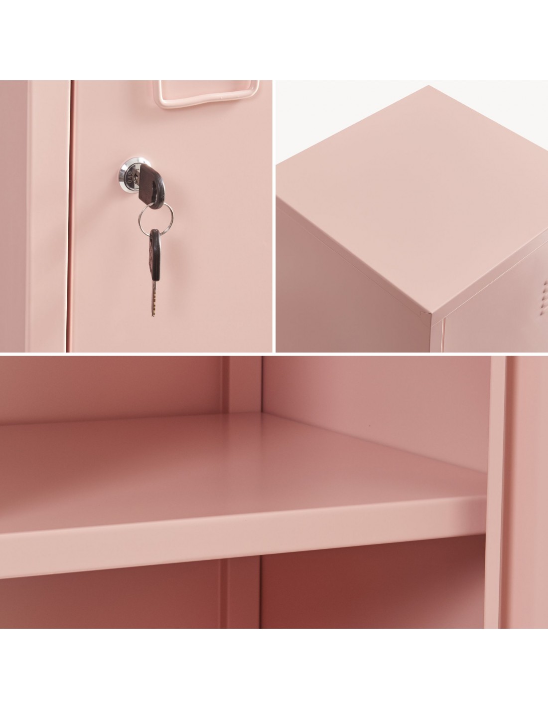 Kurik garderobeskab udført i et design af lys pink lakeret metal. Garderobeskabet måler 137 cm i højden og 38 x 38 cm i bredde og dybde og indeholder 3 hylderum.