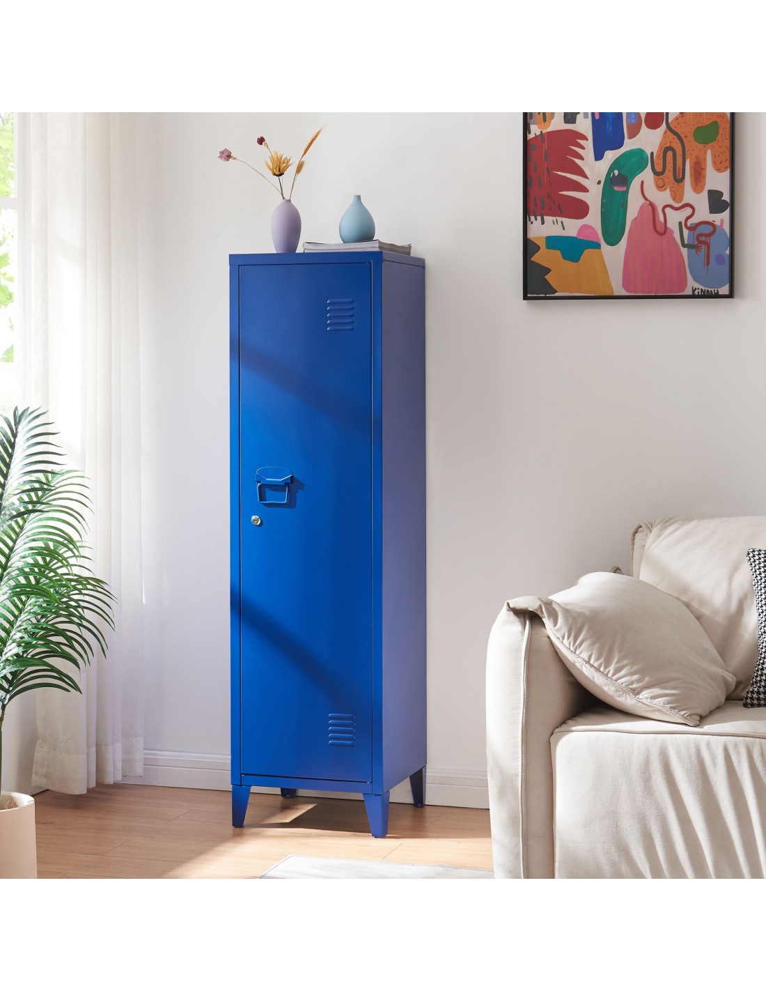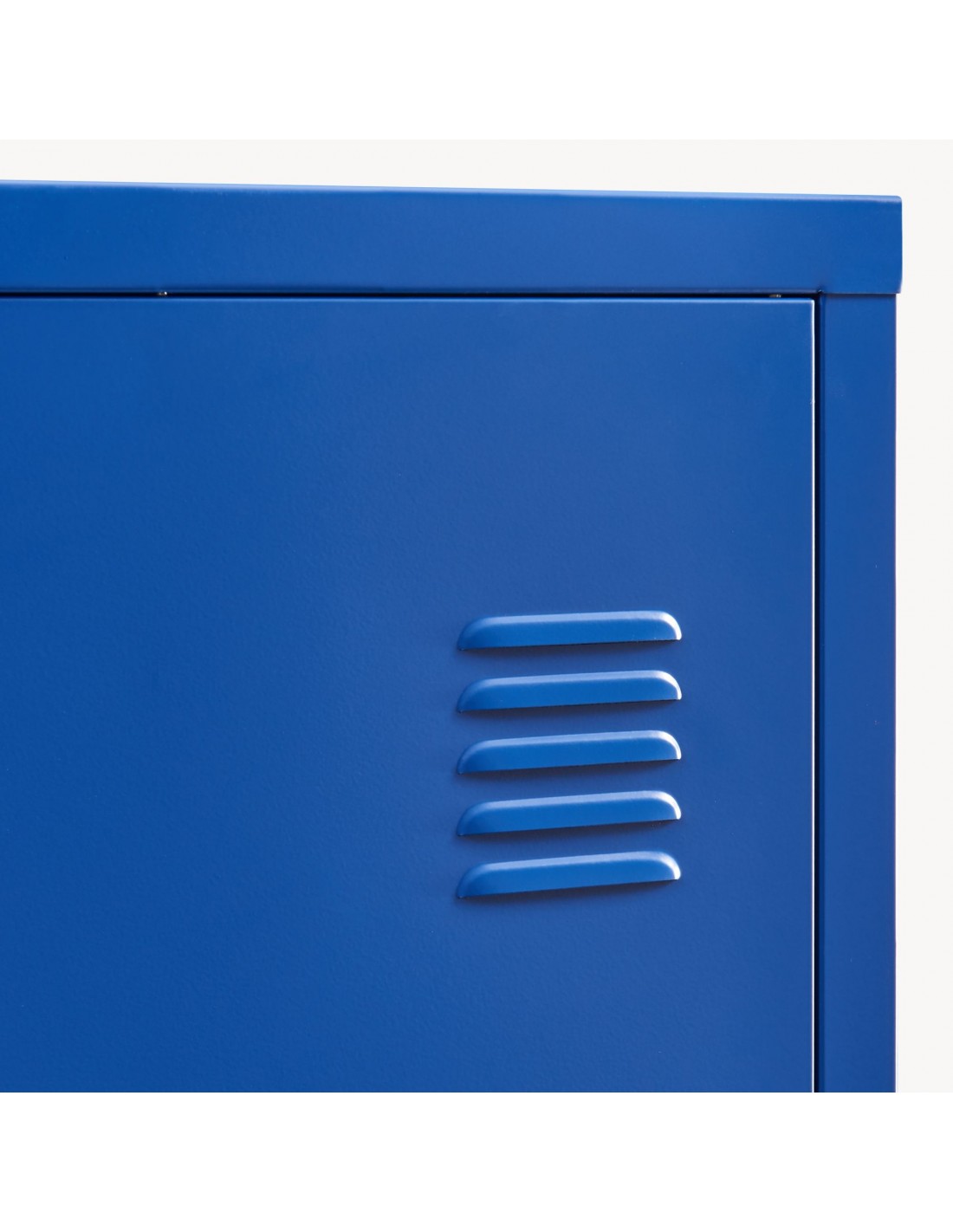 Kurik garderobeskab udført i et design af blålakeret metal. Garderobeskabet måler 137 cm i højden og 38 x 38 cm i bredde og dybde og indeholder 3 hylderum.