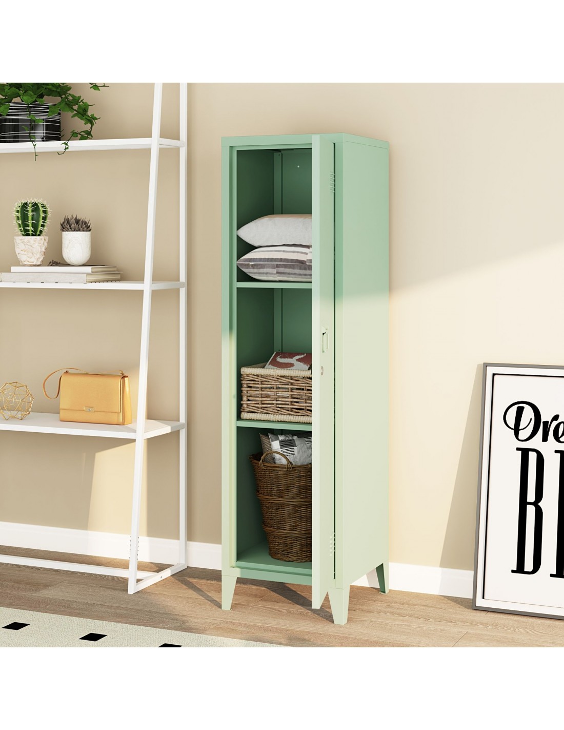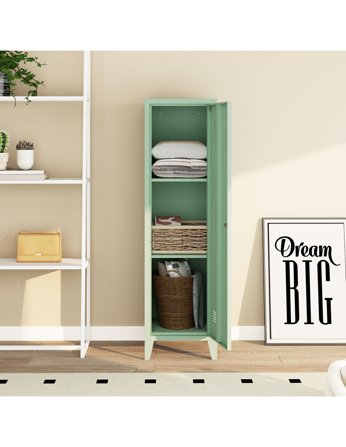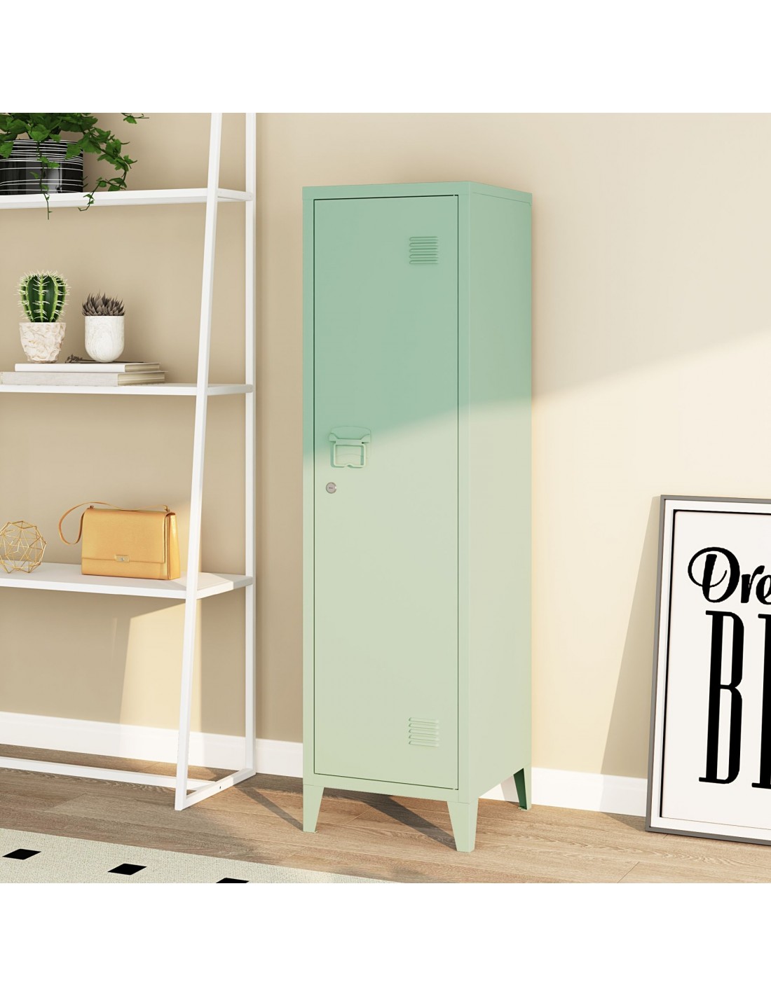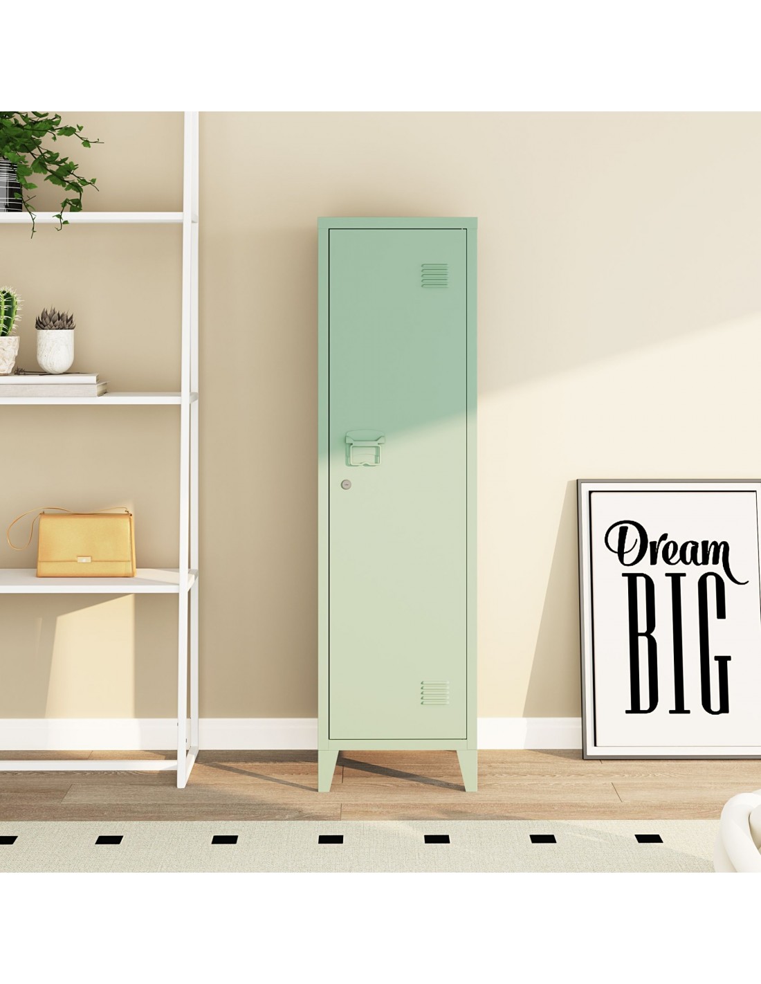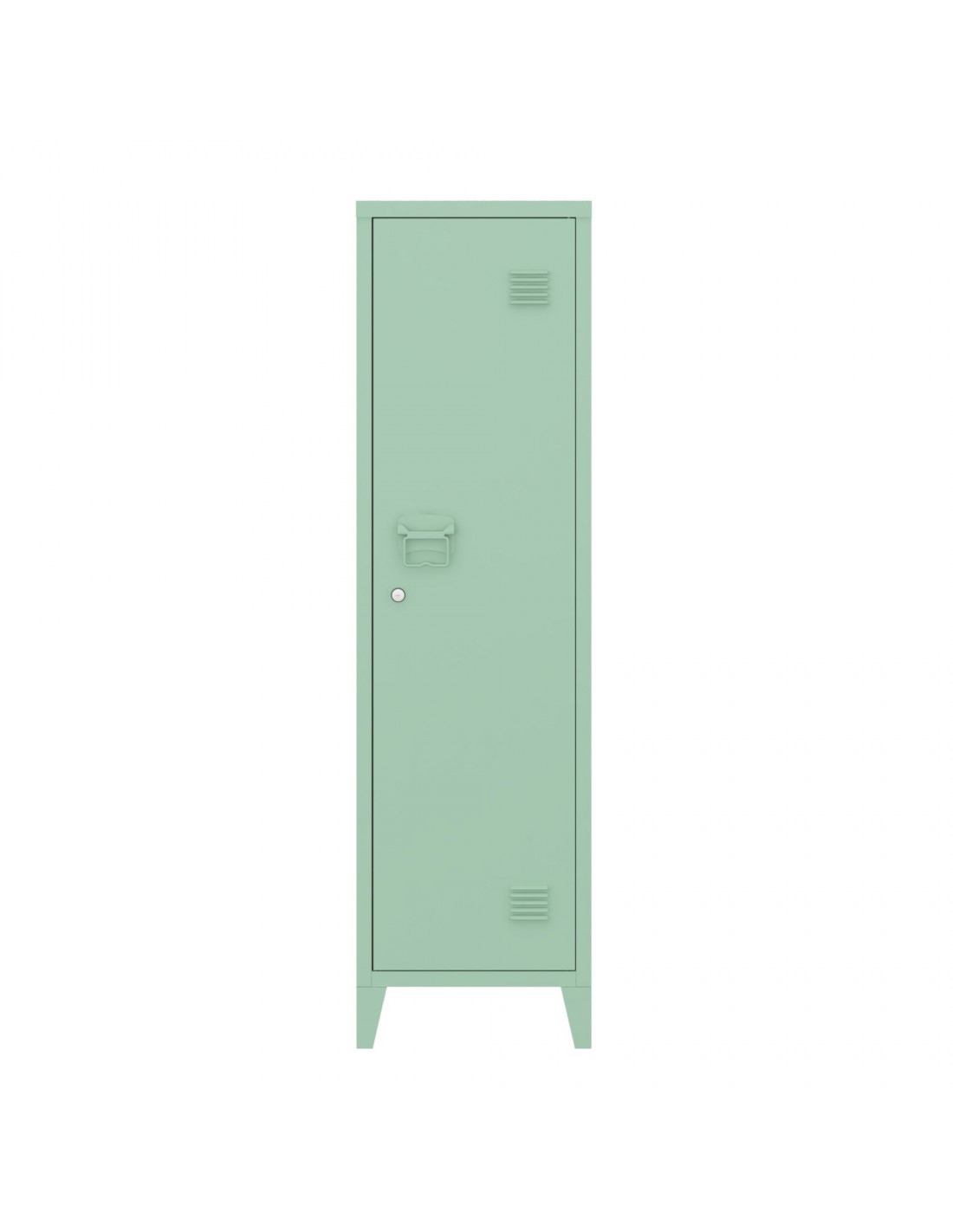 Kurik garderobeskab udført i et design af pastelgrøn lakeret metal. Garderobeskabet måler 137 cm i højden og 38 x 38 cm i bredde og dybde og indeholder 3 hylderum.