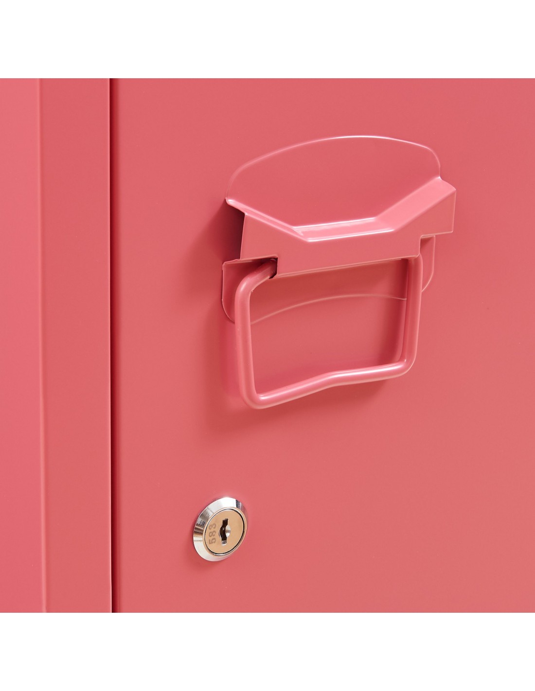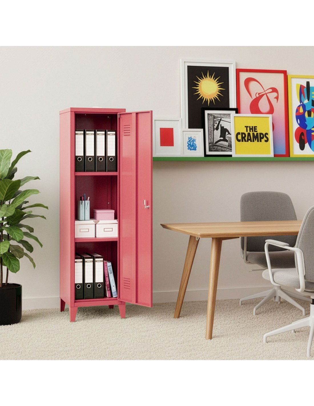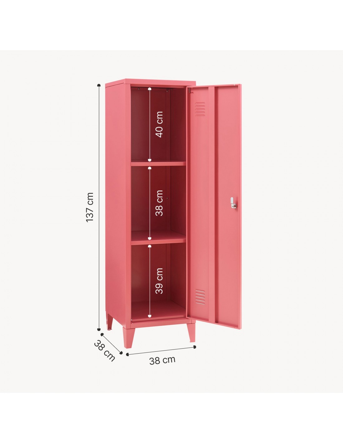 Kurik garderobeskab udført i et design af vandmelonrød lakeret metal. Garderobeskabet måler 137 cm i højden og 38 x 38 cm i bredde og dybde og indeholder 3 hylderum.